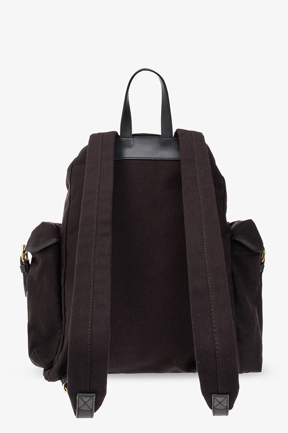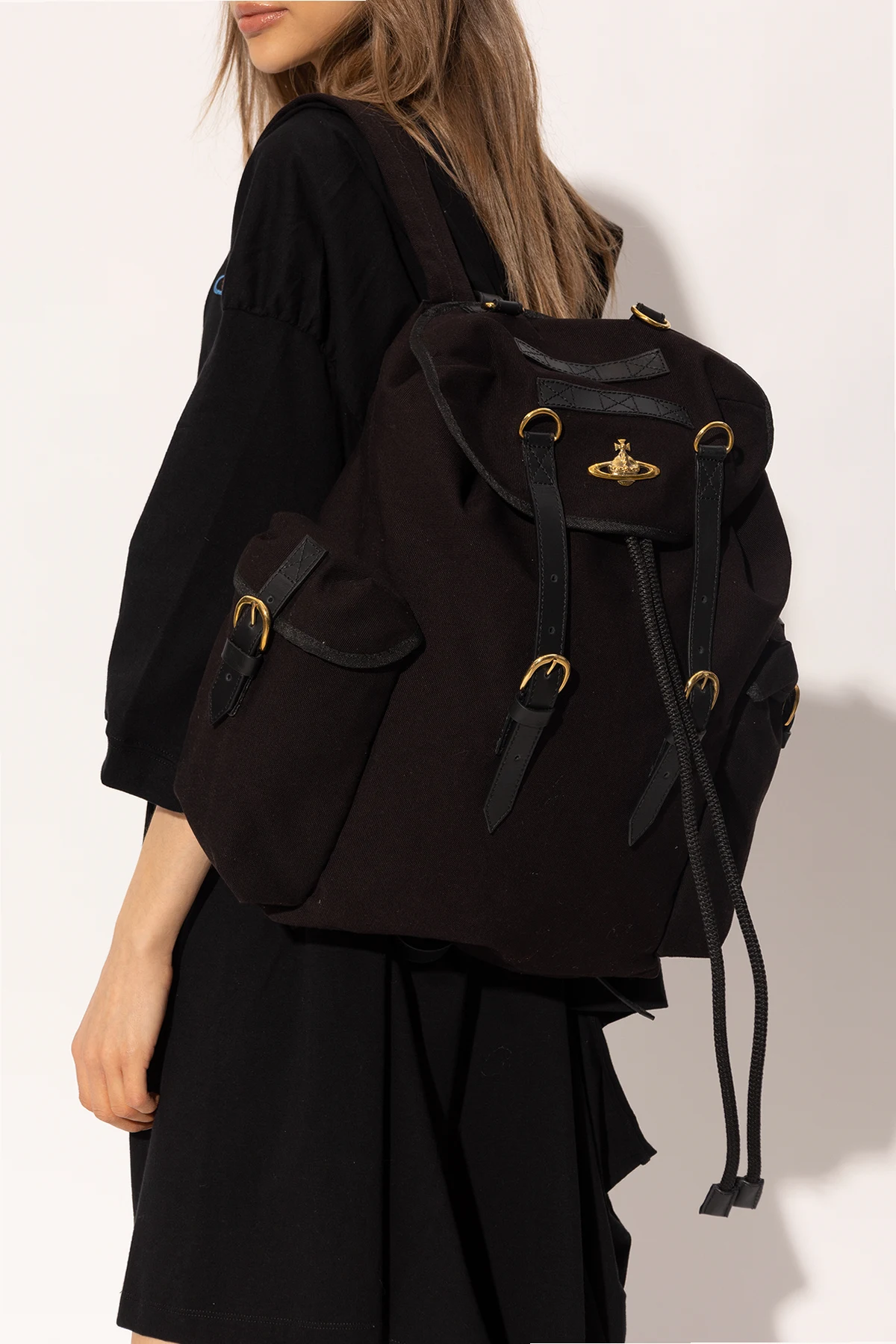 Black backpack from Vivienne Westwood. Made of recycled materials, this design features a buckle strap fastening, logo detail, two slip pockets, half-round handle, adjustable shoulder strap, gold-tone metal hardware and one internal compartment with drawstrings and one zip pocket. Handmade in Kenya.