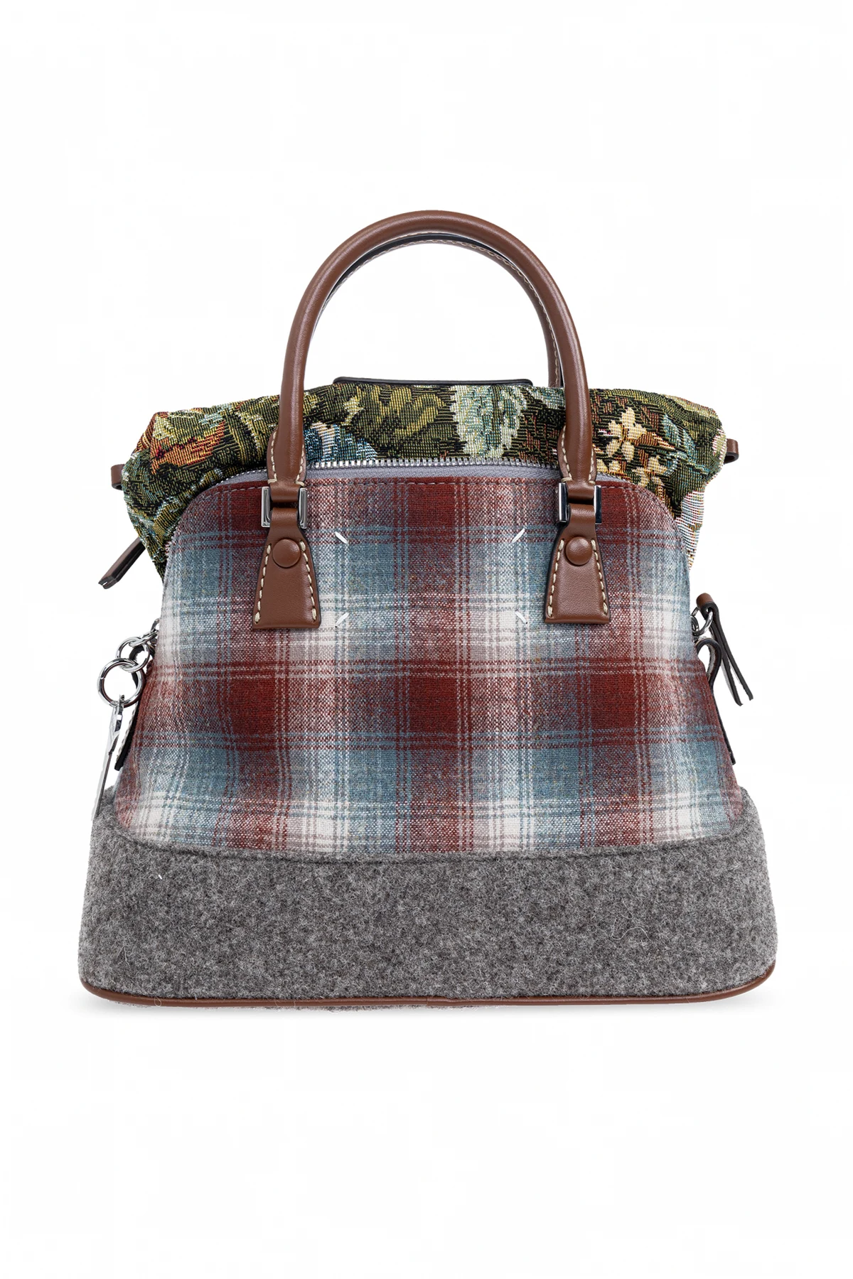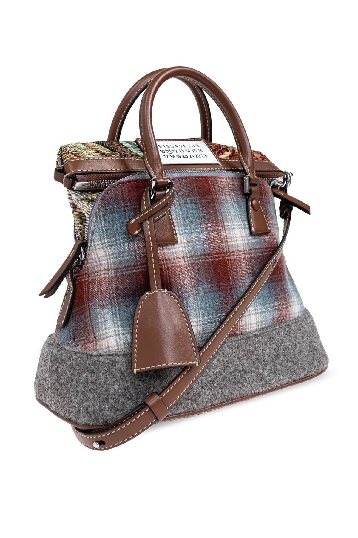 Introducing the `5AC` Shoulder Bag by the distinguished Maison Margiela, a harmonious blend of traditional craftsmanship and avant-garde aesthetics. This exquisite piece showcases a vibrant plaid pattern in red, blue, and white, intricately woven to create a mesmerizing multicolor effect. The base of the bag contrasts in a light grey hue, adding a sophisticated layer to its appearance. Crafted with materials that evoke the luxurious texture of wool or thick woven fabric, the `5AC` bag exudes durability and elegance. Its solid handles and a long, adjustable shoulder strap in a rich brown tone offer versatile carrying options while enhancing its refined look. Gold and brass-toned metal hardware, including zippers, buckles, and rivets, underscore its premium quality. The presence of an internal label bearing the Maison Margiela logo signifies its authenticity and designer pedigree. Not merely a statement of style, the `5AC` bag is designed for functionality. It features a secure zip closure, a spacious main compartment, and two internal pockets—one slip and one zip—ensuring your essentials are organized and easily accessible. Why Purchase This Product? Exclusive design by Maison Margiela, blending classic and contemporary fashion elements. High-quality materials suggesting durability and luxury. Versatile carrying options with elegant brown leather straps. Functional interior with secure compartments for organization. Identifiable by Maison Margiela's signature logo, affirming its designer quality.