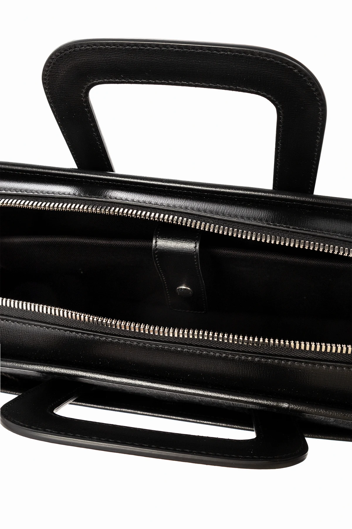 Black and grey briefcase from Gucci. Crafted from ‘GG Supreme’ canvas and trimmed with calf leather, this design fastens with a two-way zipper and showcases the ‘Interlocking G’ logo patch, external pockets with magnetic snaps on the front and back, silver-tone metal hardware, two extendible handles, detachable and adjustable shoulder strap, silver-tone metal elements and one internal compartment with a laptop sleeve.
