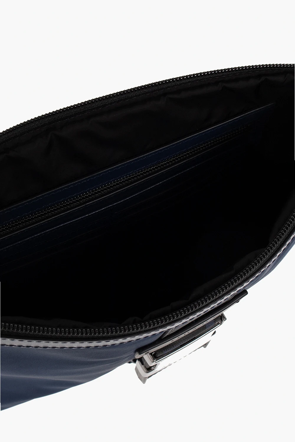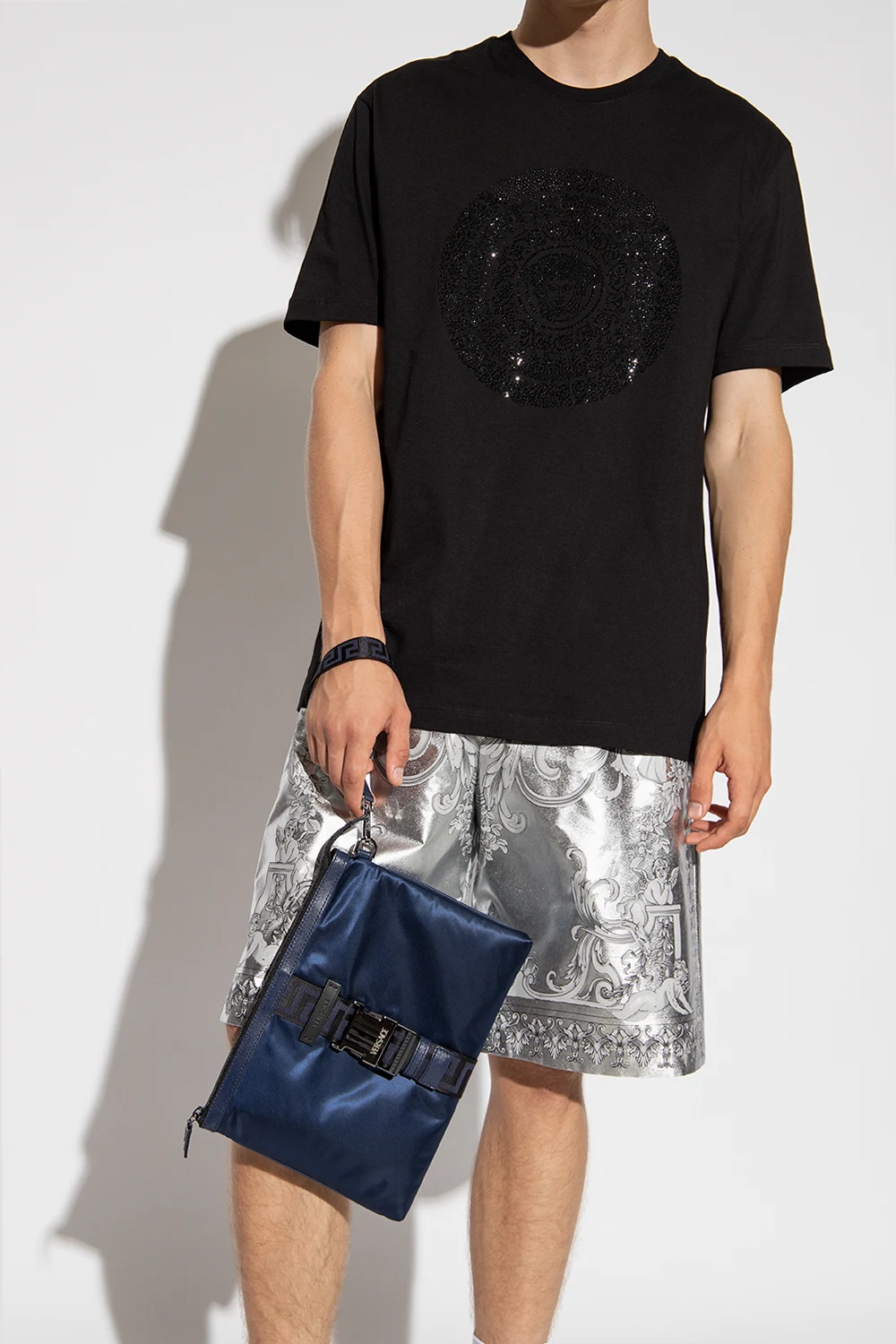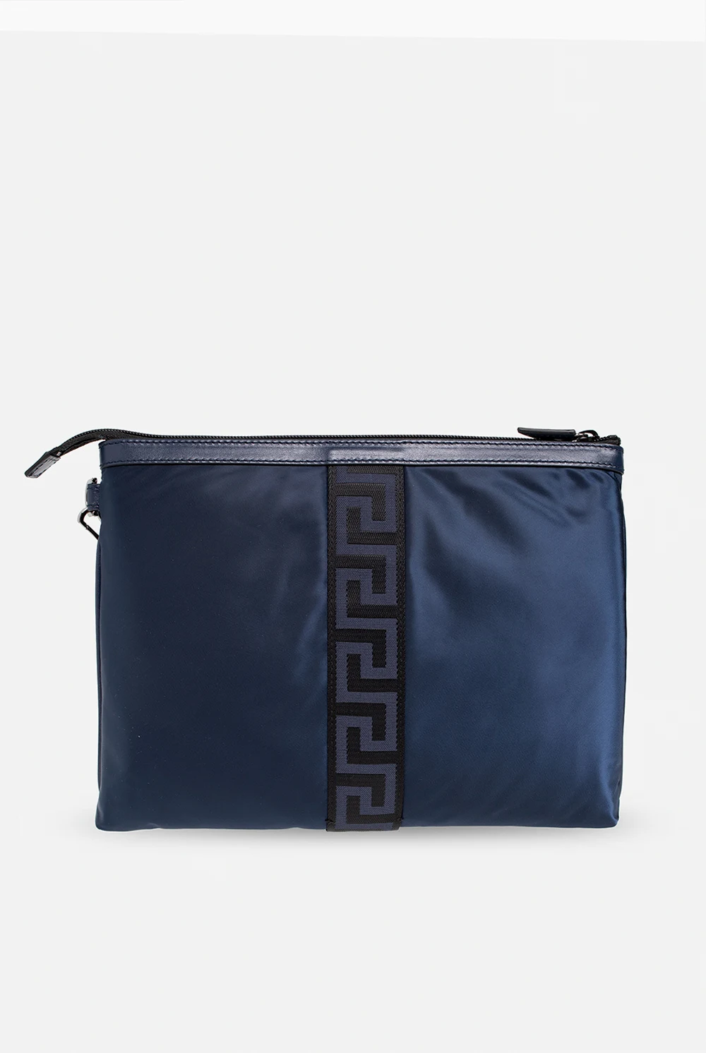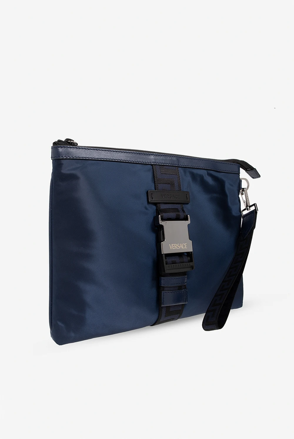 Navy blue satin handbag from Versace. Trimmed with calf leather, this item features a zip fastening, a frontal strap with a black and navy blue ‘Greca’ buckle, a short and detachable wrist strap, silver-tone metal elements and one zip pocket and six card slots inside.