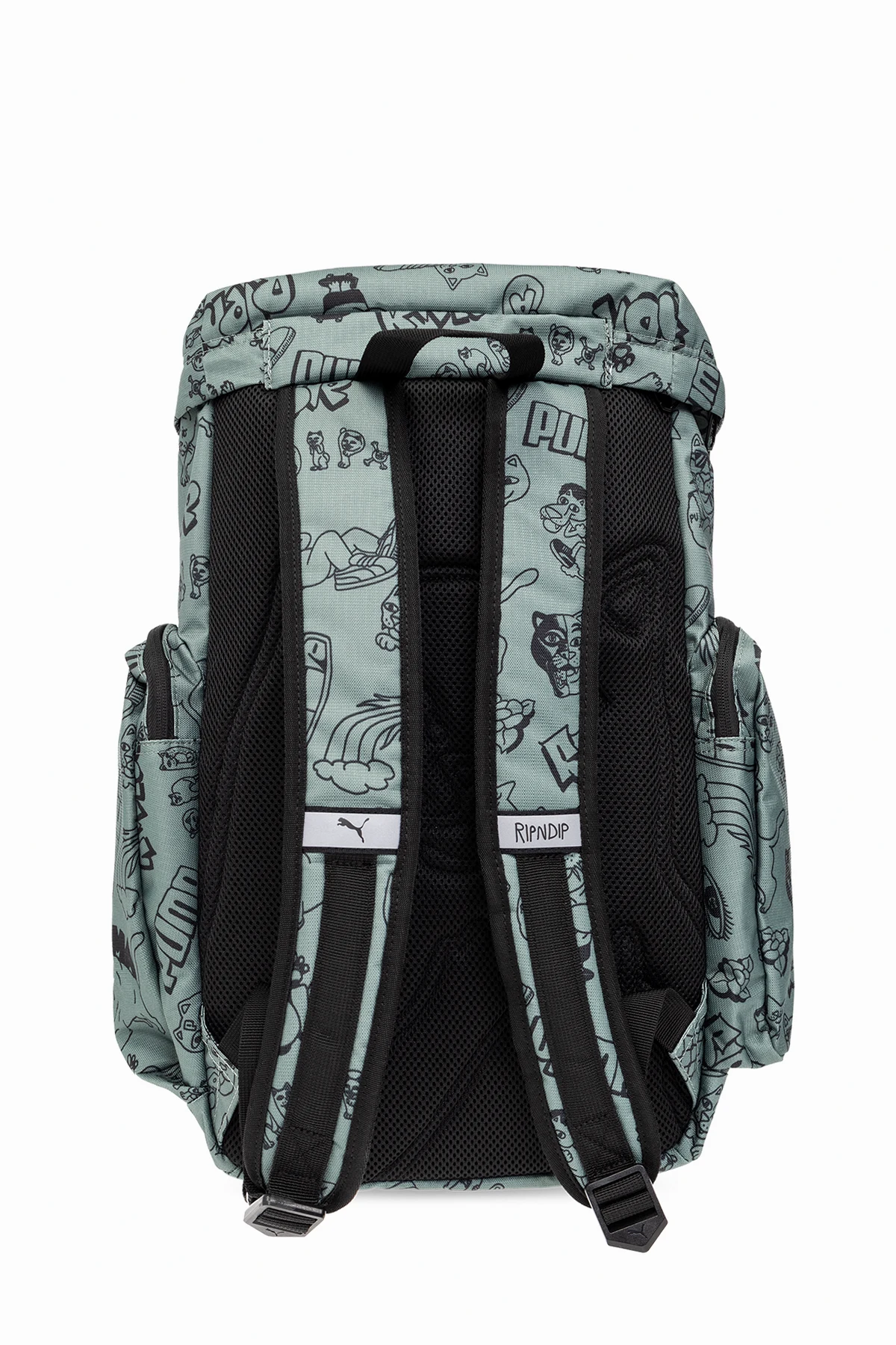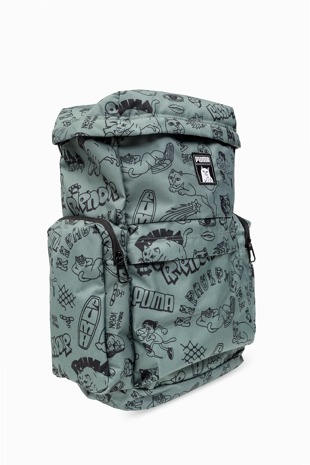 Black and greenish grey backpack from Puma x RIPNDIP. Fastened with a two-way zip, this model features a logo pattern, logo patch, three zip pockets, half-round handle, adjustable shoulder straps, black metal hardware and one internal compartment with one slip pocket.