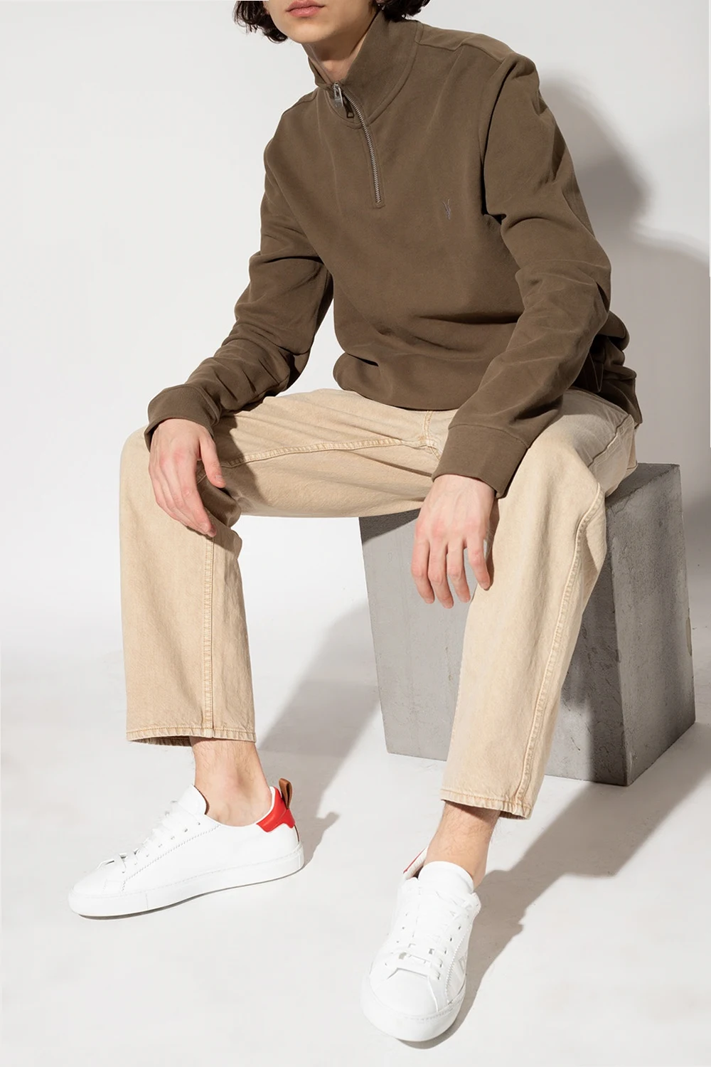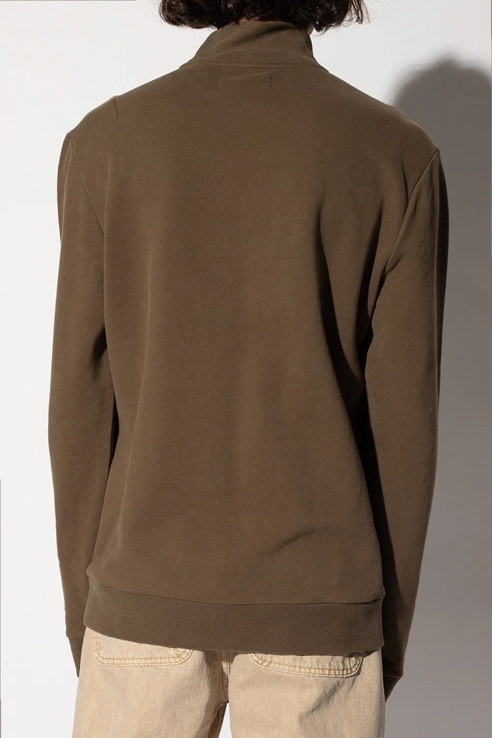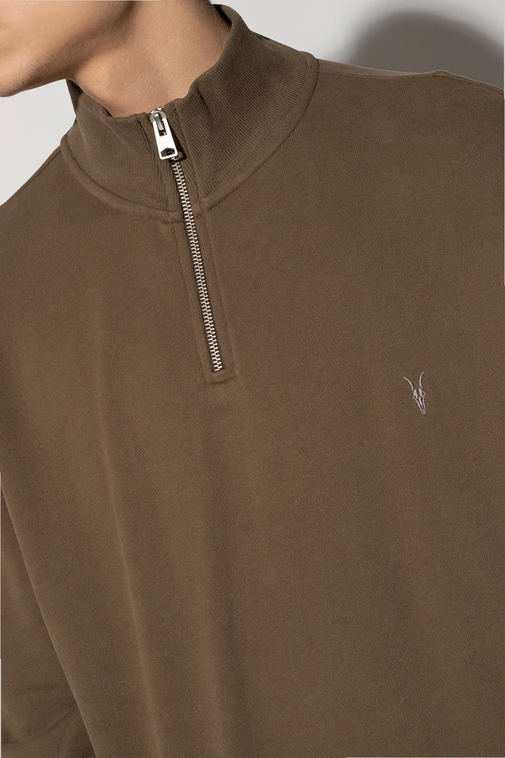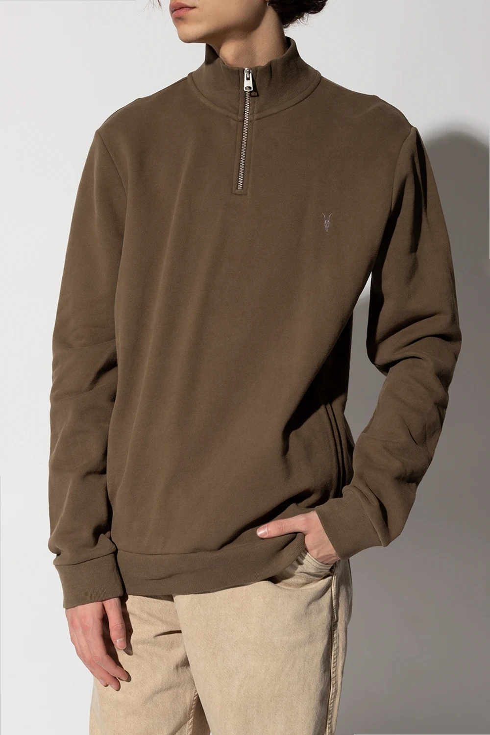 Green 'Raven' sweatshirt from AllSaints. Crafted from cotton jersey, this item fastens via a zip and features two welt pockets, an embroidered grey Ramskull logo and ribbed trims on the bottom hem and cuffs.