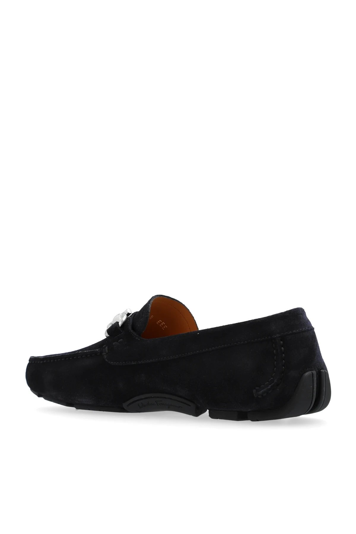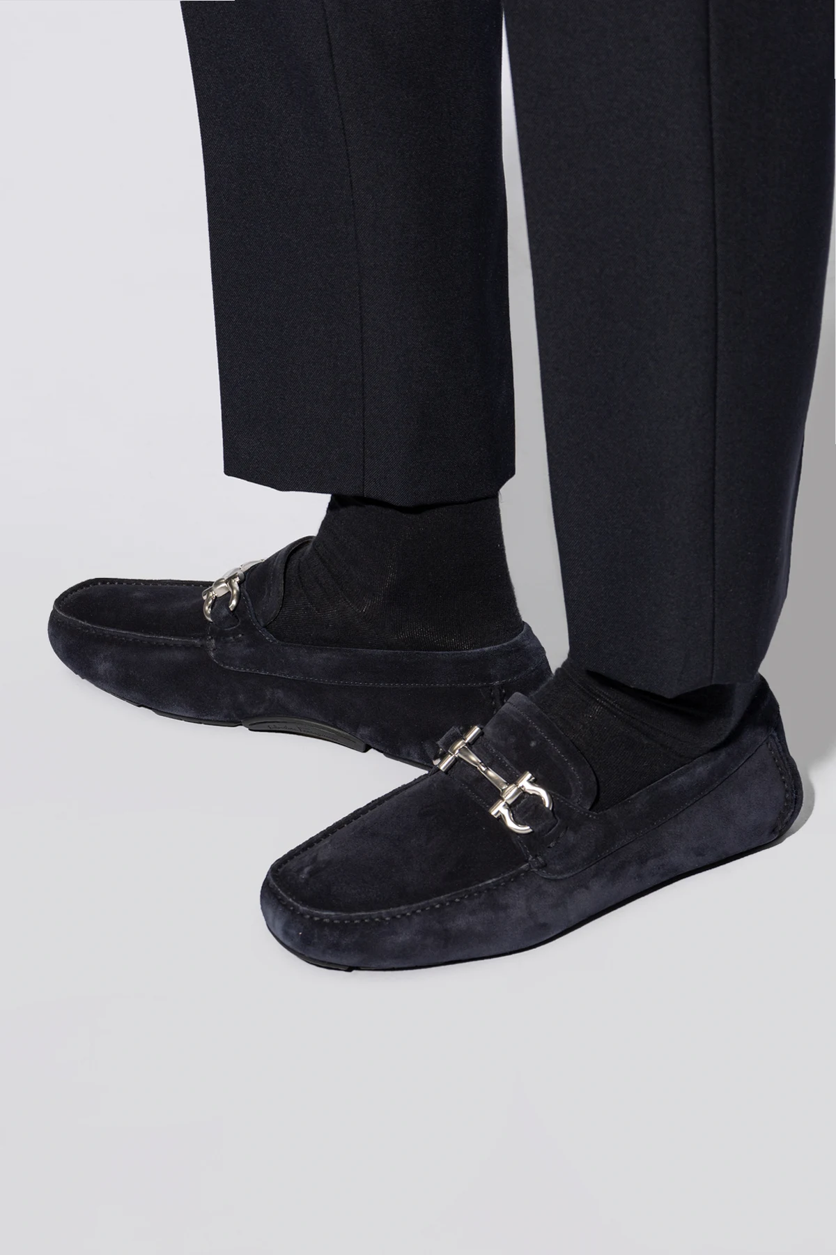 Introducing the ‘Parigi’ Leather Loafers, a quintessential expression of luxury from the exclusive FERRAGAMO collection. Crafted with meticulous attention to detail, these loafers are the epitome of classic elegance infused with modern sensibilities. The dominant navy hue, combined with the supple texture of suede leather, encapsulates a look of understated sophistication. The distinctive metal bit ornament, reminiscent of the iconic "bit loafers," graces the upper, adding a touch of timeless allure. The interior reveals a contrasting light brown leather lining, suggesting not only a high caliber of craftsmanship but also a commitment to comfort. Meticulous stitching and fine finishing underscore the quality inherent in every aspect of these shoes. The flat rubber sole ensures durability and practicality, making the ‘Parigi’ loafers versatile enough to complement both formal and casual ensembles. With an extra-wide insole, these loafers promise an unparalleled fit and day-long comfort, making them a perfect choice for the discerning gentleman seeking both style and substance. Why Purchase This Product? Elegant design with a contemporary twist, perfect for various occasions. Luxurious suede leather construction with a sleek metal bit accent. Exceptional craftsmanship, indicative of the FERRAGAMO legacy. Versatile styling potential, from formal wear to casual looks. Enhanced comfort with an extra-wide insole for extended wearability.