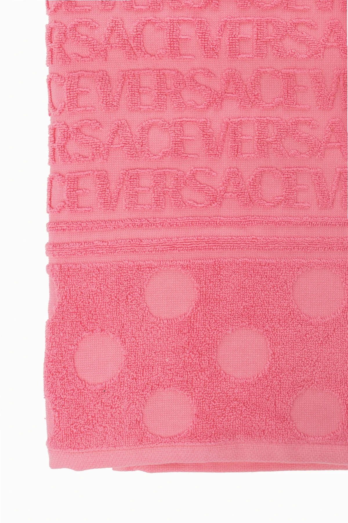 Pink bath towel with the Versace Allover Polka Dot pattern from Versace Home, ‘La Vacanza’ collection. Made of cotton.