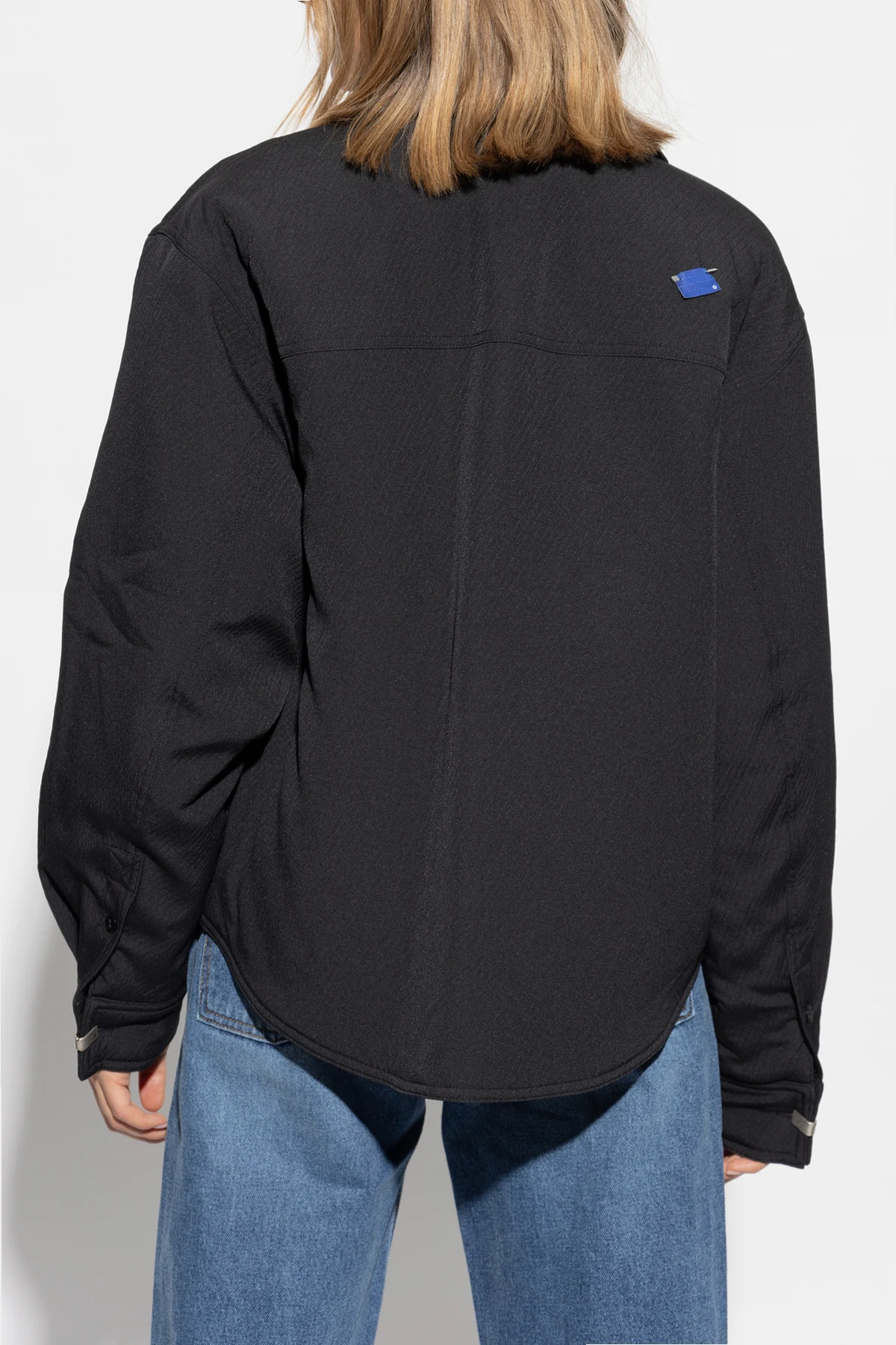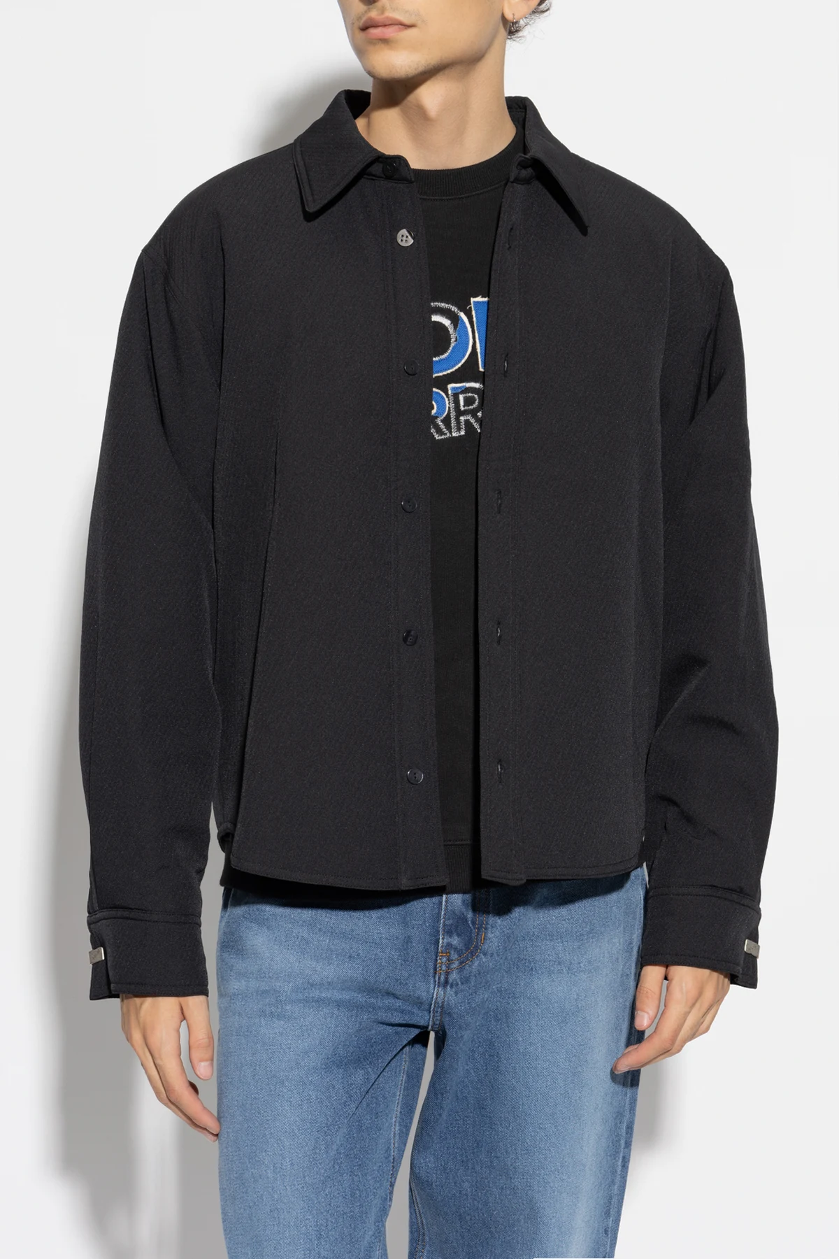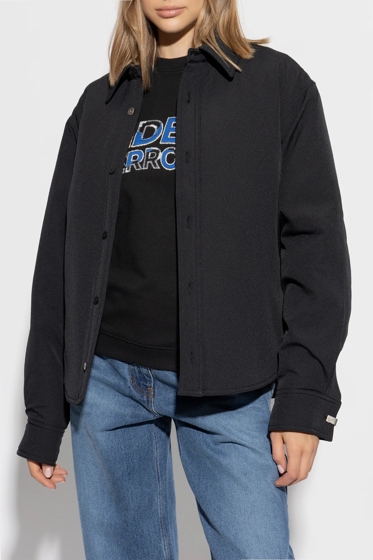 Introducing an exquisite blend of sartorial elegance and contemporary design, the Shirt-Style Jacket by Ader Error epitomizes sophisticated minimalism. This black jacket is meticulously crafted from premium materials, featuring a timeless shirt silhouette with a straight collar and long sleeves with adjustable snap cuffs. The rounded hem adds a subtle touch of refinement. Constructed from a robust fabric blend, this jacket ensures durability and a luxurious feel. The outer layer is made of 100% polyester, while the inner lining combines polyester and viscose for enhanced comfort. The polyester filling provides optimal warmth without compromising on style. The front button closure extends the full length of the jacket, offering a sleek, uninterrupted appearance. A small blue label on the upper back, adorned with the designer's logo, signifies the jacket's exclusive nature. The absence of visible front pockets underscores its minimalist aesthetic. Additional features include small metal accents on the cuffs, which serve as both functional fasteners and decorative elements. The unisex design is showcased through versatile styling, making it a perfect addition to any wardrobe, whether paired with jeans and a t-shirt for a casual look or dressed up for a more polished ensemble. Why Choose This Product? Exclusive design by Ader Error, a renowned South Korean brand. High-quality construction with durable and comfortable materials. Minimalist and sophisticated aesthetic. Unique unisex appeal, suitable for versatile styling. Subtle, elegant branding with the designer's signature blue label.
