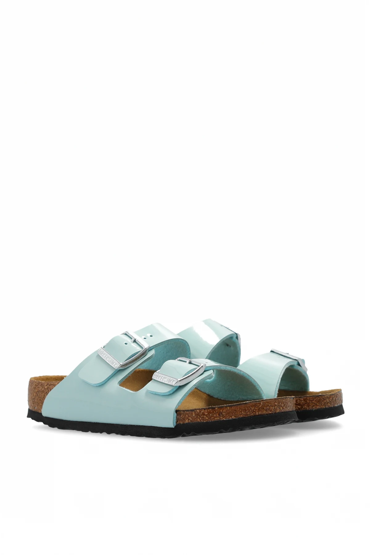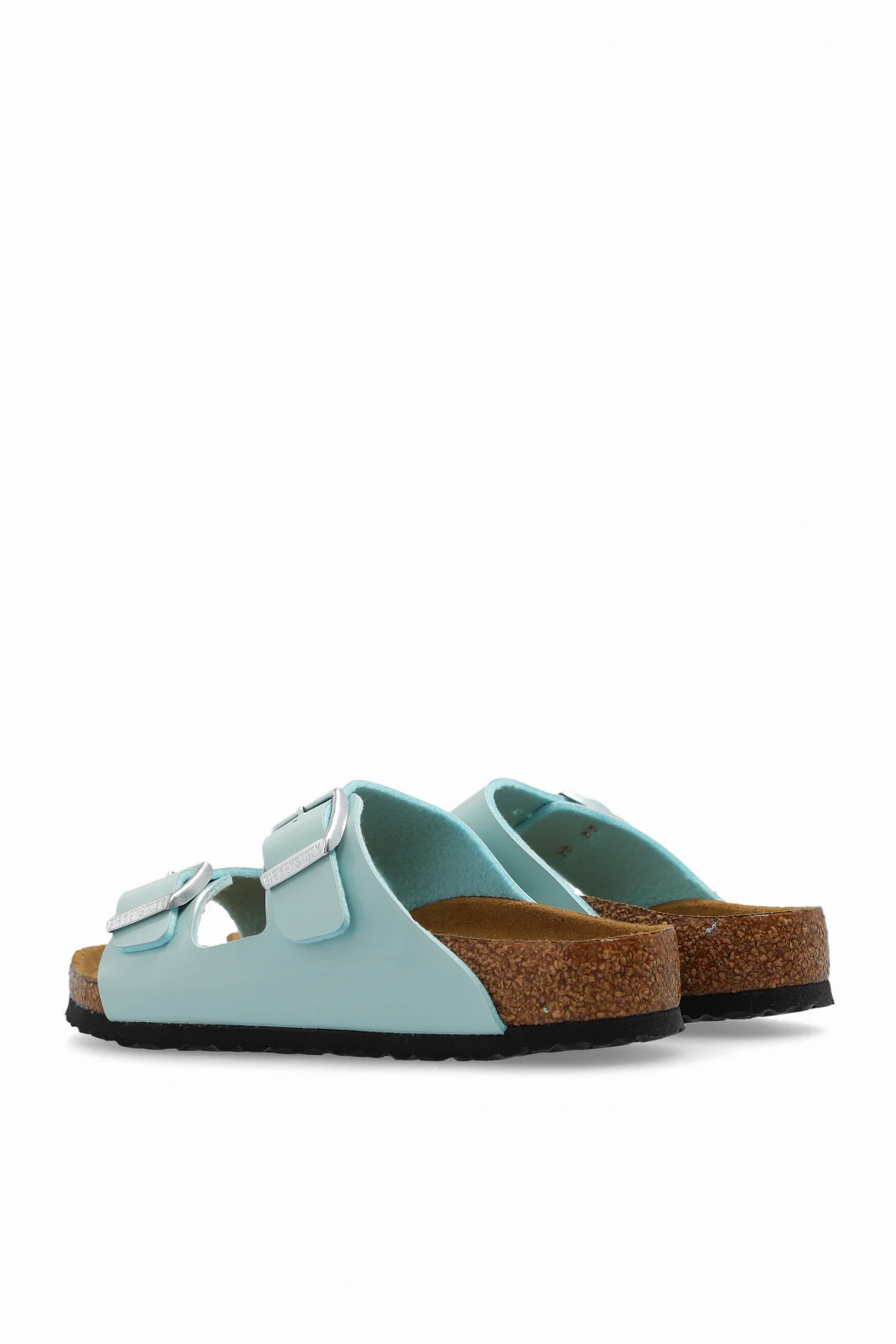Light blue ‘Arizona BS’ slides from Birkenstock Kids. Made of patent Birko-Flor® fabric, this pair features adjustable straps with a logo-engraved buckle in silver-tone metal, embossed logo on the side, anatomically shaped narrow width cork-latex footbed and dark brown EVA sole.