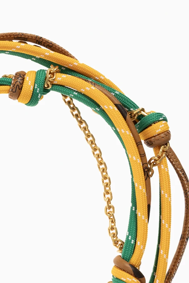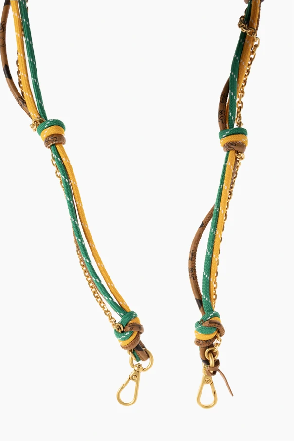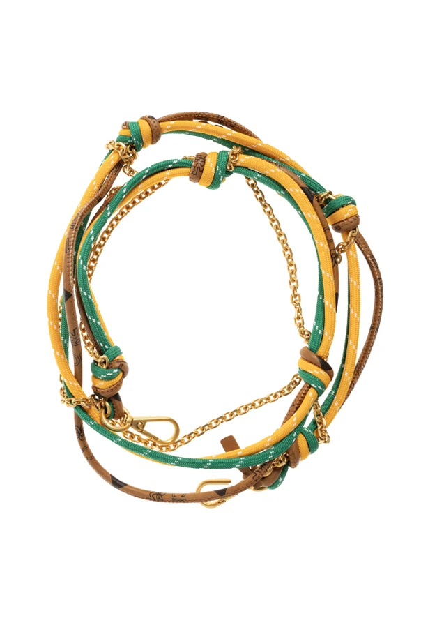 Indulge in elevated sophistication with this exclusive bag strap from MCM , masterfully designed for the modern aesthete. Showcasing a uniquely braided silhouette, this multi-textured accessory is distinguished by a contemporary interplay of intertwined textile ribbons and supple leather. A captivating palette of orange , navy blue , and black intertwines seamlessly, highlighted by subtle white accents and lustrous silver-tone chain links, lending dynamic visual intrigue.