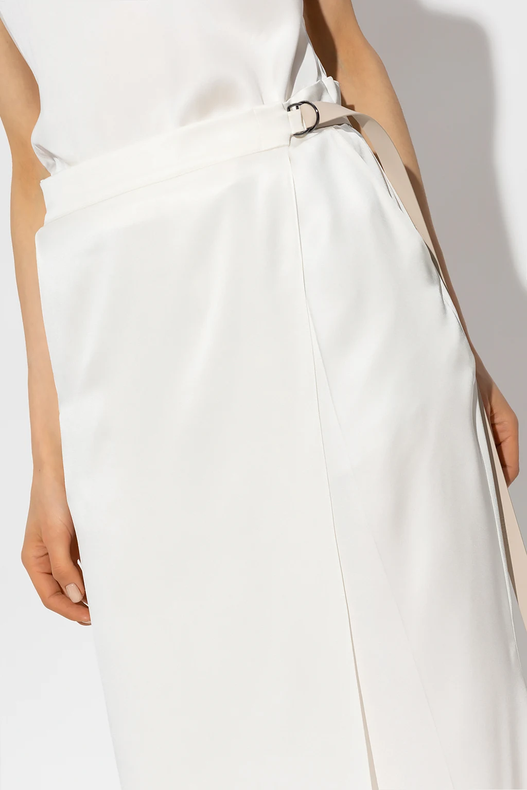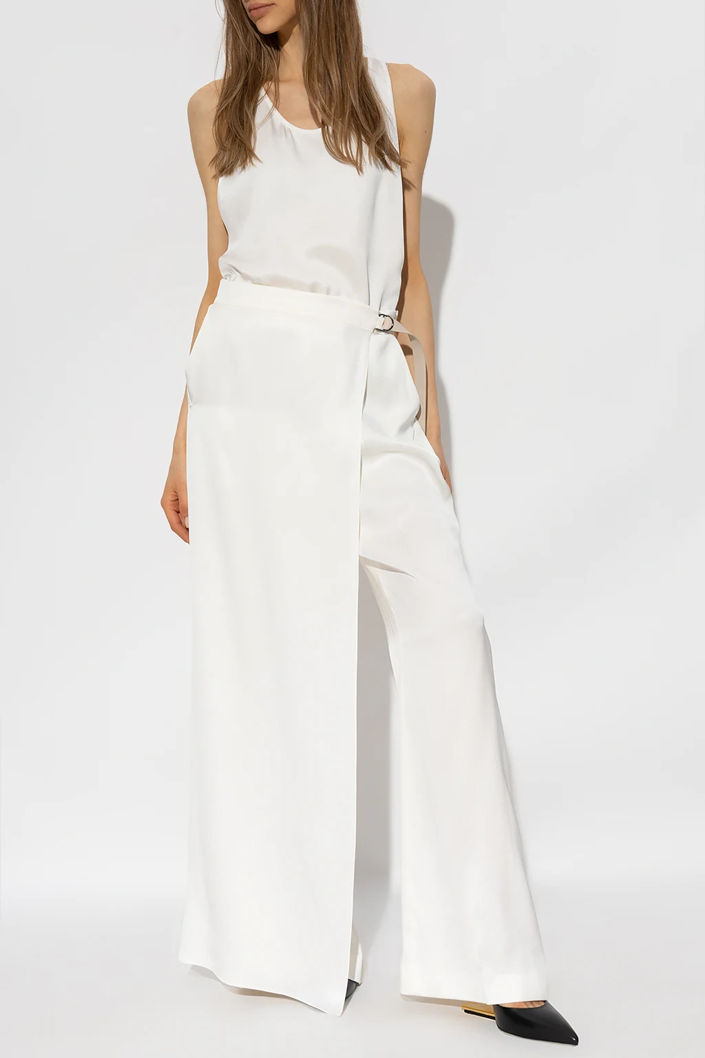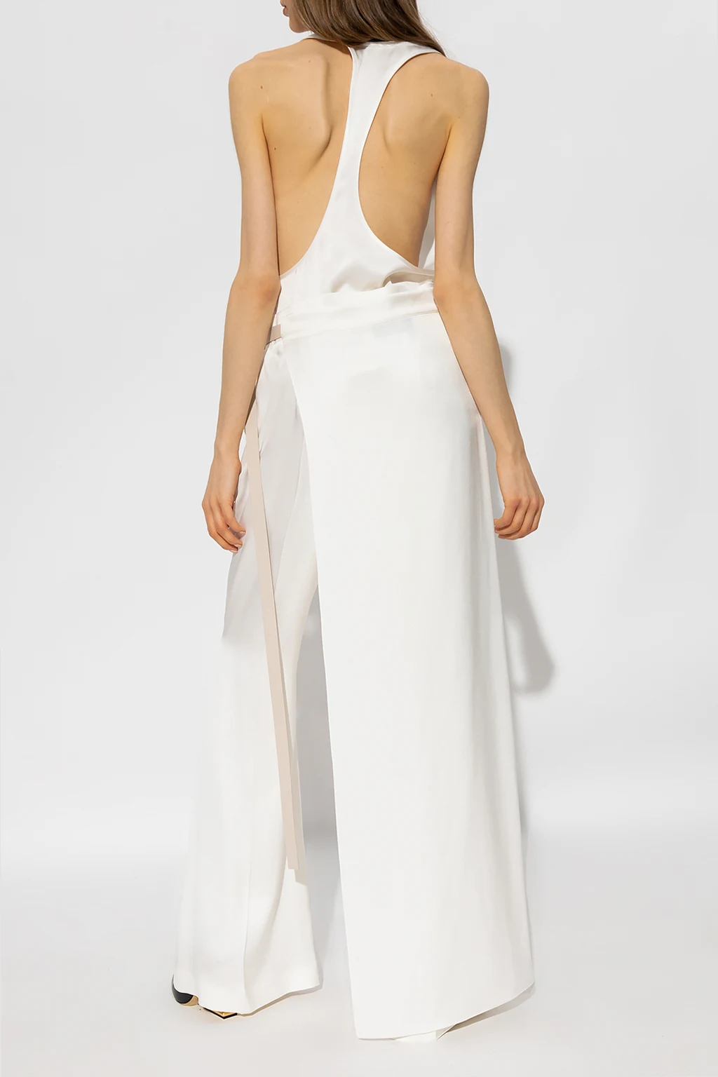 White sleeveless jumpsuit from Fendi. Made of silk, this design features a side zip, open shoulders and back, two front pockets, flared, pleat-front legs and detachable panel with a buckle strap to the side.