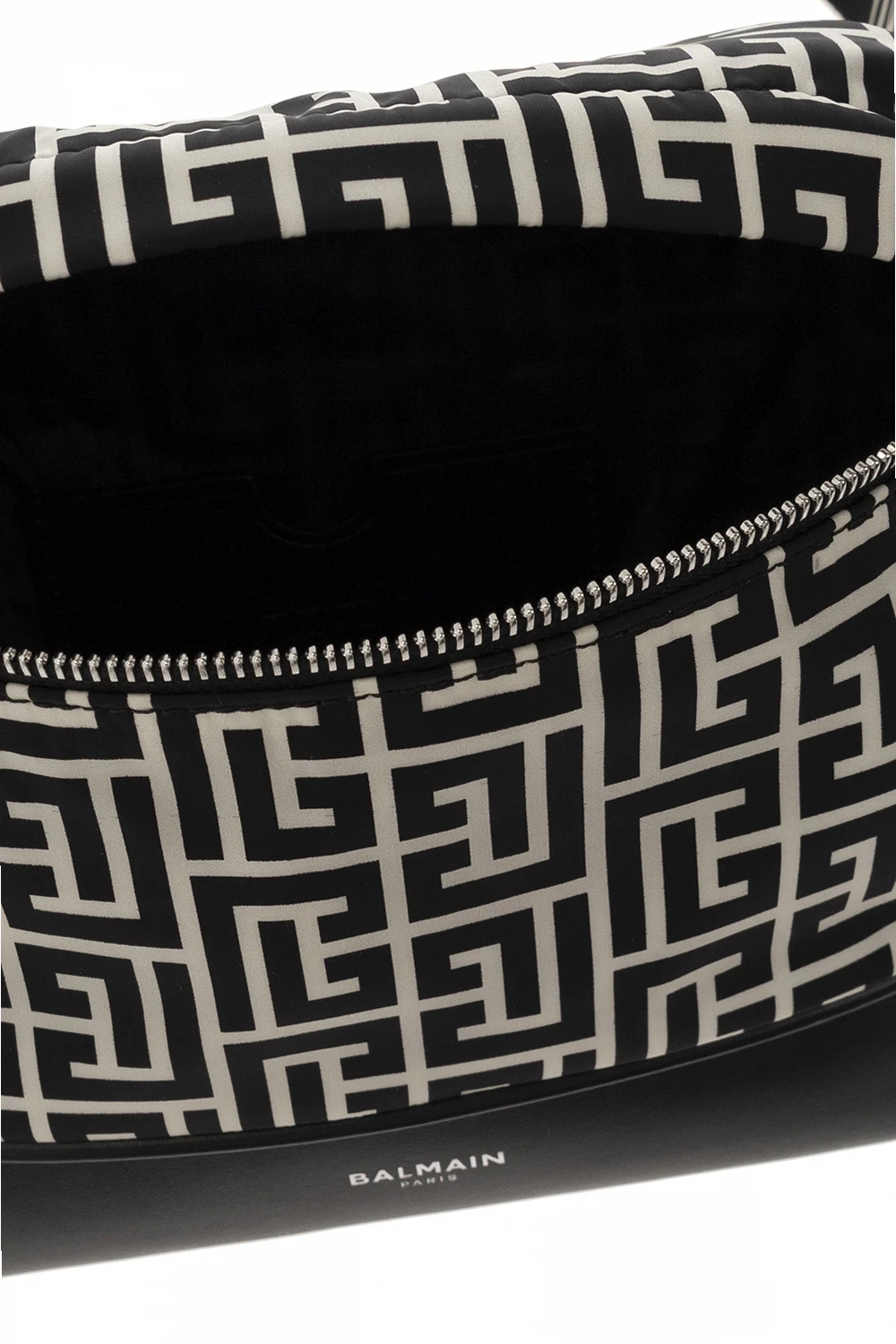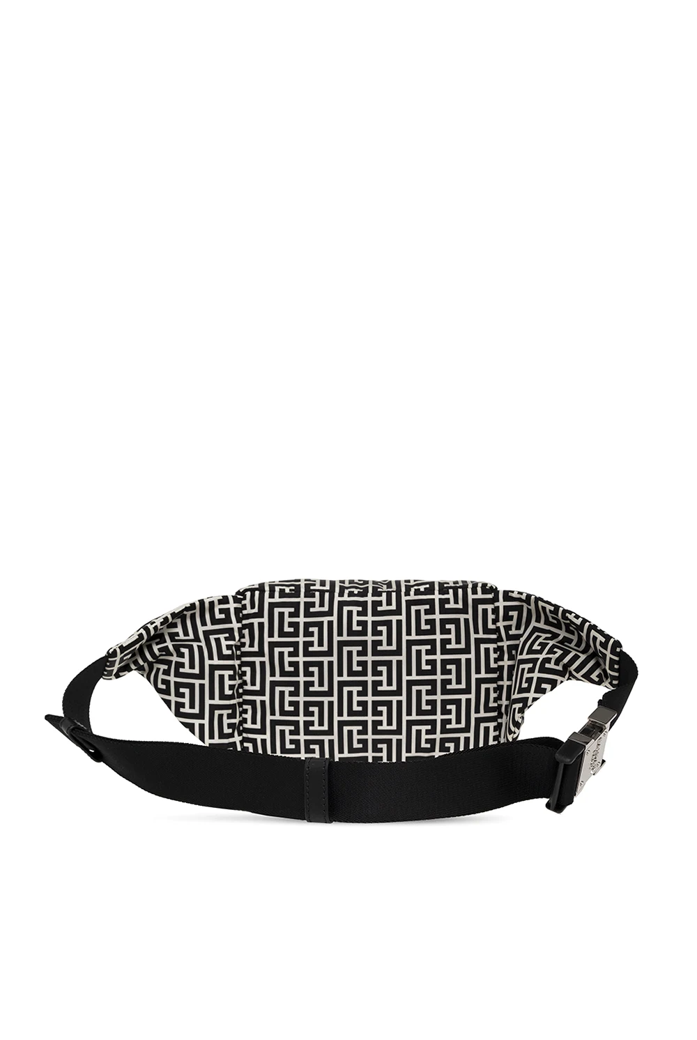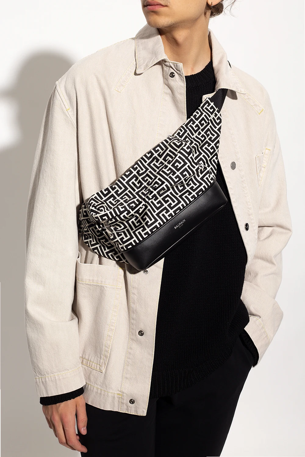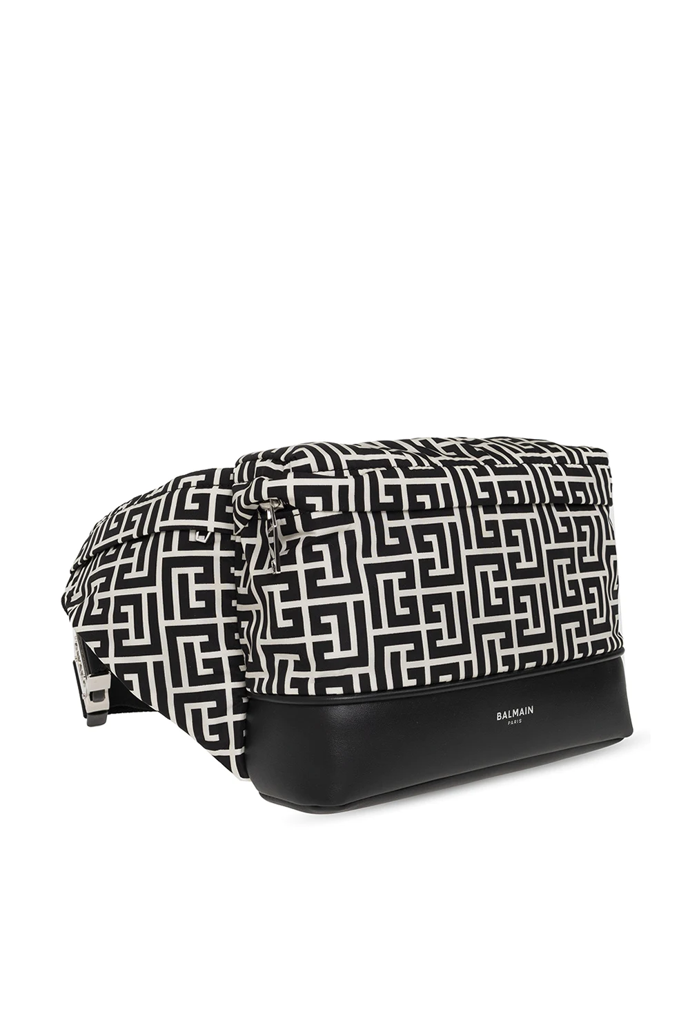 Black and white ‘City’ belt bag from Balmain. Trimmed with calf leather, this model features a zip fastening, the label’s signature monogram pattern, silver-tone logo print, zipped side pockets, adjustable belt, silver-tone metal hardware and one internal compartment with one card slot.