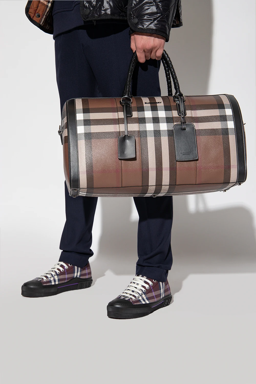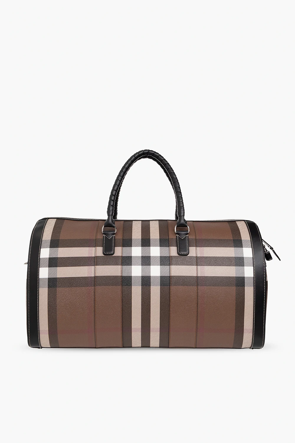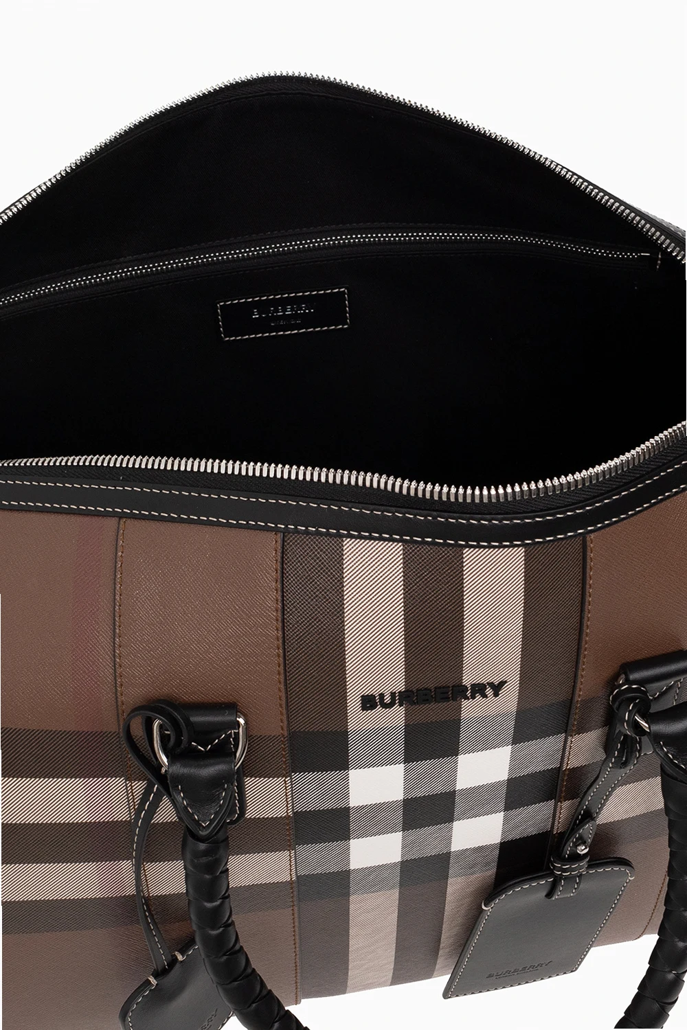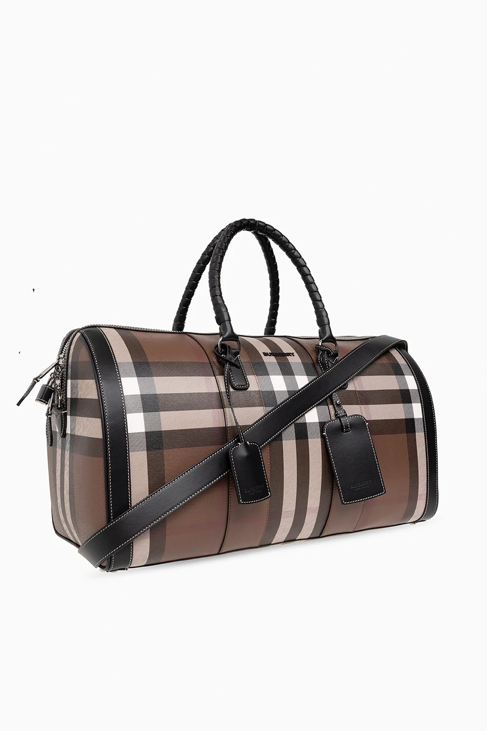 Brown ‘Boston’ holdall from Burberry. Crafted from cotton and decorated with the brand's signature black, white and red check pattern, this design secures with a two-way zipper and keyed padlock and features a metal logo plaque on the front, two half-round handles with luggage tags, a detachable and adjustable strap, silver-tone metal hardware and one internal compartment with two slip pockets and one zip pocket.