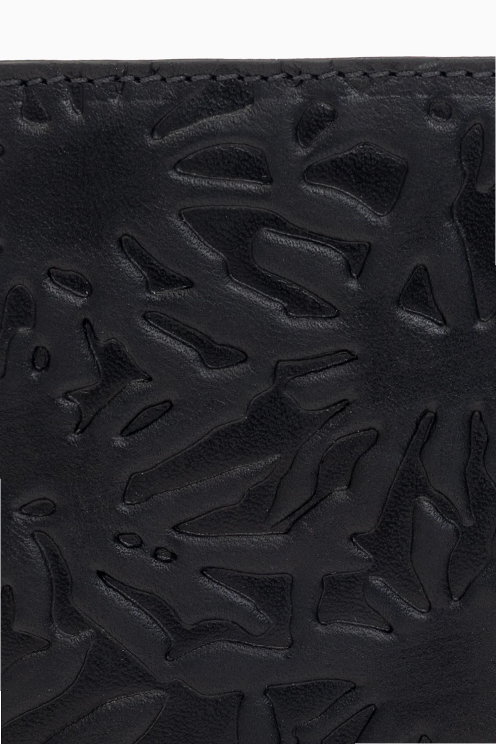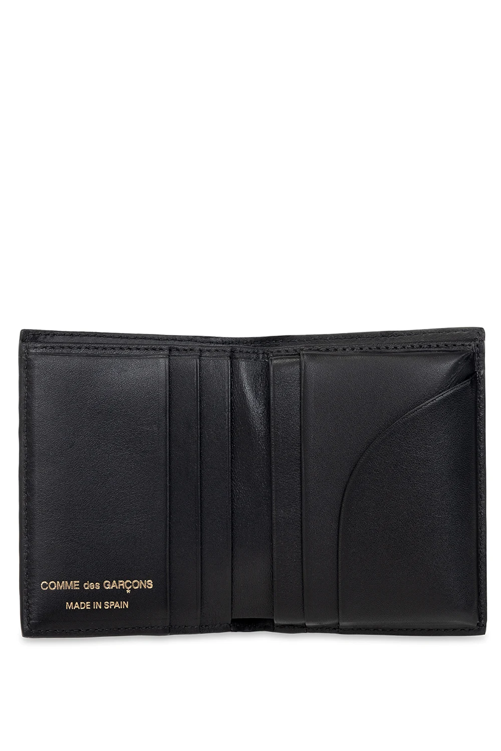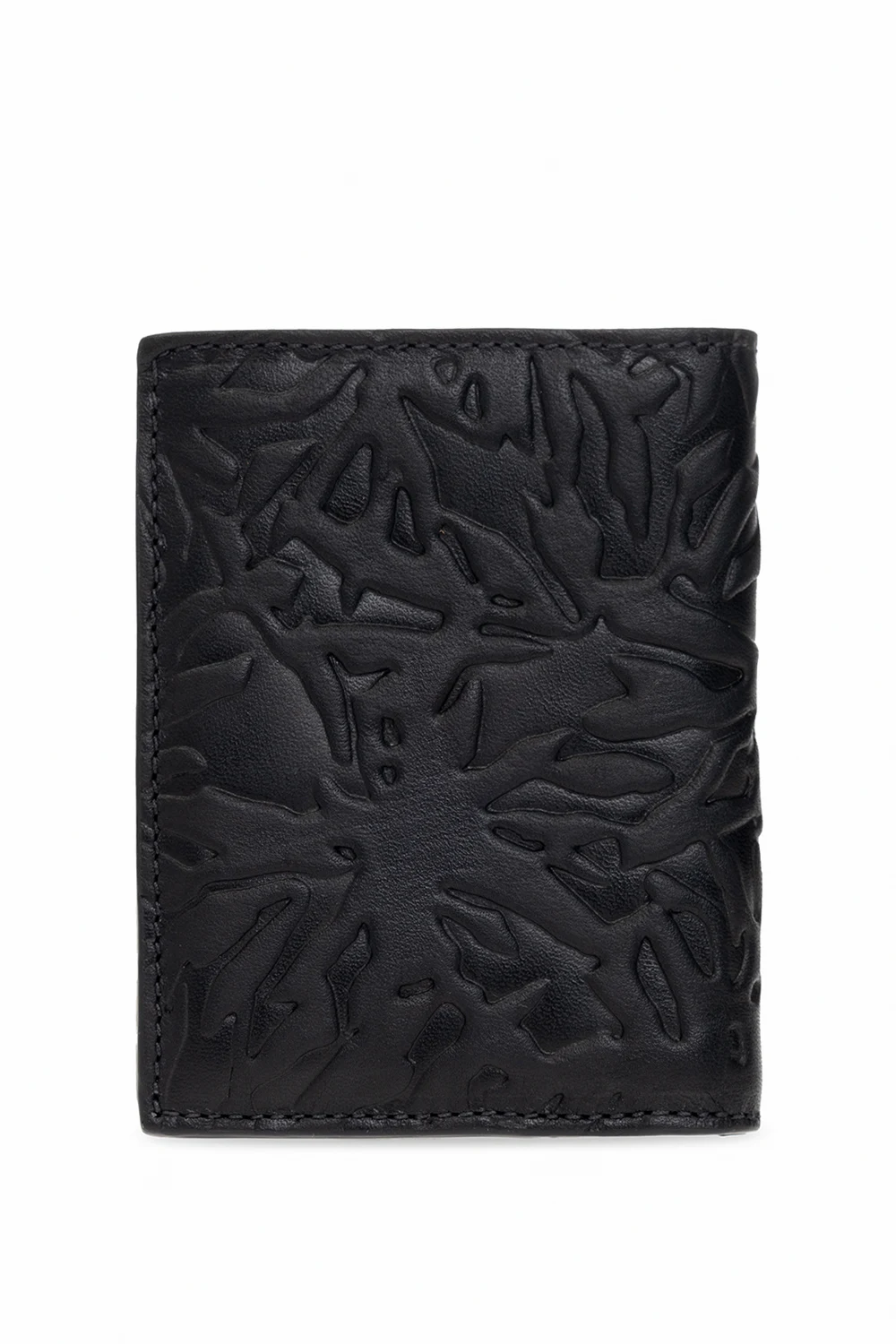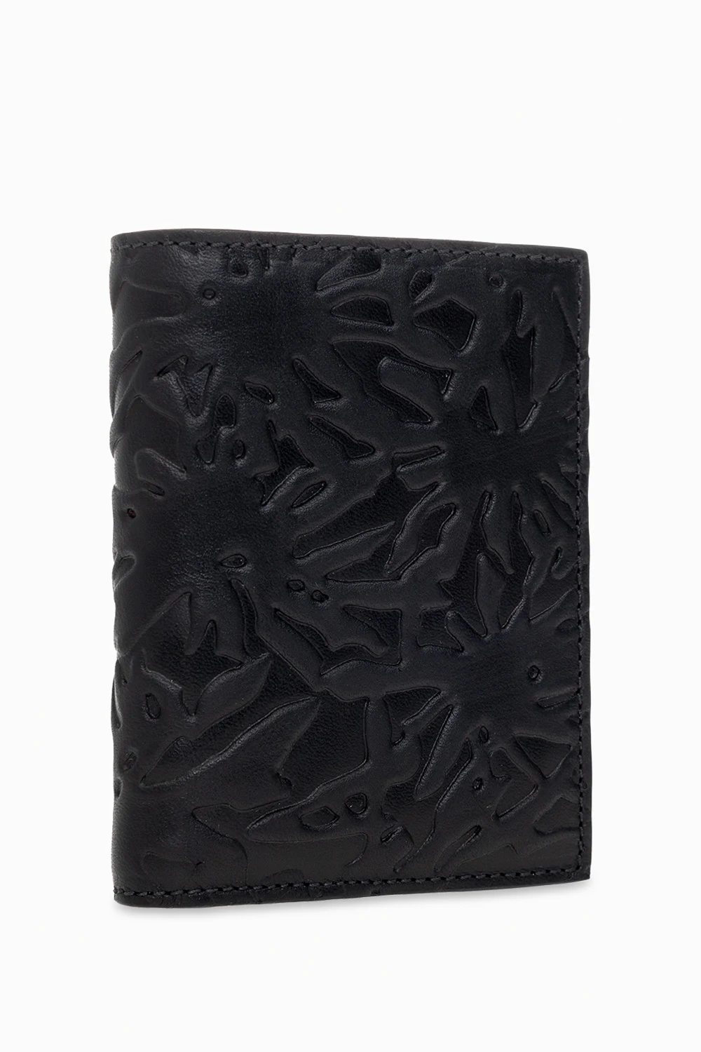 Black card holder from Comme des Garcons. Made of cow leather, this item features an embossed pattern, six card slots and one bill compartment.