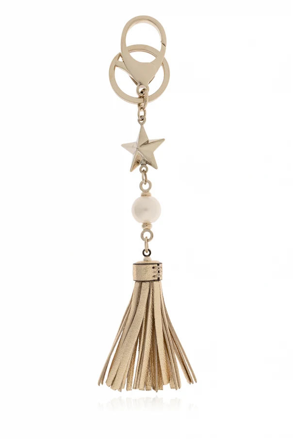 Elevate your accessories collection with this exquisitely crafted golden keychain with pearl , envisioned by renowned designer Jimmy Choo . Its slender silhouette effortlessly blends opulence and contemporary style, making it an exceptional addition to any handbag or set of keys. The composition features a classic lobster clasp and ring, a prominent three-dimensional star, and a lustrous, perfectly rounded pearl, centrally positioned along its elegant vertical axis. A subtle gold accent graces the pearl, introducing an air of refinement, while the design culminates in a resplendent gold tassel with a hint of metallic sheen. Meticulously fashioned from premium leather and radiant pearl, this keychain epitomizes sophistication, making it a perfect homage to modern luxury. Why choose this product? Striking combination of pearl, star, and gold for a true statement piece Designed by acclaimed luxury brand Jimmy Choo Artful use of premium leather and fine materials Elegant gold hue enhances exclusivity and versatility Perfect for personal indulgence or as a refined gift