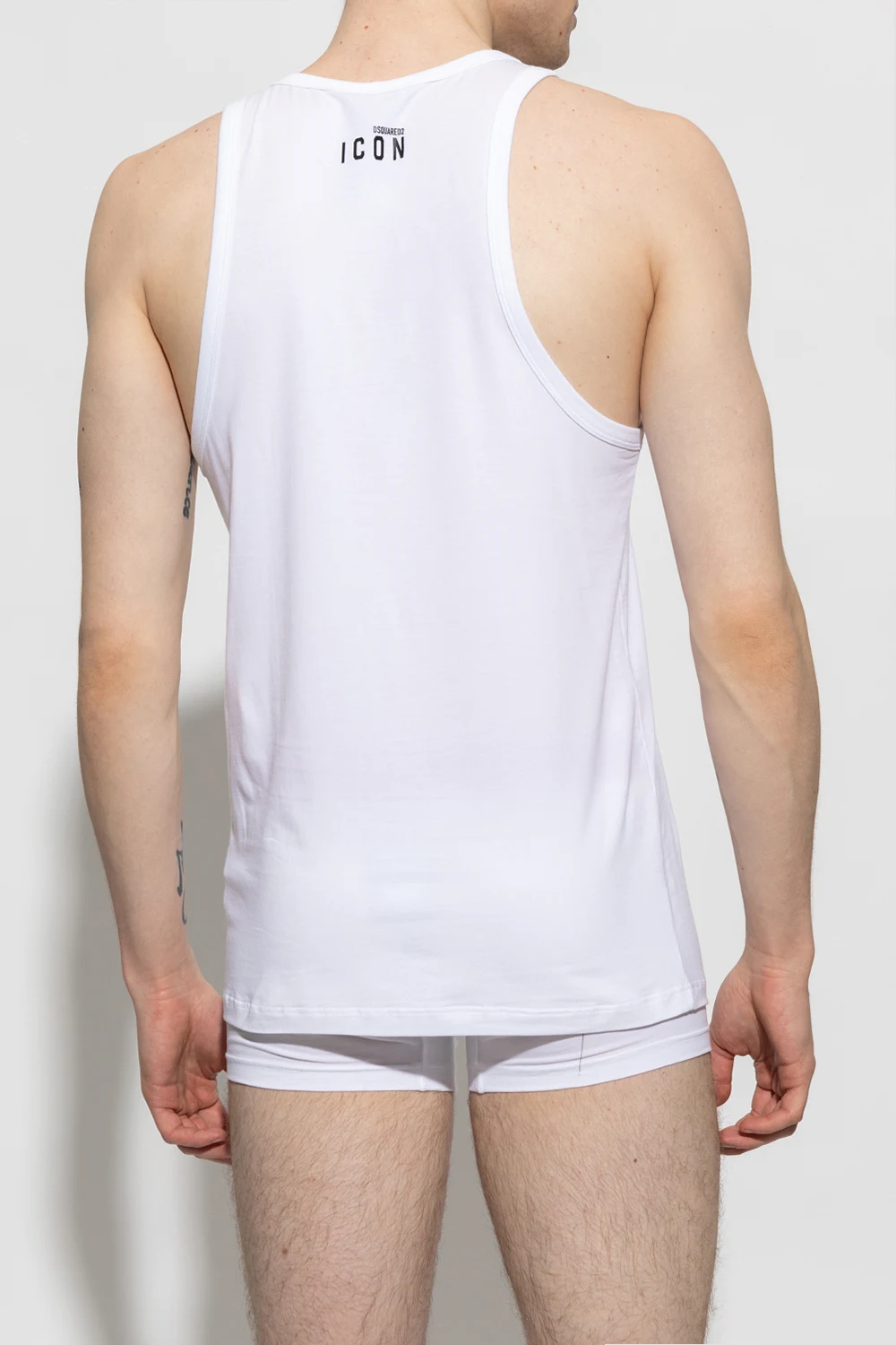 White sleeveless T-shirt from Dsquared2, the ‘Underwear’ collection. Printed at back with a black logo, this style features a logo patch on the hem and piping on the round neck and shoulder edges.