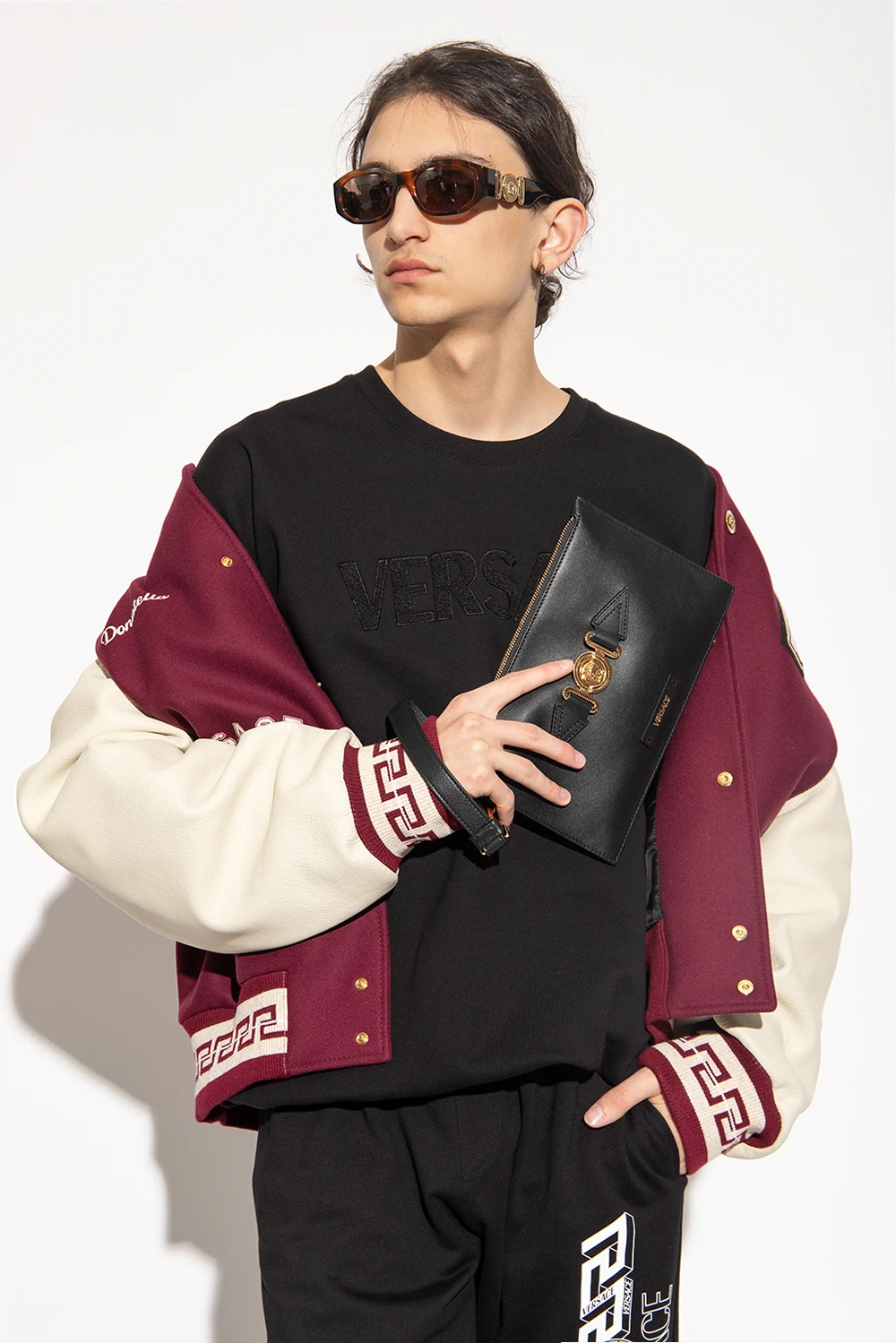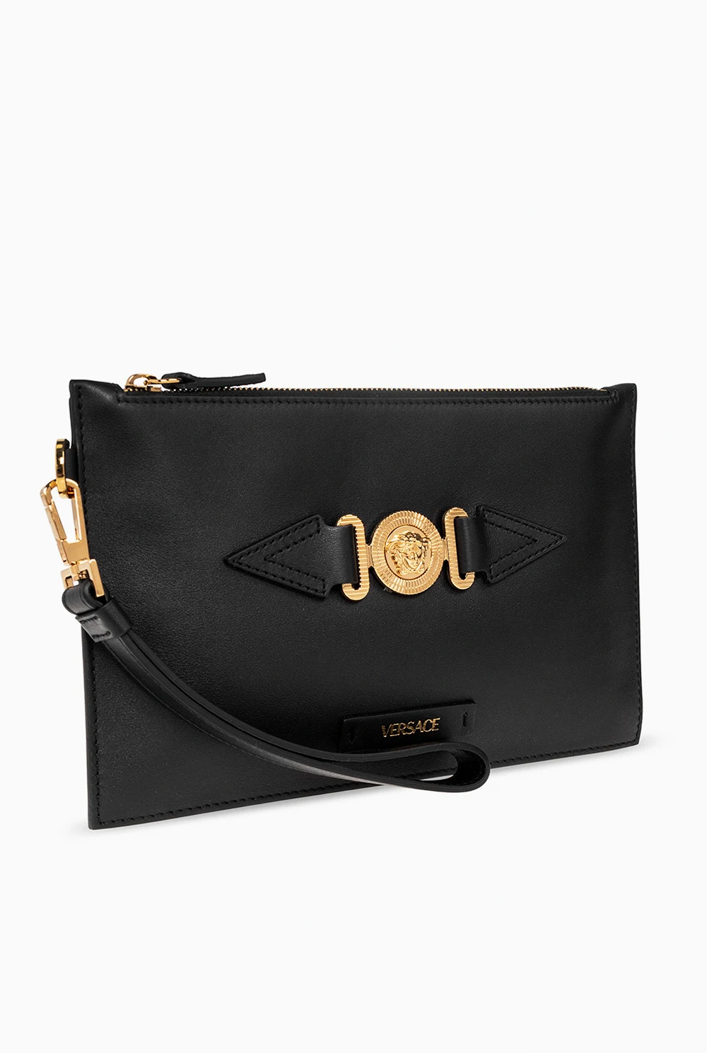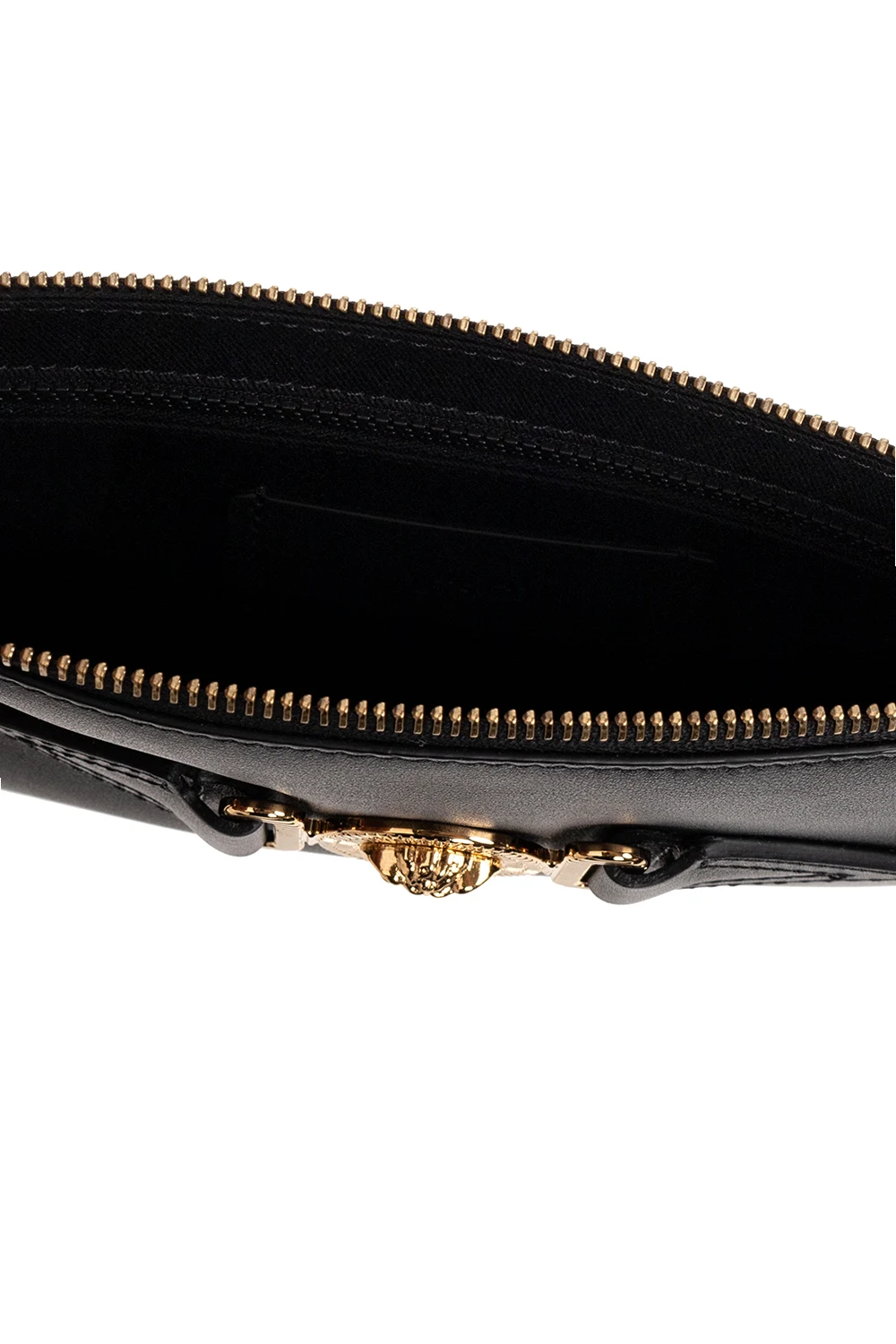 Black ‘Medusa Small’ handbag from Versace. Crafted from leather, this design secures with a zip and showcases a logo patch and brass Medusa hardware on the front, a detachable wrist strap on the side, gold-toe metal elements and one internal compartment with one slip pocket.