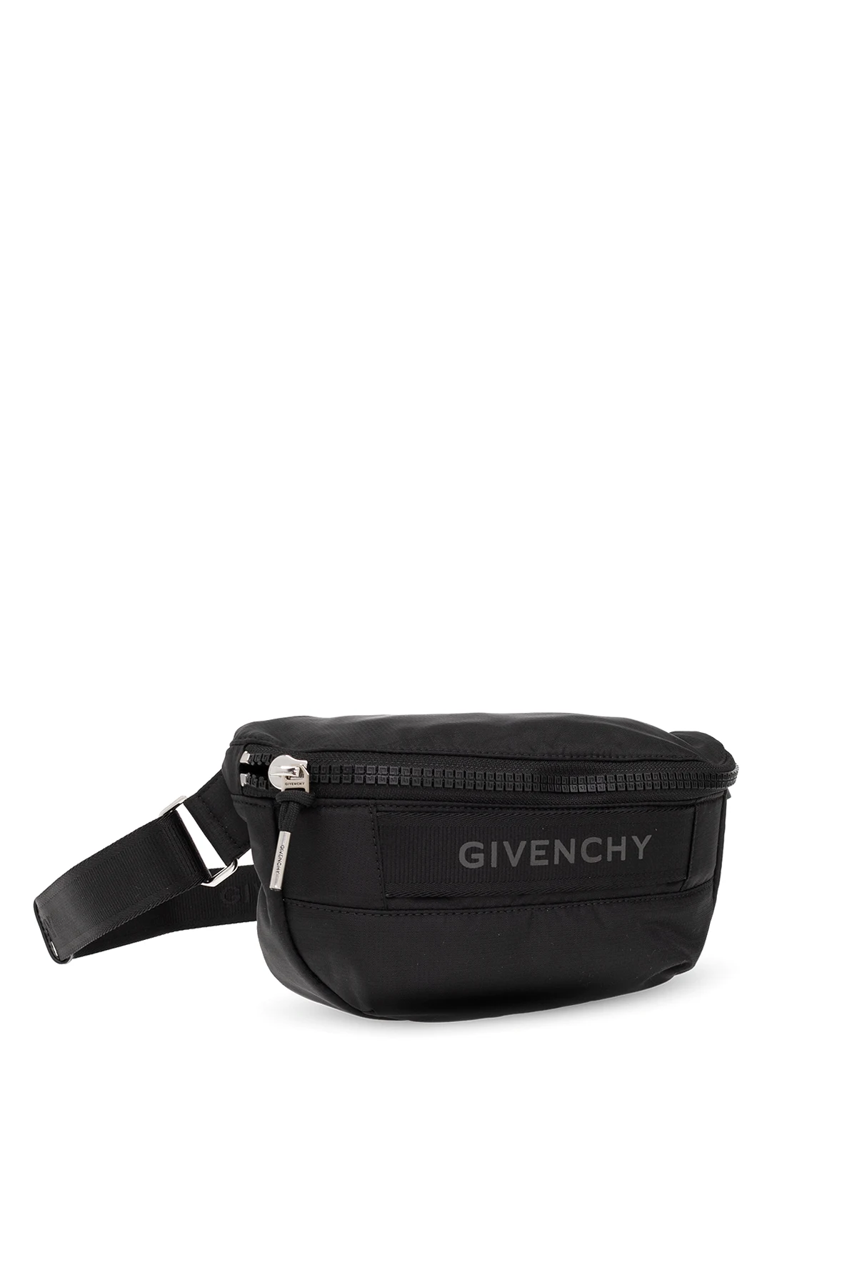 Black ‘G-Trek’ belt bag from Givenchy. Fastened with a zip, this model features a handle with a reflective logo, adjustable belt, one internal compartment and silver-tone metal hardware.