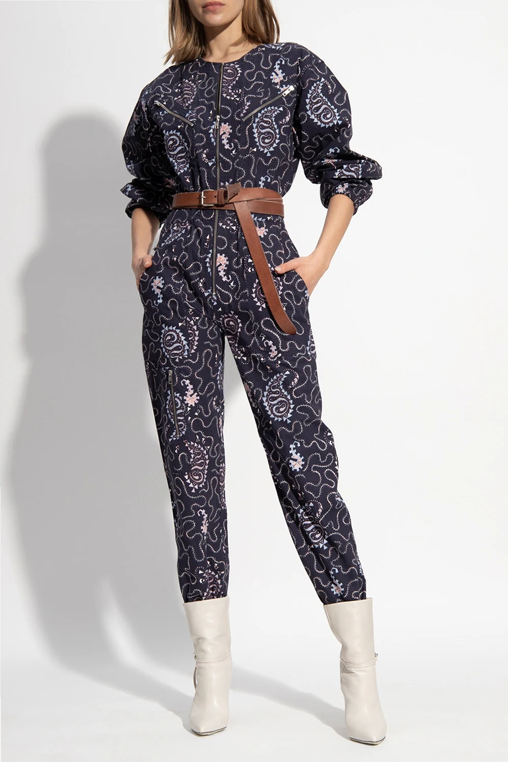Navy blue jumpsuit from Isabel Marant Étoile. Illustrated with a colourful pattern, this item fastens via a zip and features an elasticated waistband, three zipped pockets and two slip pockets on the front, two zipped pockets on the back, and tapered legs.