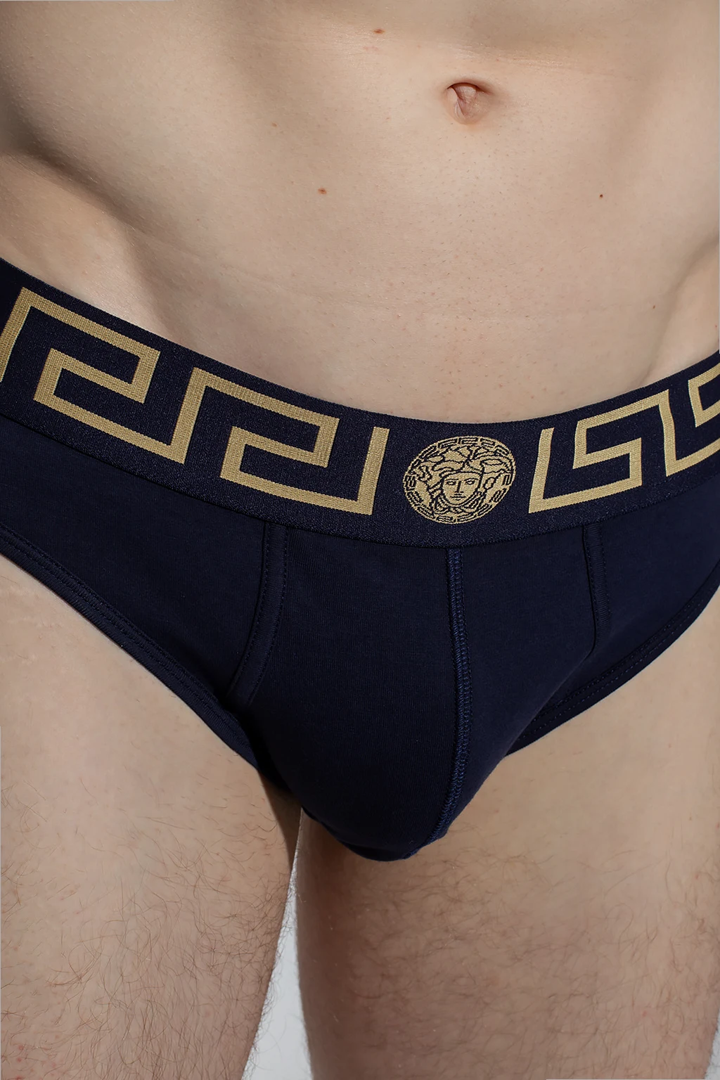 Navy briefs from Versace. Made of cotton, this garment has an elasticated waistband with the Greca pattern and the label’s signature Medusa head in gold-tone.