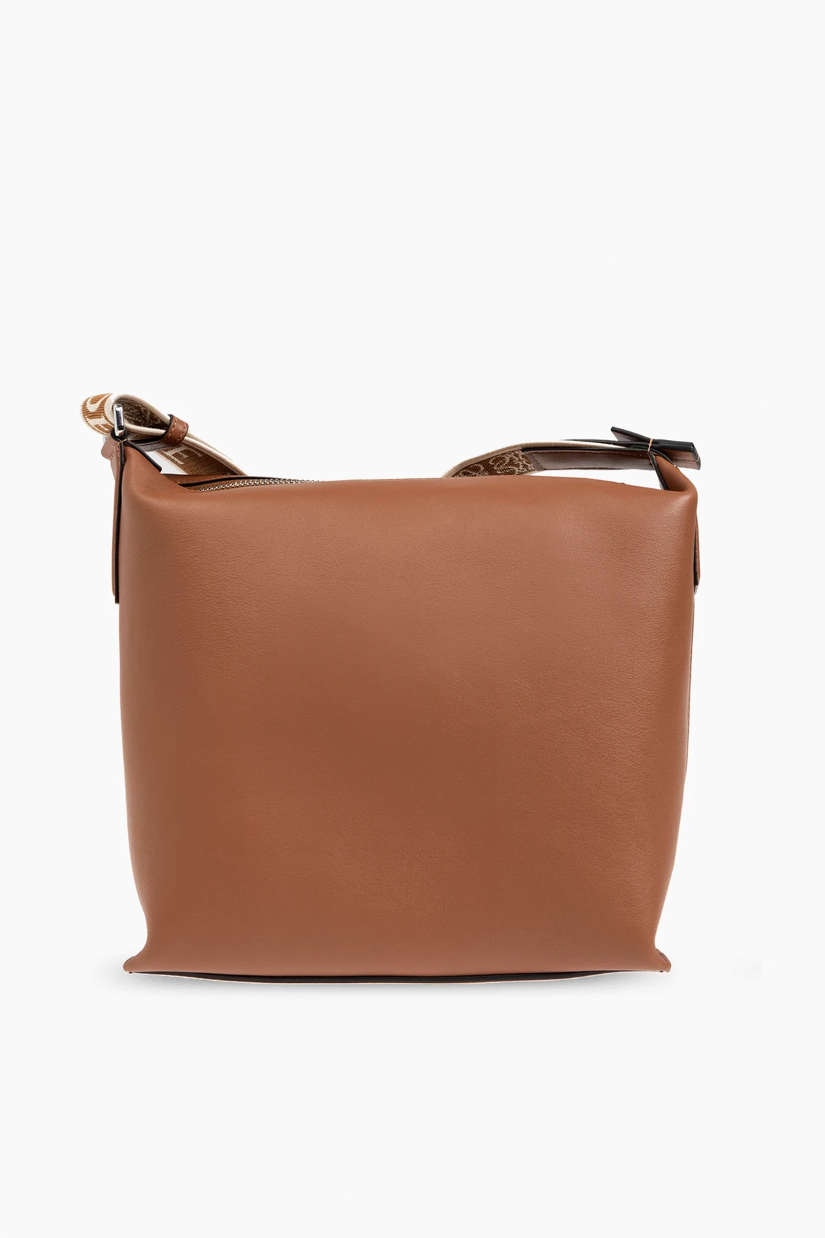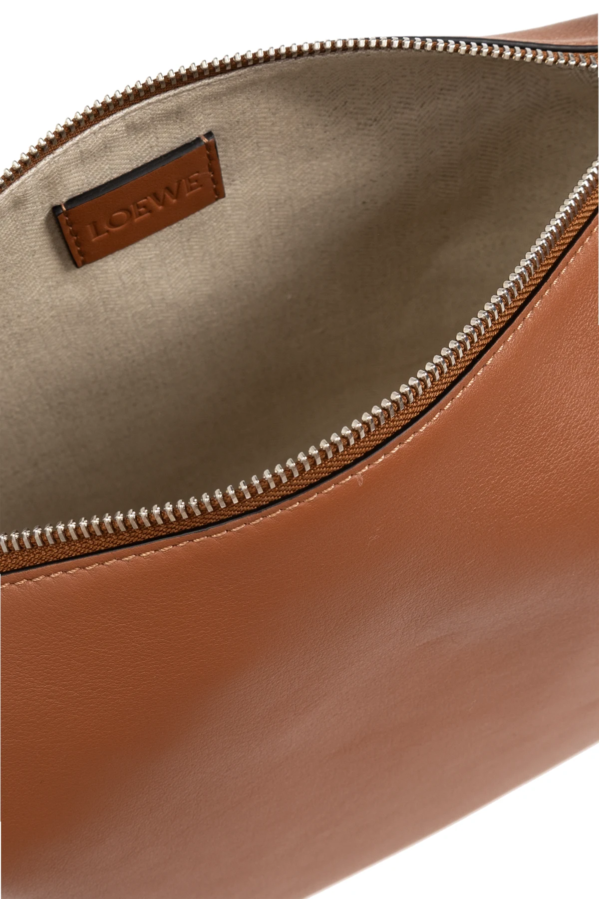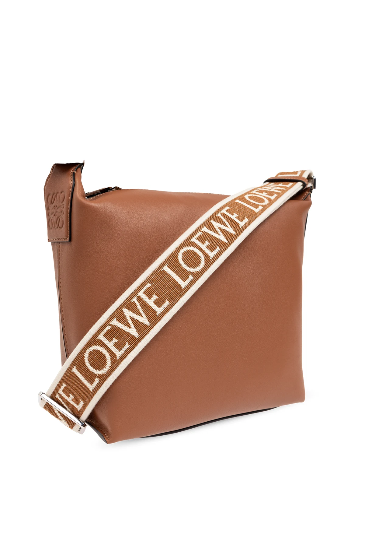 Introducing the \'Cubi Small\' shoulder bag by the esteemed brand Loewe. This luxurious accessory exudes sophistication and practicality, making it a quintessential addition to any discerning wardrobe. The bag boasts a rectangular, compact shape with subtly rounded edges, crafted from premium smooth leather in a rich brown hue. The wide shoulder strap, adorned with the repeated \"LOEWE\" motif in white letters and trim, adds a bold statement while ensuring comfort and versatility. Secured with a zipper closure, the \'Cubi Small\' guarantees the safety of your belongings. Inside, the bag is lined with a light-colored, durable fabric, complemented by a small leather patch featuring the Loewe logo. This intricate attention to detail showcases the brand\'s dedication to superior craftsmanship. The exterior is further accentuated by an embossed Loewe logo on one side, enhancing its exclusive appeal. Despite its petite size, the bag offers ample space for daily essentials, making it ideal for everyday use. Why Buy This Product? Exquisite design by Loewe High-quality smooth leather Secure zipper closure Comfortable and stylish shoulder strap Compact yet spacious interior Distinctive Loewe logo details