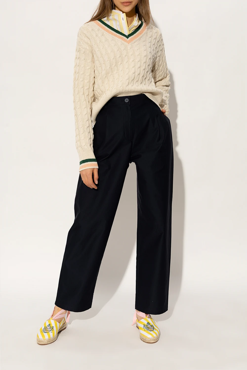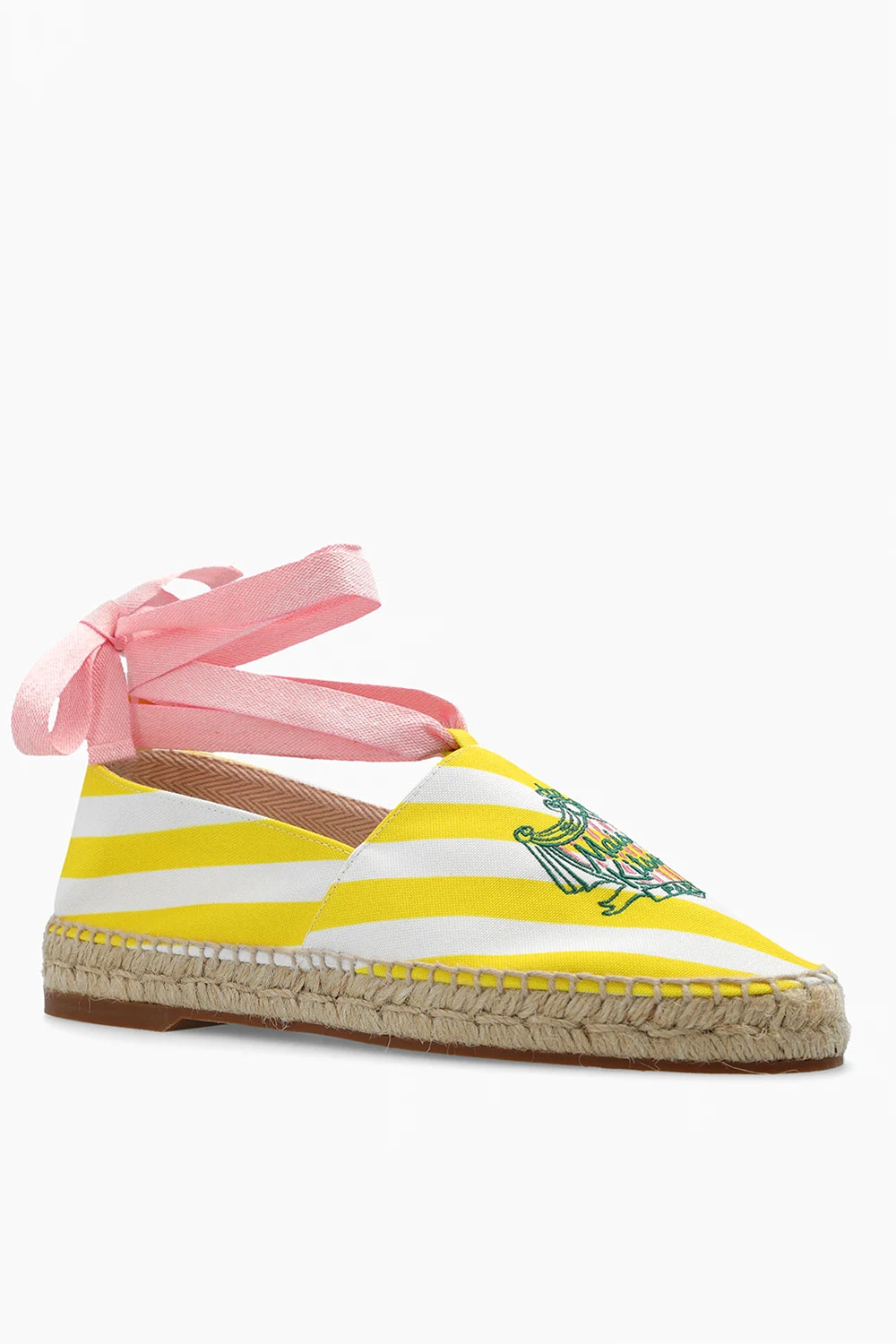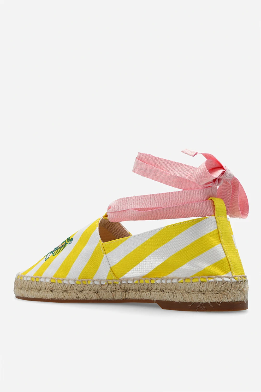 White and yellow espadrilles from Maison Kitsune. Fastened with pink ankle ties, this pair features a stripe pattern, green and pink embroidered logo pattern and brown rubber sole.