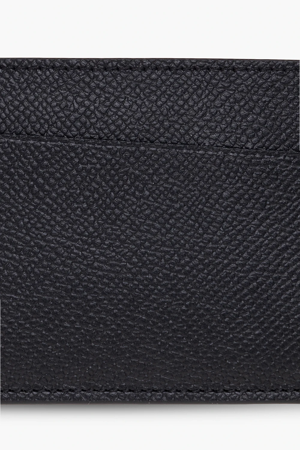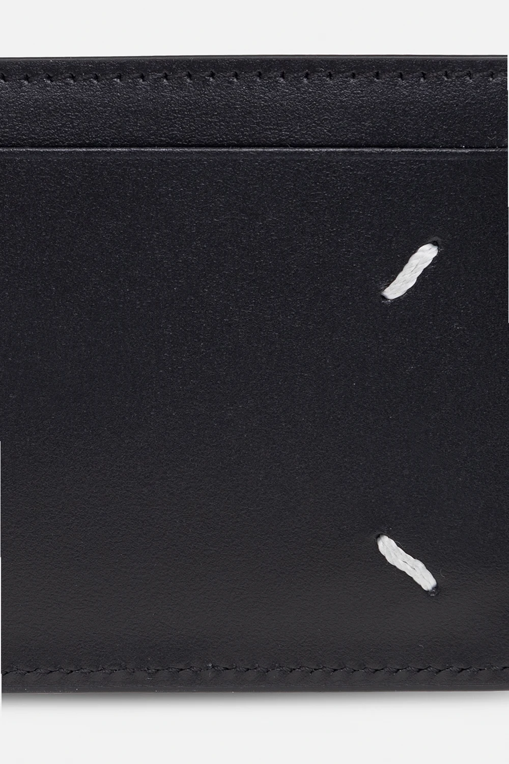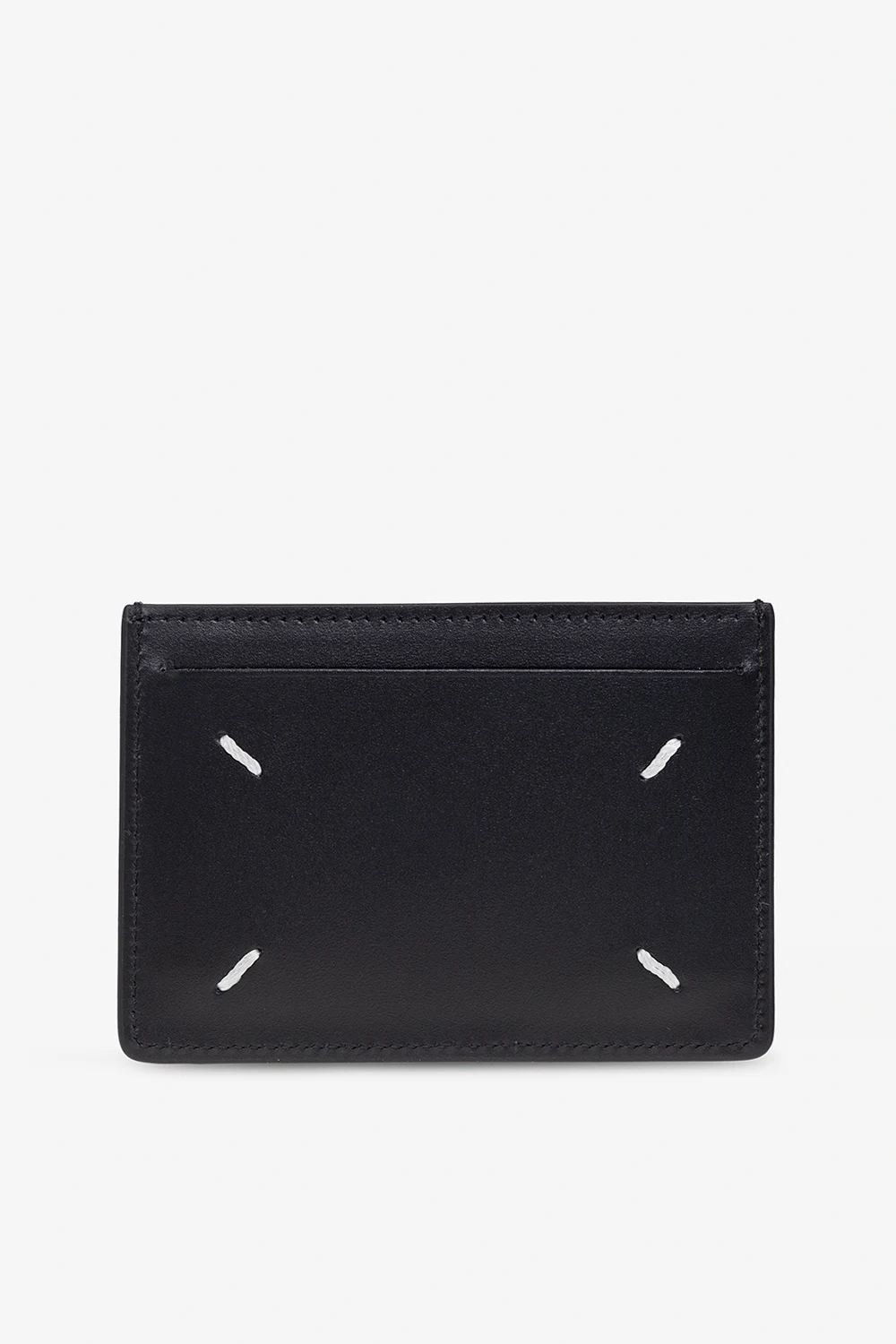 Black card case from Maison Margiela. Made of grained leather on one side and smooth leather on the other, this design showcases the brand\'s signature white four-stitches moniker and three card slots.