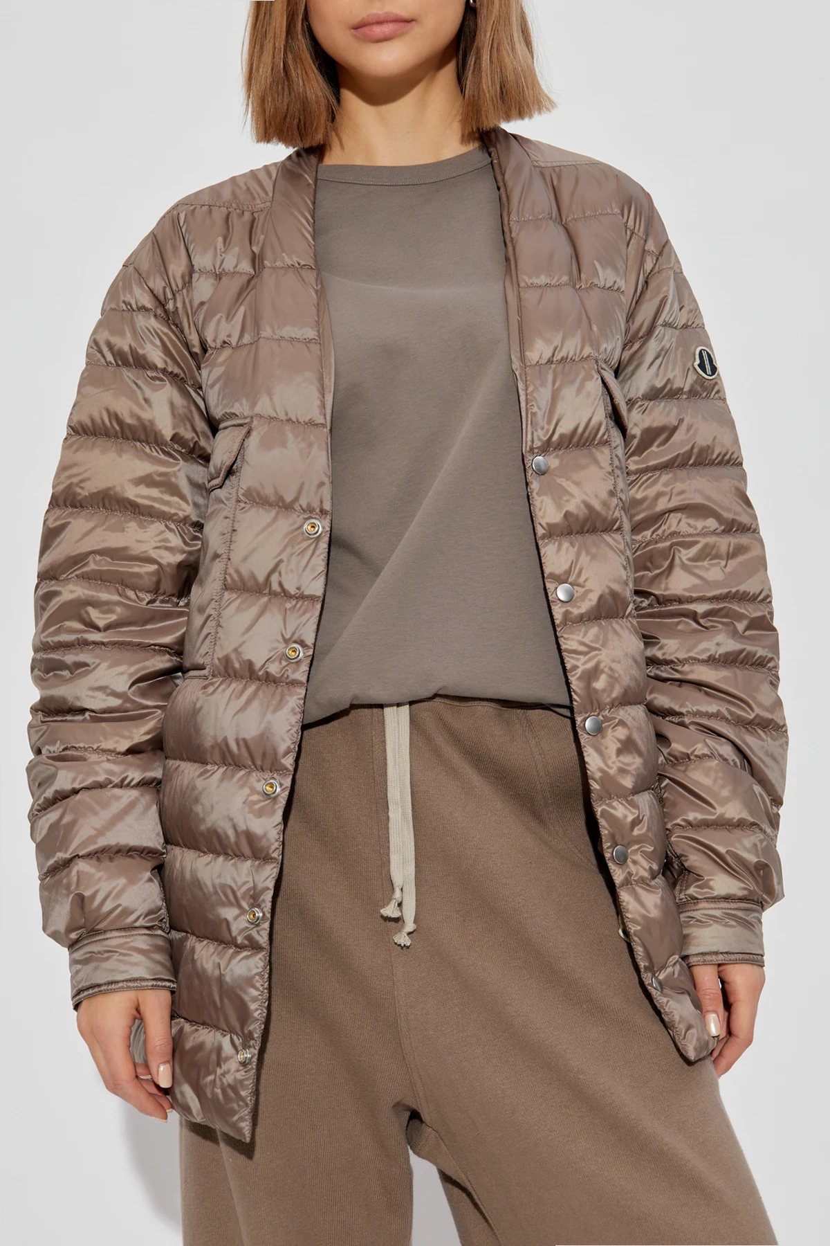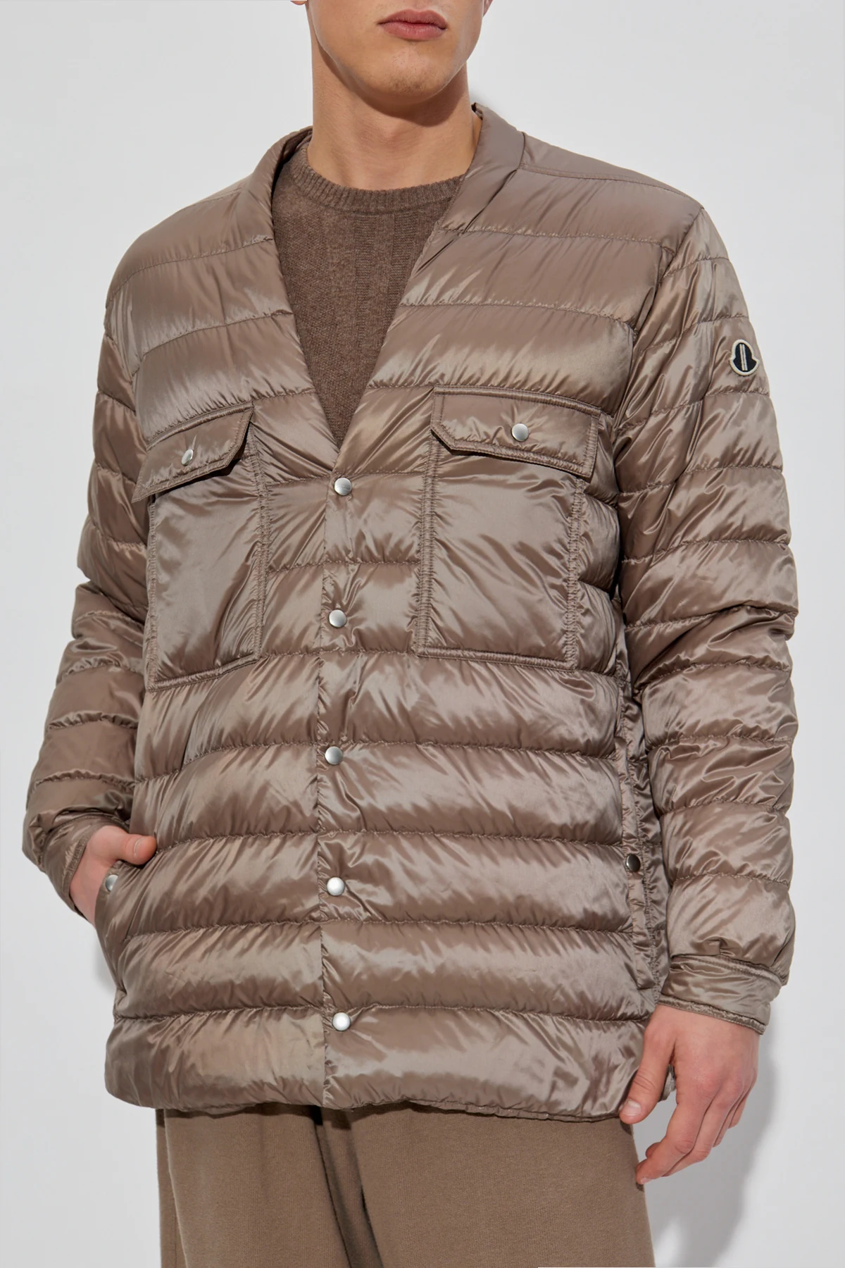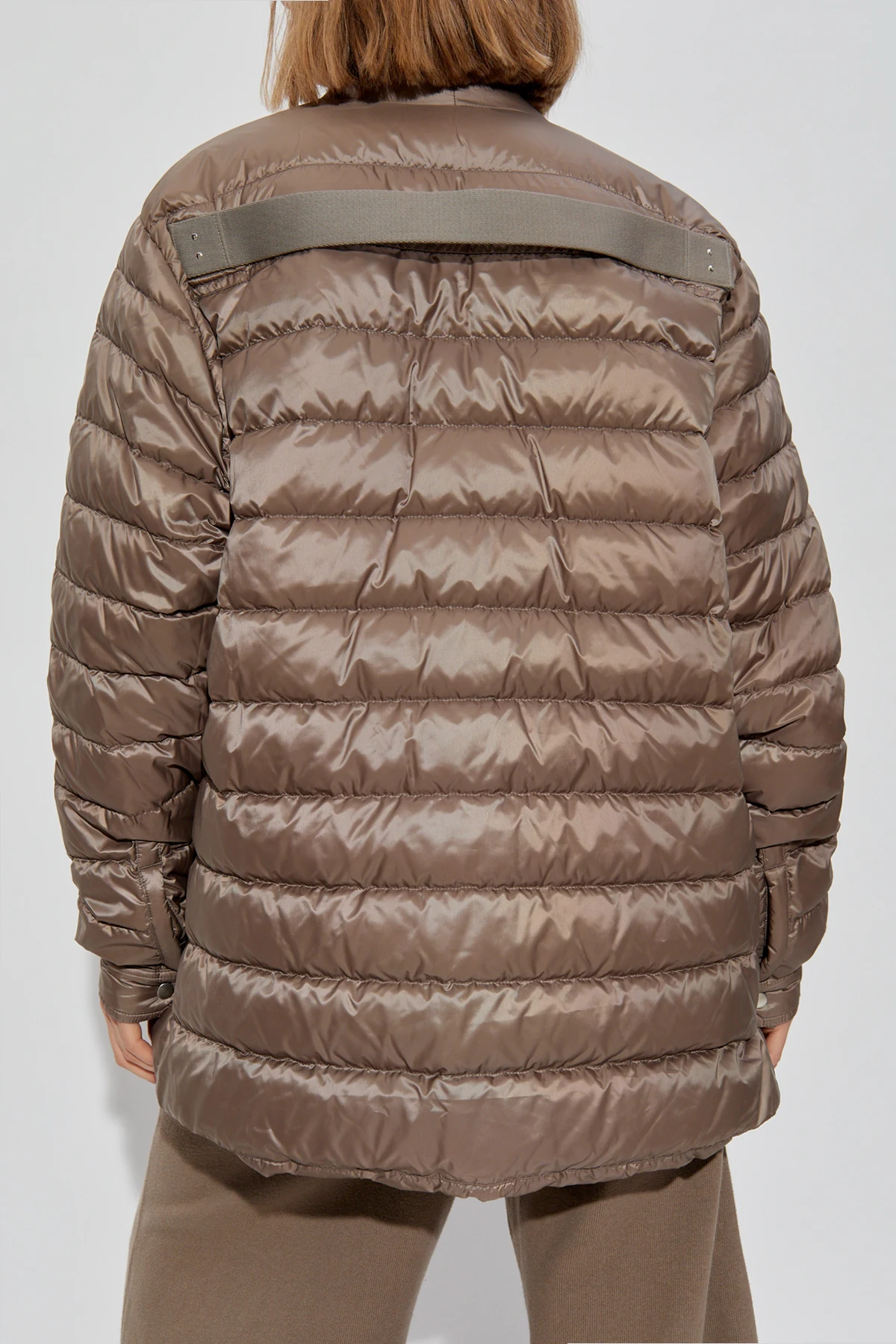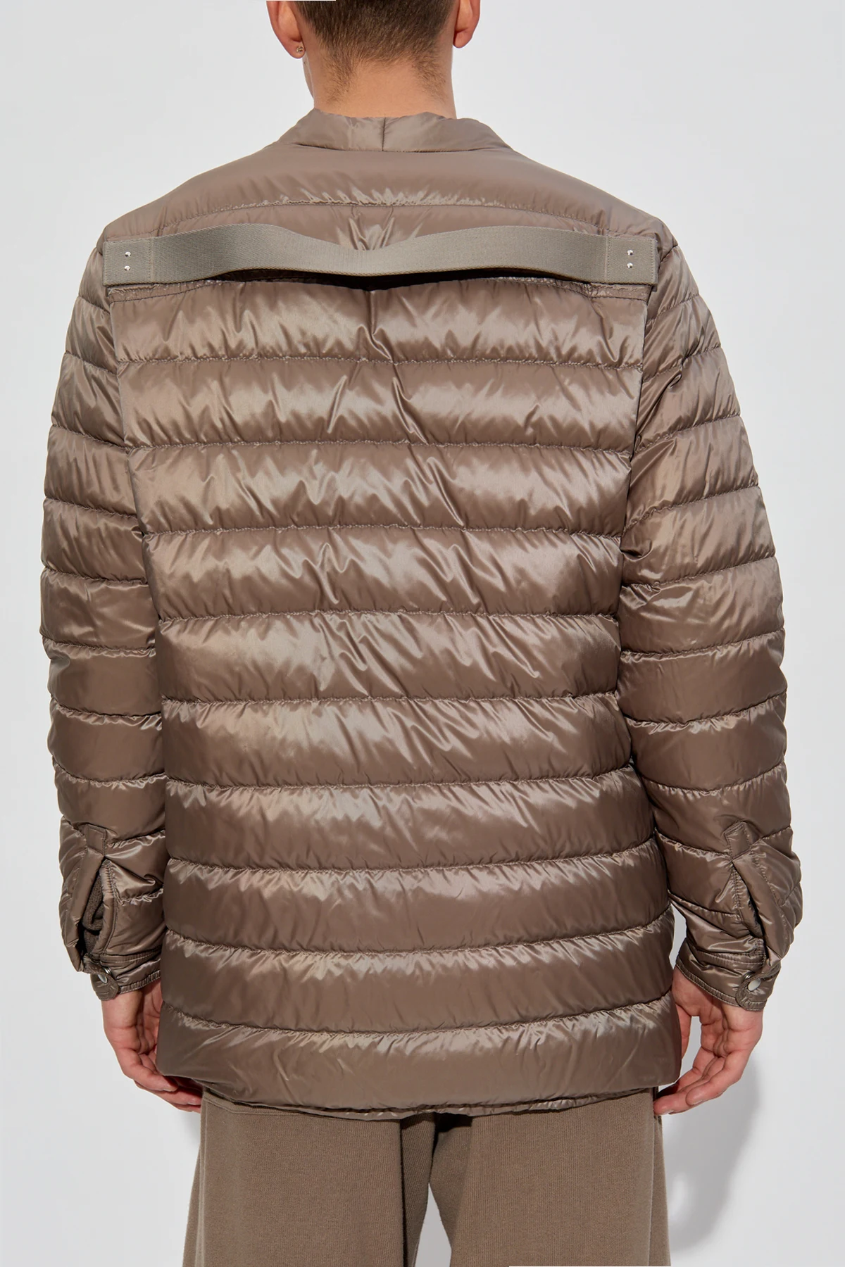Indulge in the epitome of refined outerwear with the Rick Owens x Moncler brown puffer jacket. Crafted with an exquisite blend of materials, this jacket boasts a lustrous polyester exterior that amplifies its sophisticated allure. The horizontally quilted design adds a distinctive touch, reflecting the signature style of Rick Owens, a luminary in contemporary fashion. This unisex jacket features a sleek silhouette with two chest pockets secured by buttons, and an additional pair of pockets, offering practicality and style. The jacket\'s button closure enhances its timeless elegance, while the Moncler logo on the left arm stands as a testament to its prestigious heritage. Perfect for transitional seasons, this jacket, with its long sleeves and unique back panel, merges functionality with avant-garde design, making it a quintessential addition to any wardrobe. Why Choose This Product? Luxurious sheen for a high-end look Functional design with four pockets Iconic Moncler logo for brand authenticity Perfect blend of casual elegance Unisex style, suitable for all fashion-forward individuals