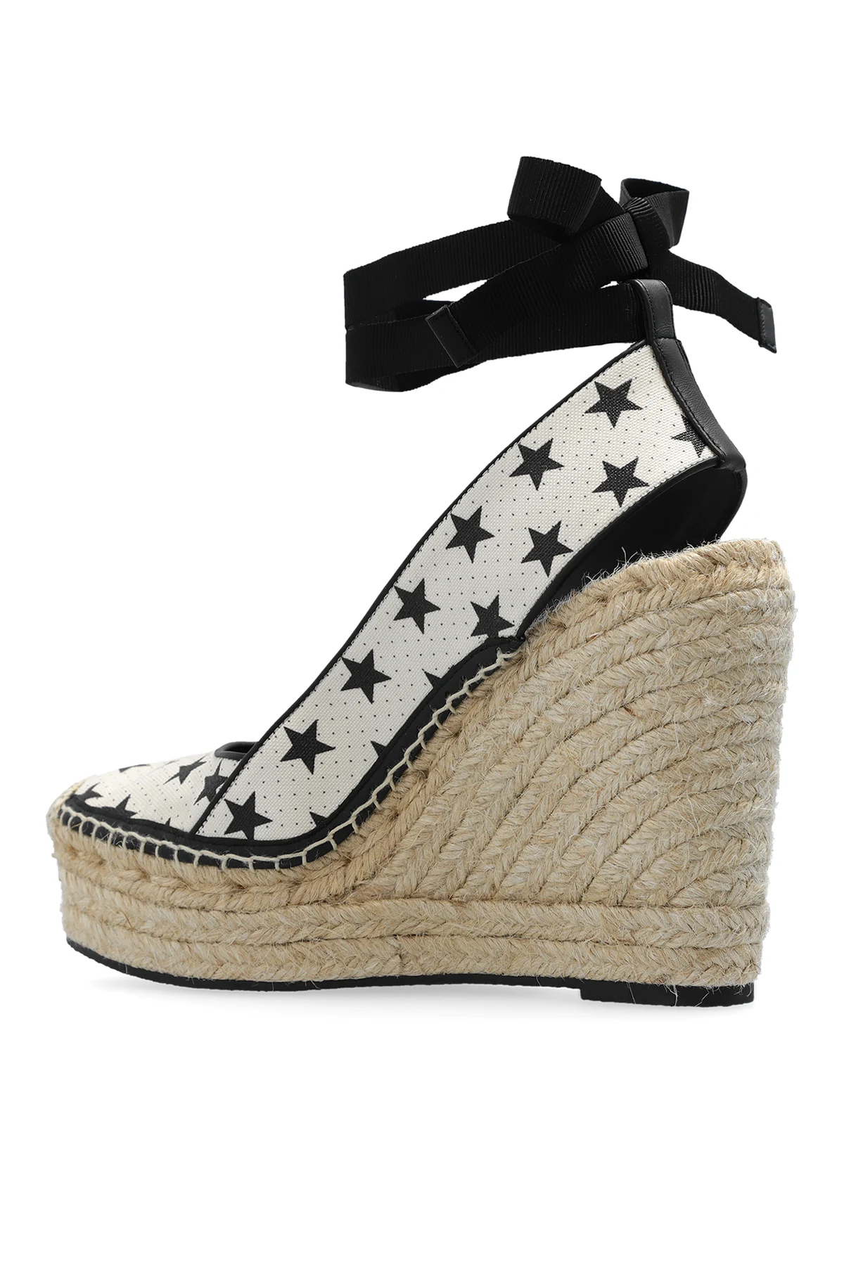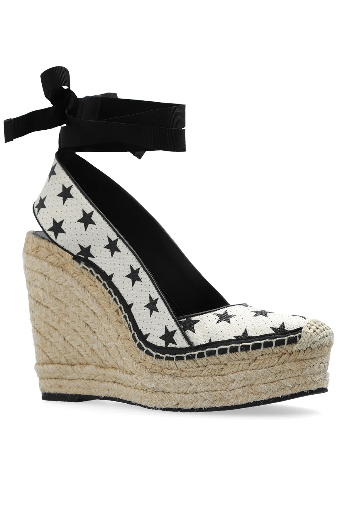 Beige and black ‘Alex’ wedge espadrilles from Balmain. Made from cotton and leather, this model sits on a braided raffia sole with black rubber trim and features a pattern with stars and a lace-up fastening at the ankle.