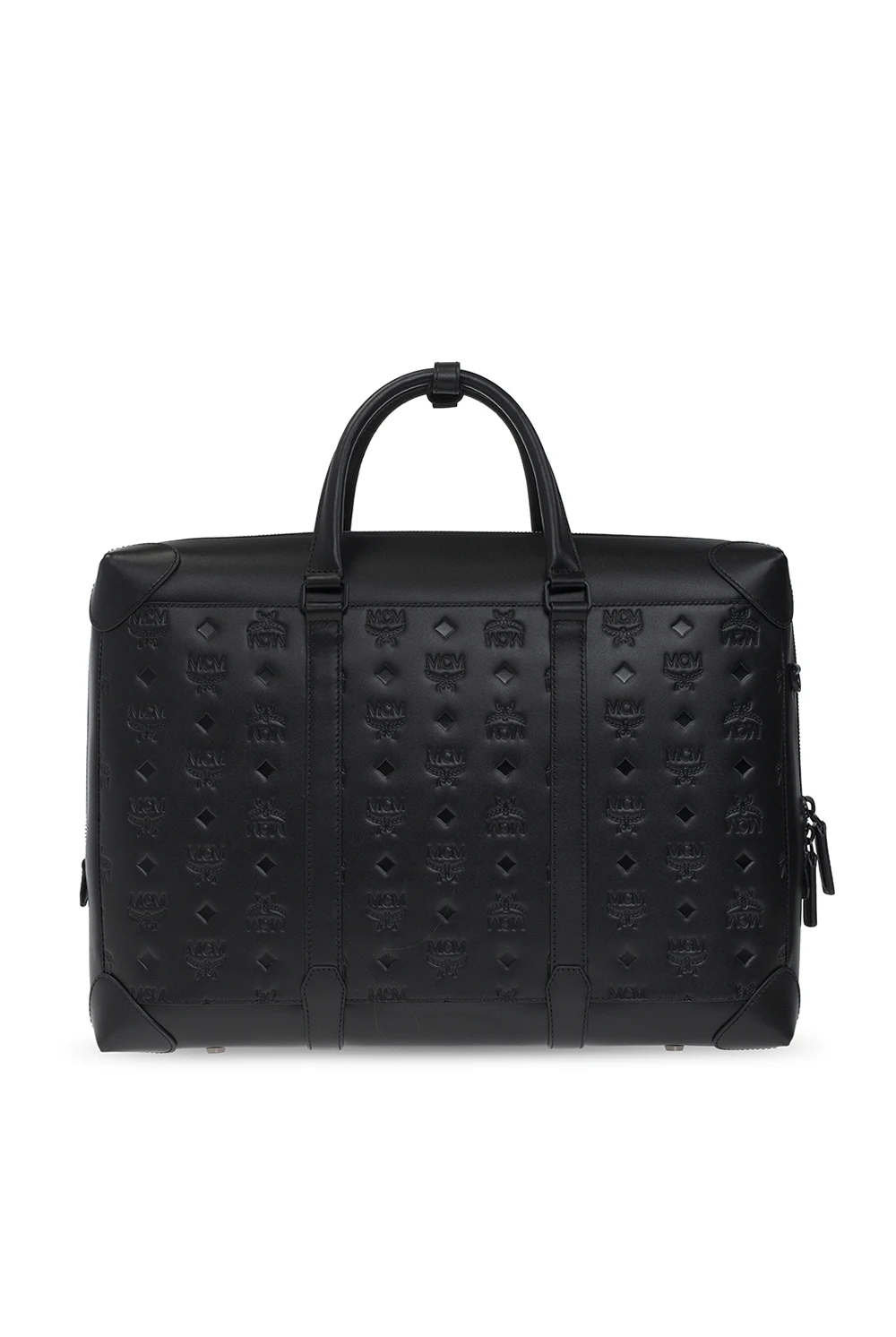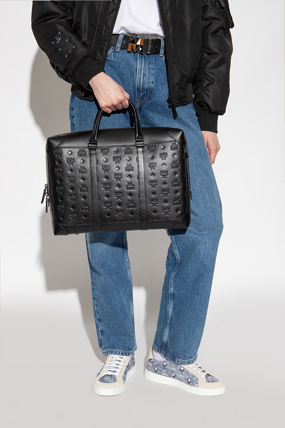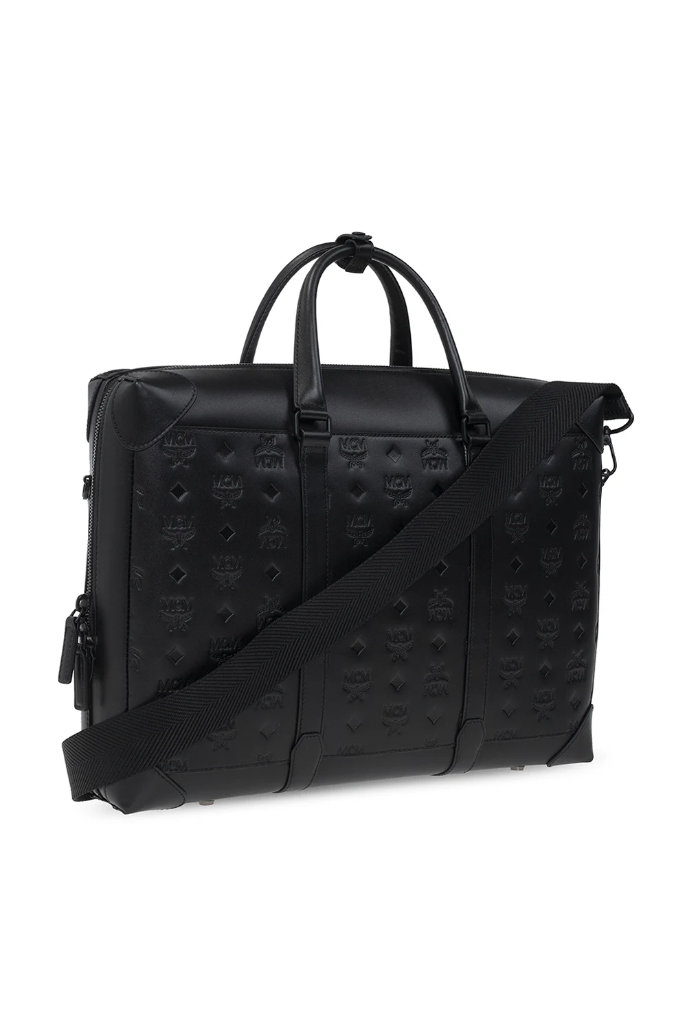 Black ‘Soft Berlin’ shoulder bag from MCM. Crafted from bovine leather, this model features a two-way zip, embossed Visetos pattern, two half-round handles, detachable and adjustable strap, metal black hardware with a matte finish, one internal compartment with cotton lining, laptop compartment and three slip pockets inside.