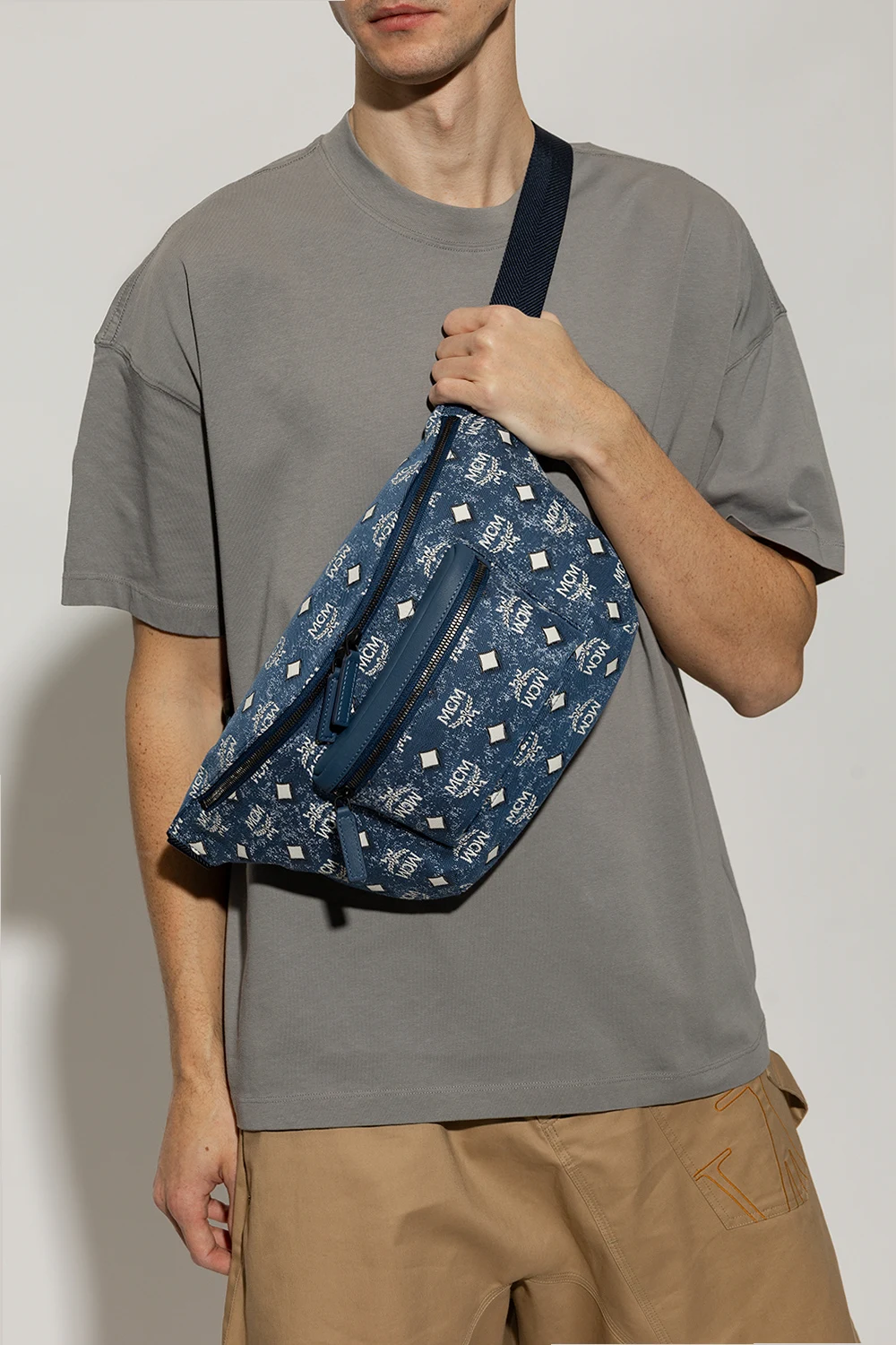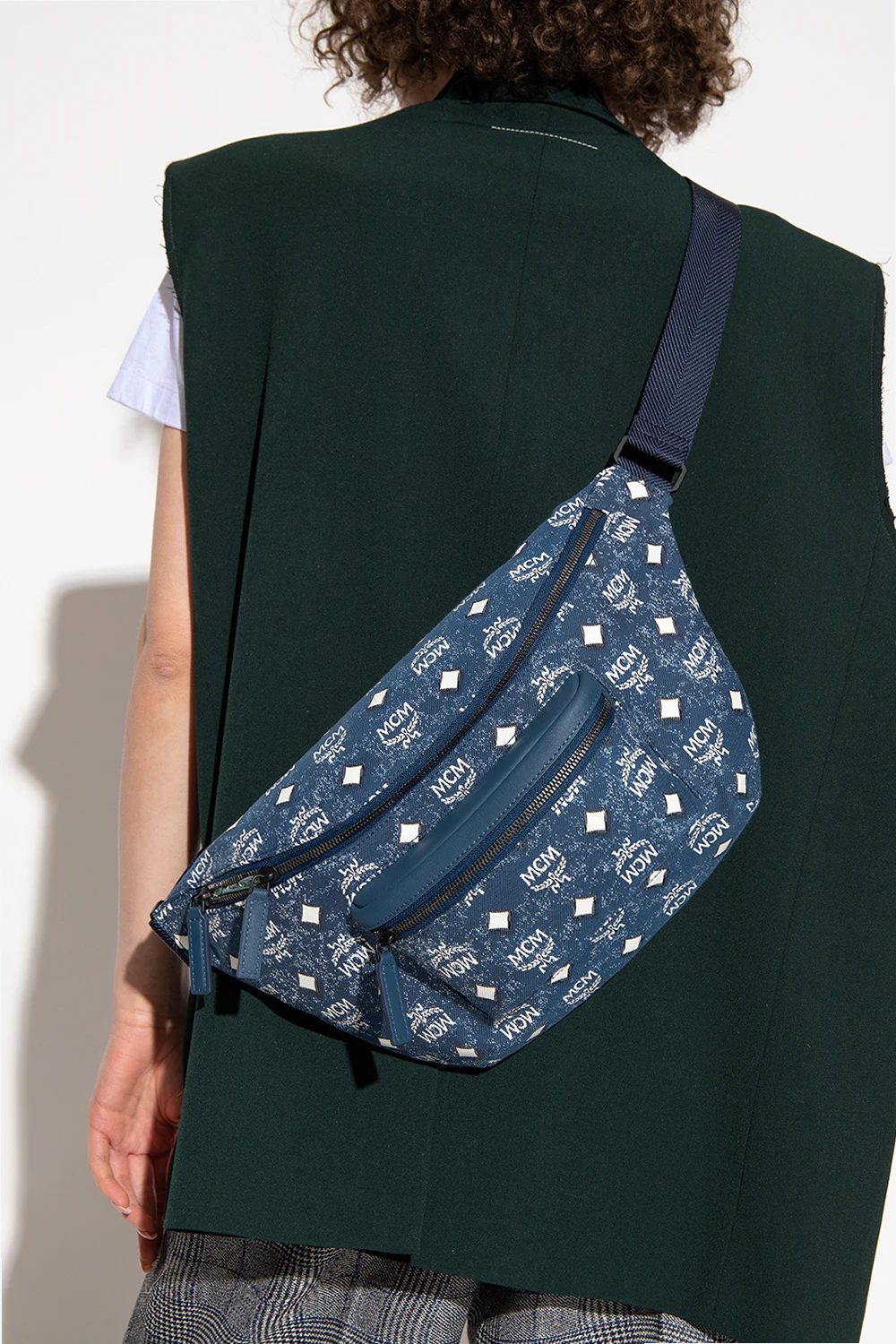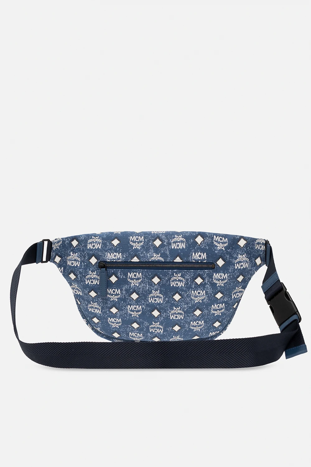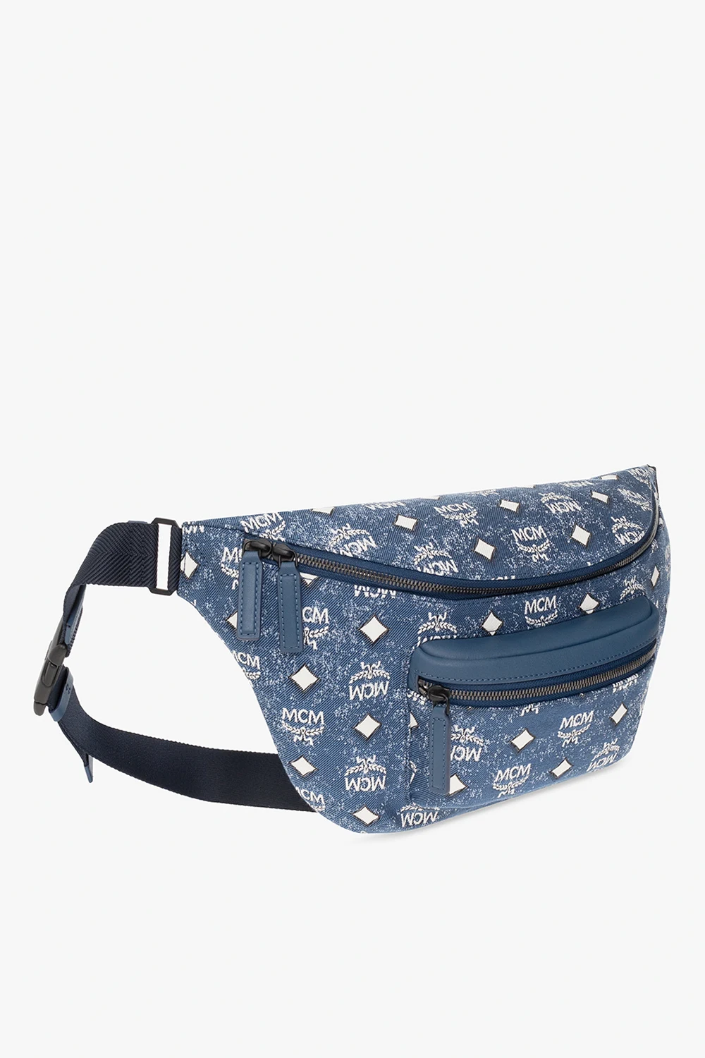 Blue ‘Fursten’ belt bag from MCM. Made of Italian denim with a jacquard monogram pattern and leather trimming, this model features zip fastening, front and back zip pocket, adjustable buckle belt and silver-tone metal hardware.