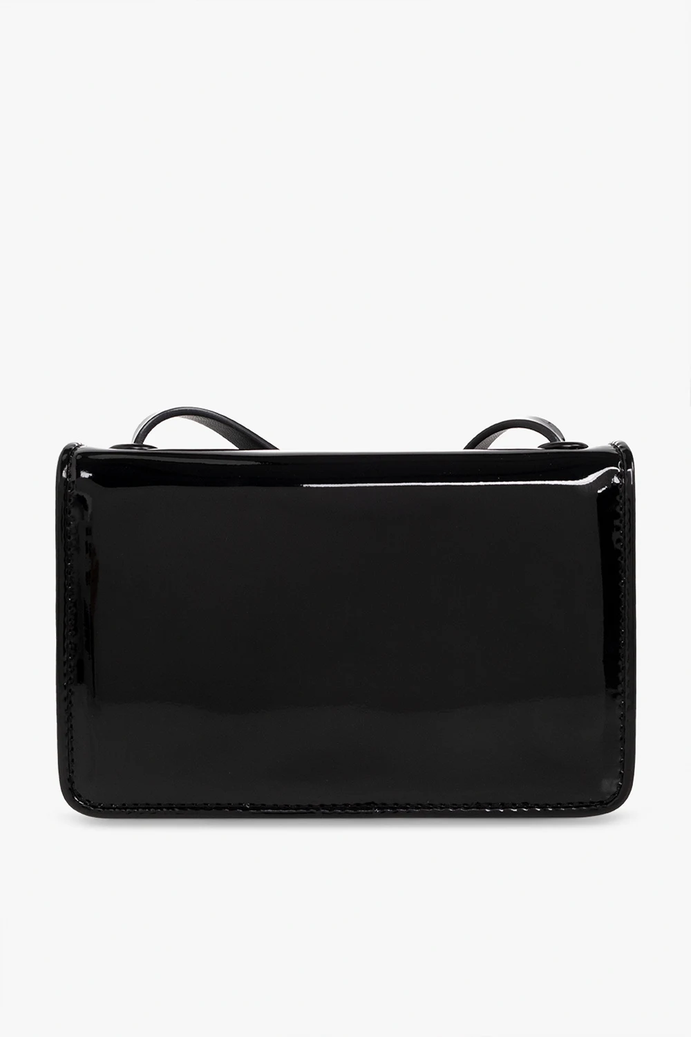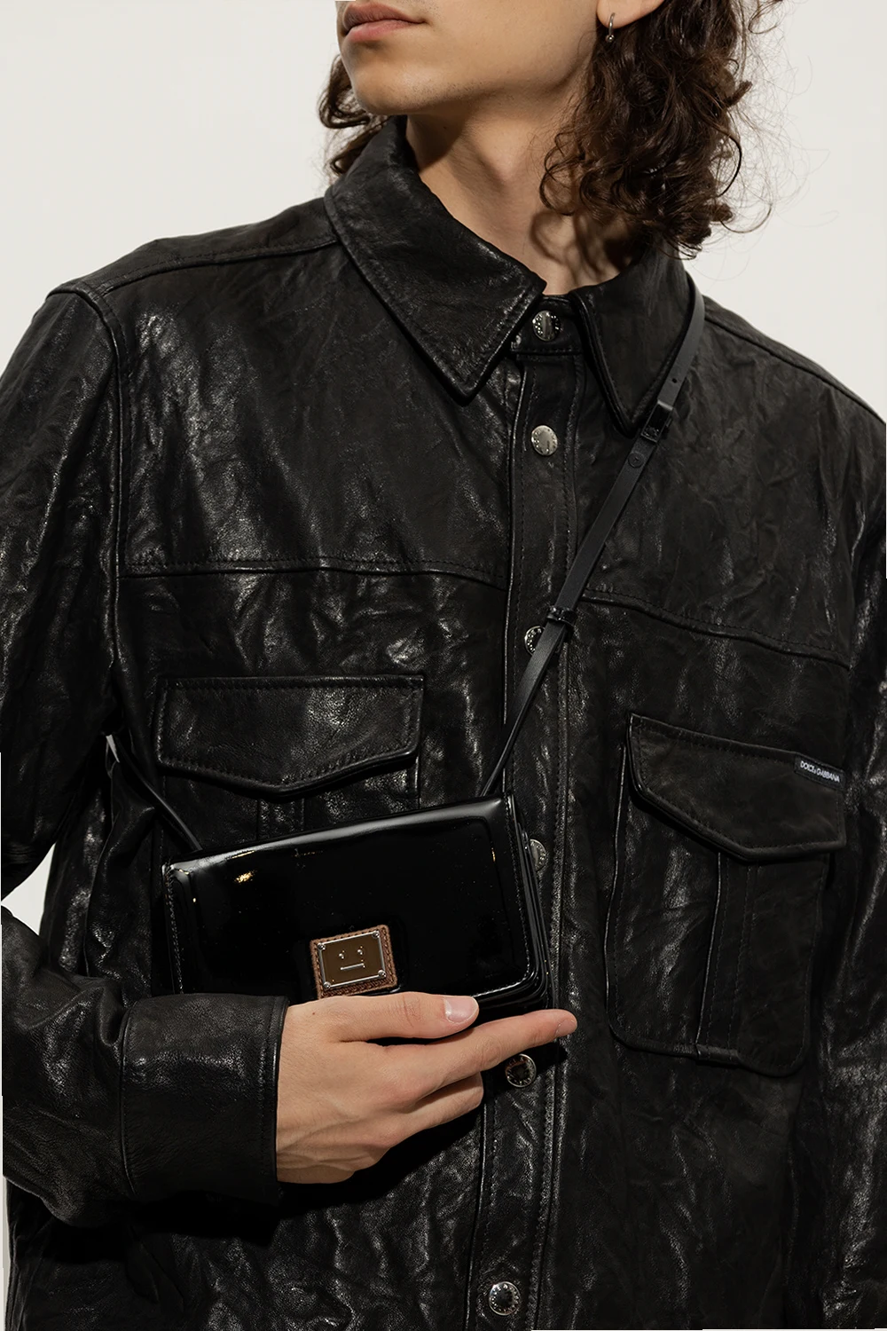 Black shoulder bag from Acne Studios. Crafted from glossy faux-leather, this design secures with a snap and features a frontal patch with a brown metal Face logo plaque, a detachable and adjustable shoulder strap, silver-tone metal hardware and a divided interior with a zipped compartment and one card slot.