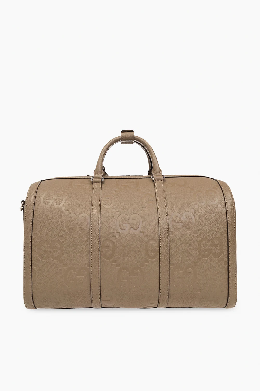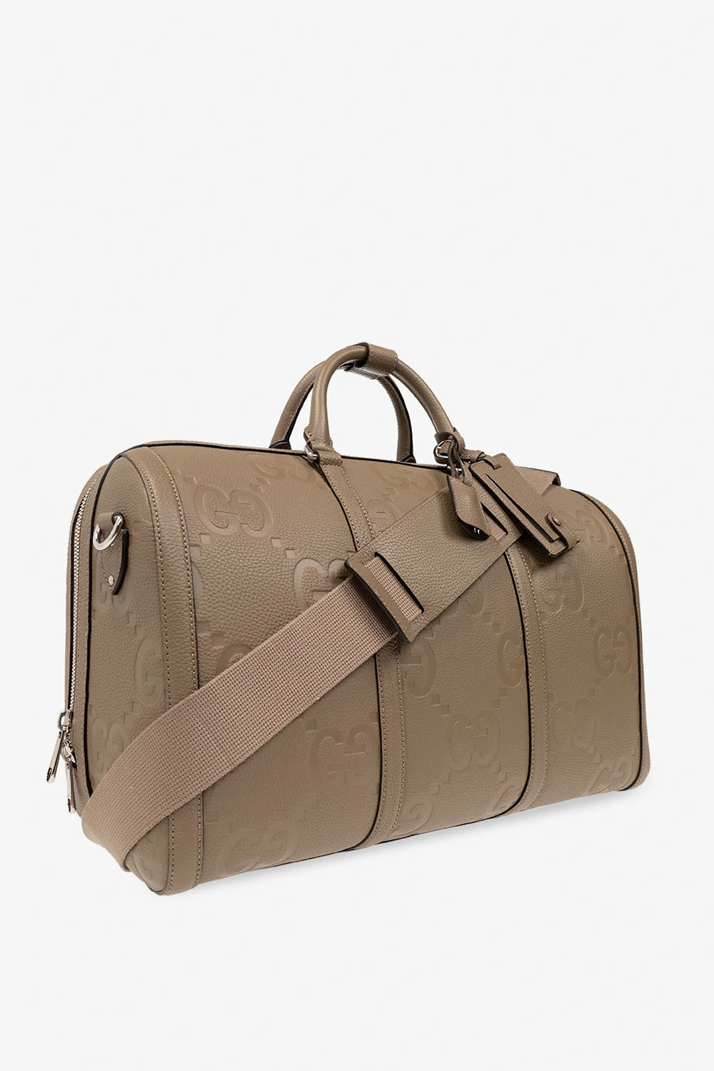 Brown holdall bag from Gucci. Made of calf leather, this design features a two-way zip, monogram pattern, two half-round handles, detachable shoulder strap, silver-tone metal hardware and one internal compartment and four zip pockets.