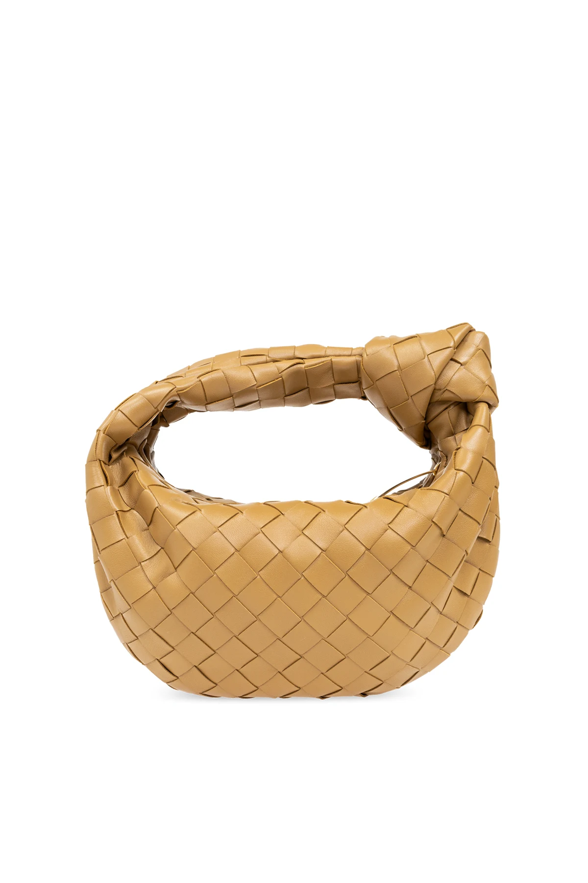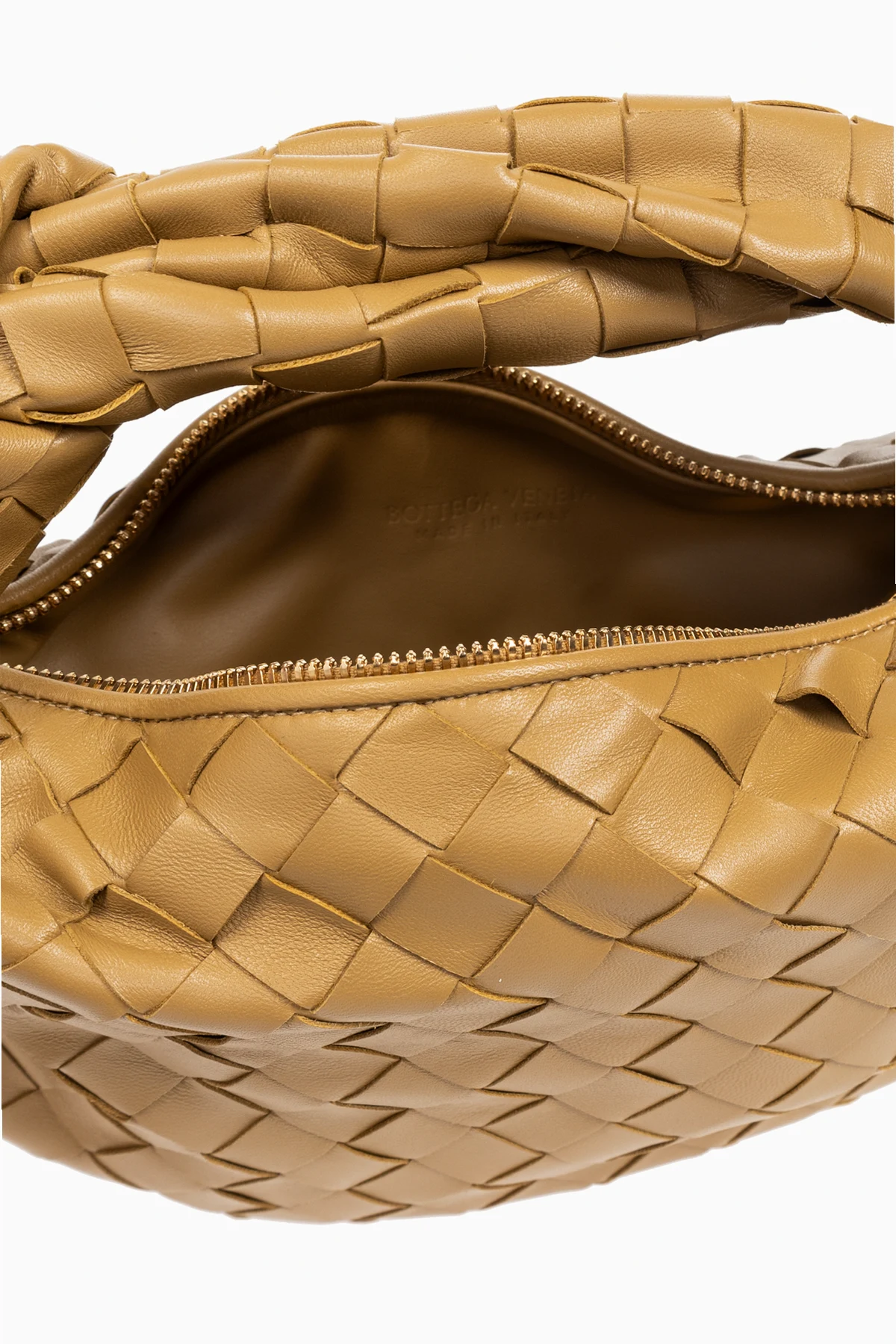 Introducing the \"Jodie Mini\" handbag by Bottega Veneta, a paradigm of sophisticated design and exquisite craftsmanship. This handbag, characterized by its distinctive crescent shape and luxurious beige hue, is meticulously crafted from 100% woven leather, presenting an elegant texture that is both visually appealing and pleasantly tactile. The bag\'s closure features a gleaming gold zipper that gracefully traces the upper edge, complementing its refined aesthetic. The interior, lined in a material that mirrors the bag\'s exterior color, is adorned with the embossed logo of the designer, signifying its status as part of an exclusive collection. The handle, also fashioned from the signature woven leather, is accentuated by a decorative knot, enhancing the bag\'s elegance while reinforcing its structure. This thoughtful detail allows the \"Jodie Mini\" to be comfortably carried over the shoulder or by hand, making it a versatile addition to any ensemble. Why Purchase the \"Jodie Mini\" Handbag? Elegance and Exclusivity: Crafted by Bottega Veneta, a name synonymous with luxury and sophisticated style. Superior Craftsmanship: Made from 100% premium woven leather, offering a unique texture and durable quality. Versatile Design: Its crescent shape and decorative knot detail on the handle add character and elegance, suitable for any occasion. Functional Features: Equipped with a secure gold zipper closure and an interior compartment for essentials.