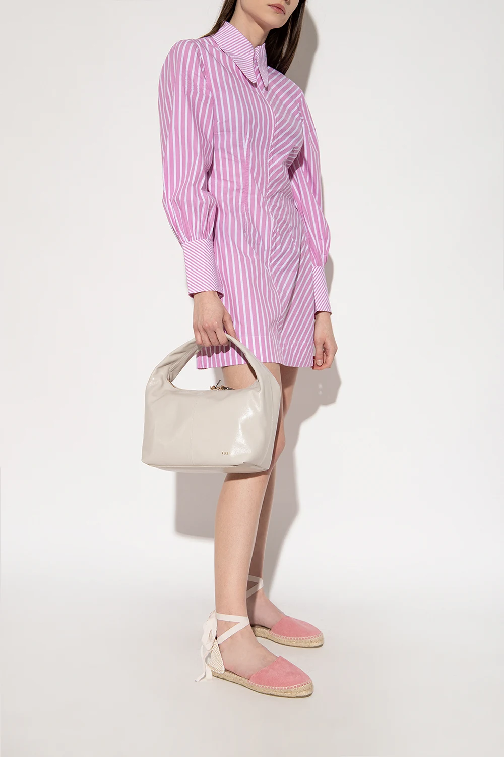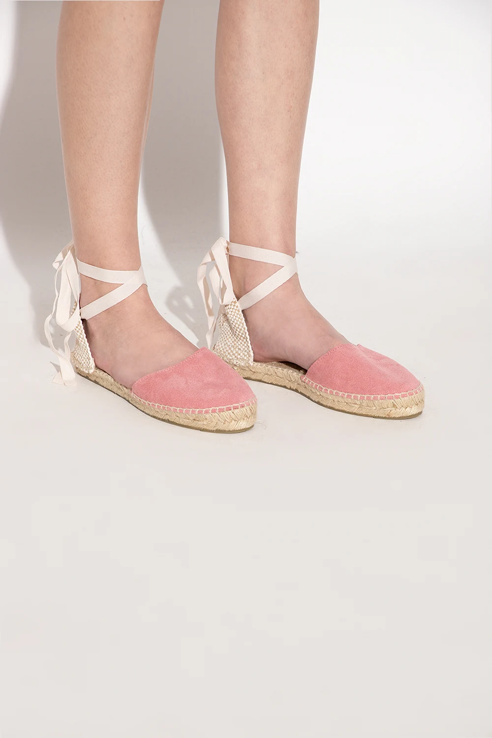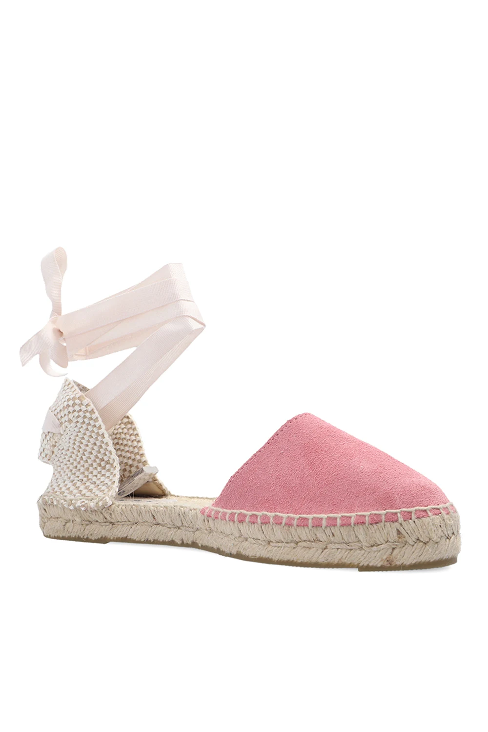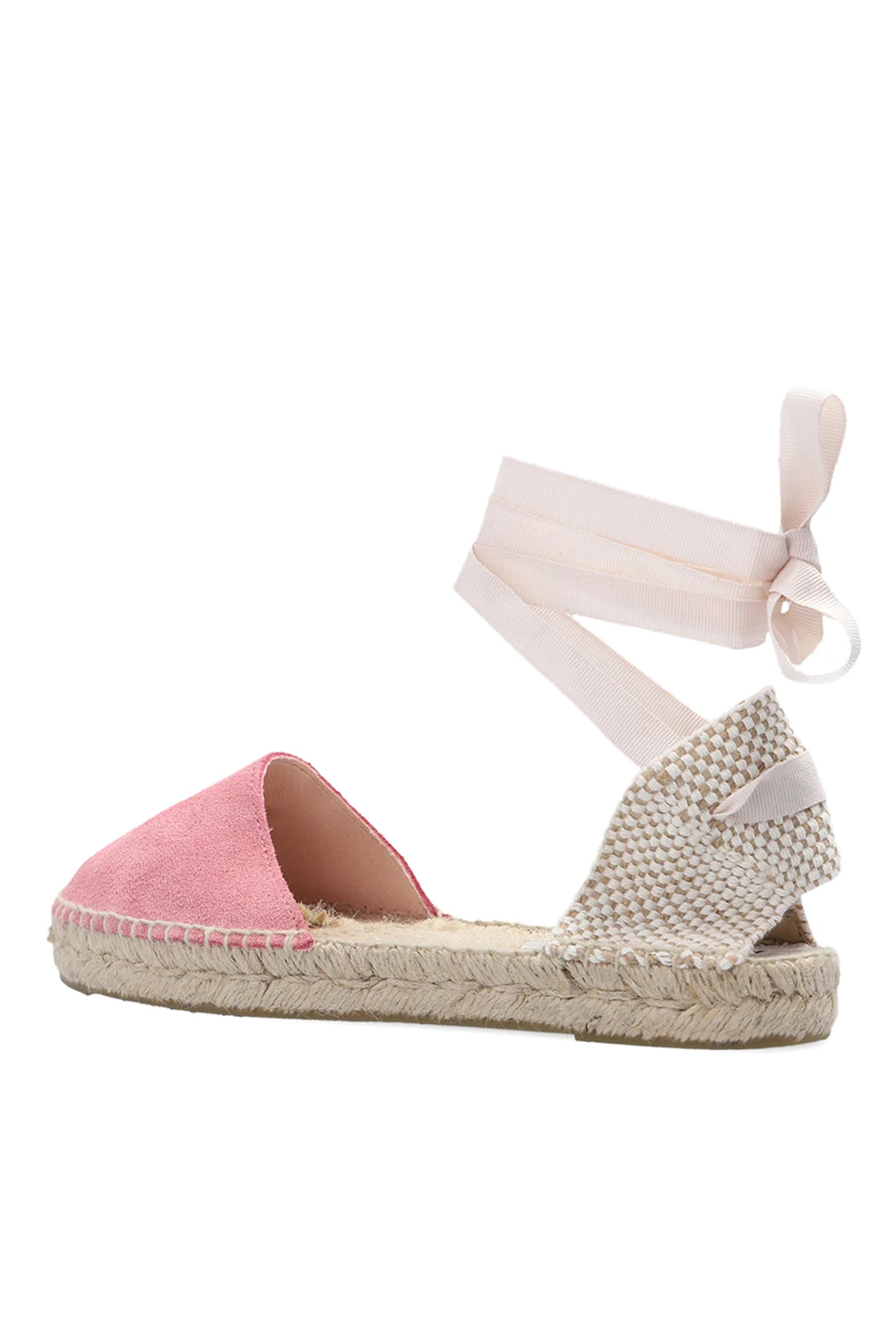 Pink, beige and white ‘Valenciana’ espadrilles from Manebi. Made of suede, this model features white grosgrain tie closures at the ankle and a natural jute sole with a thin rubber layer in beige.