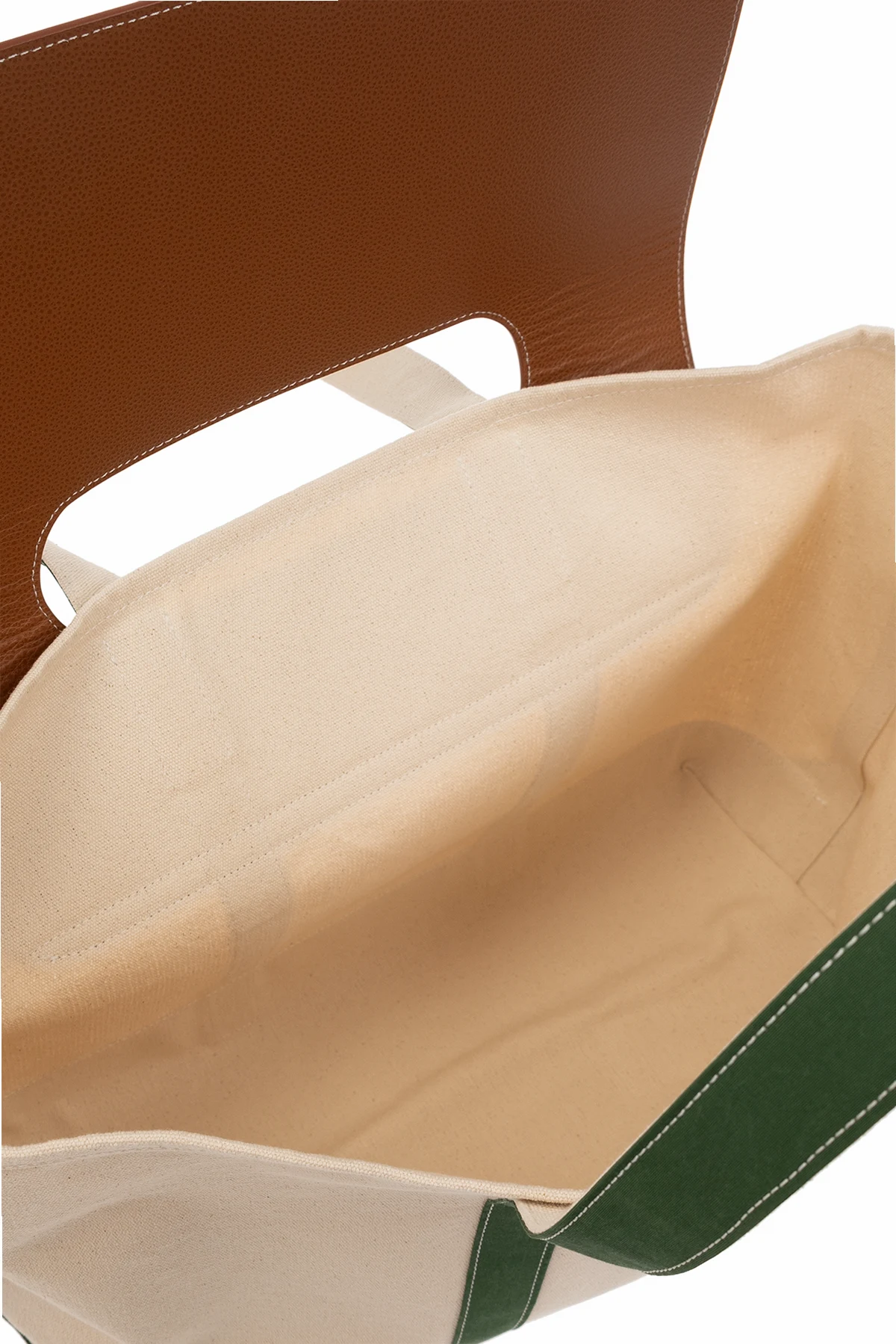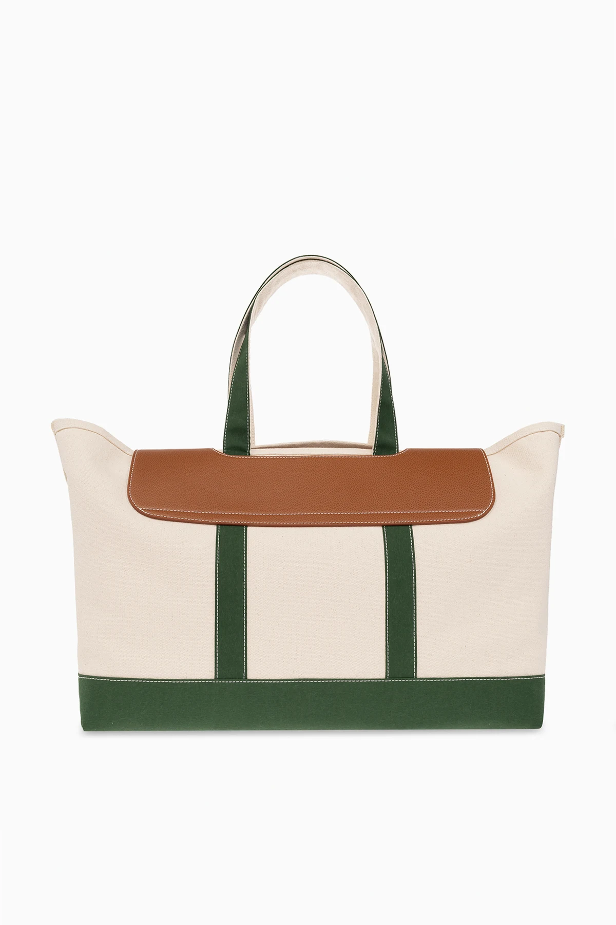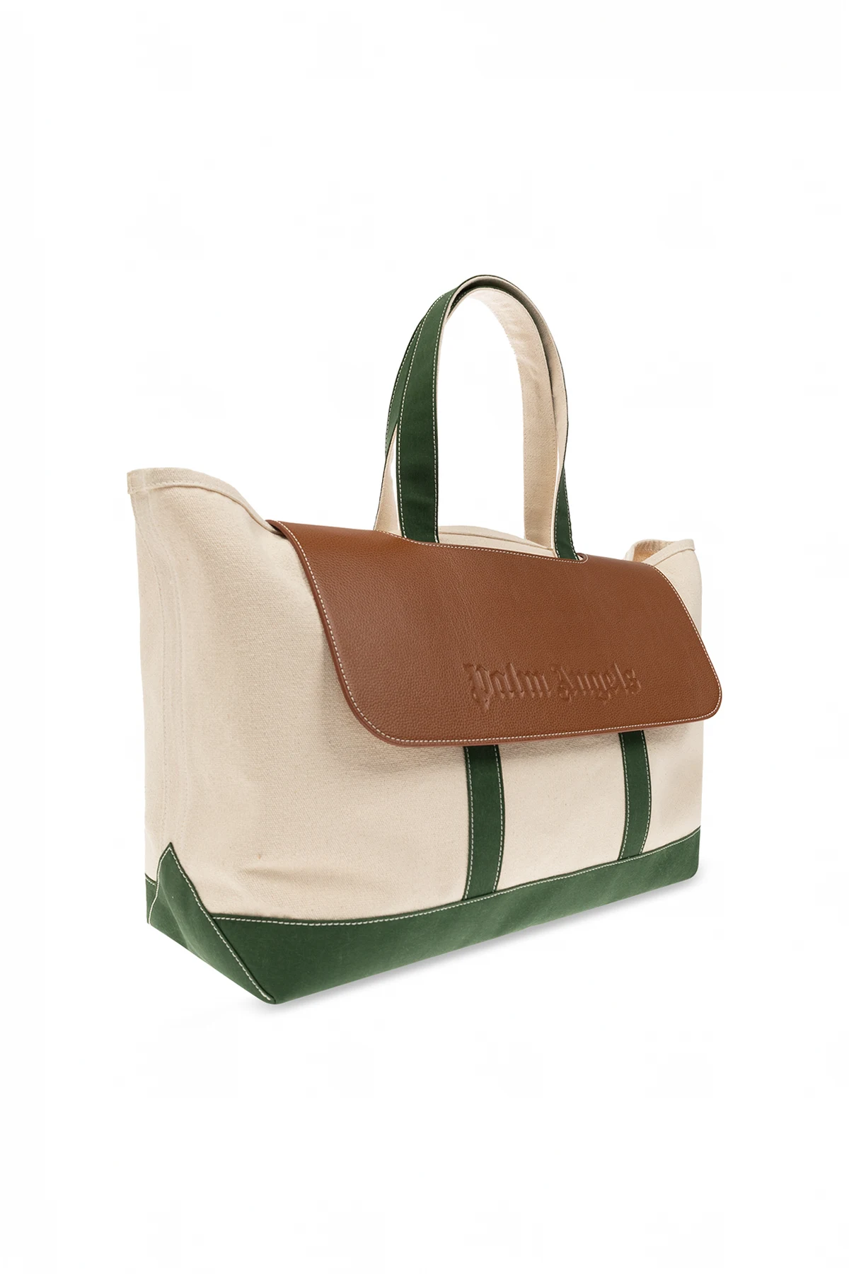 Beige, green and brown travel bag from Palm Angels. Made of leather and fabric, this model features a flap, two half-round handles and one internal compartment.