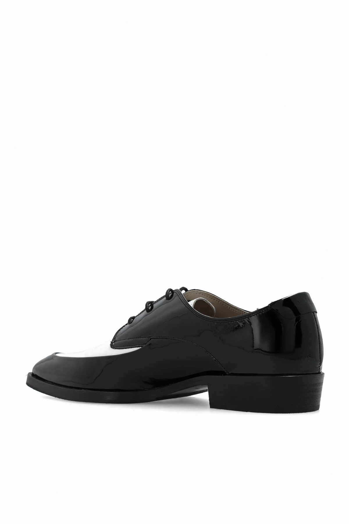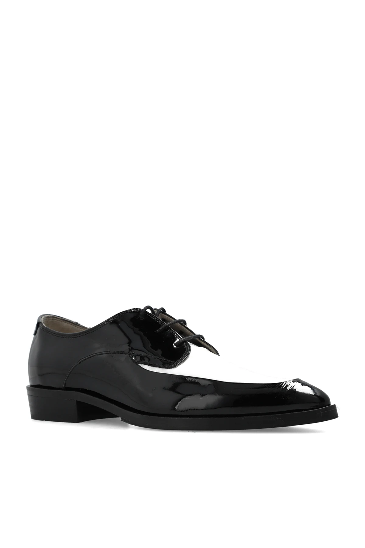 Black and white ‘Lex\' derby shoes from AllSaints. Made of patent leather, this pointed toe pair rests on a black sole in leather and rubber.