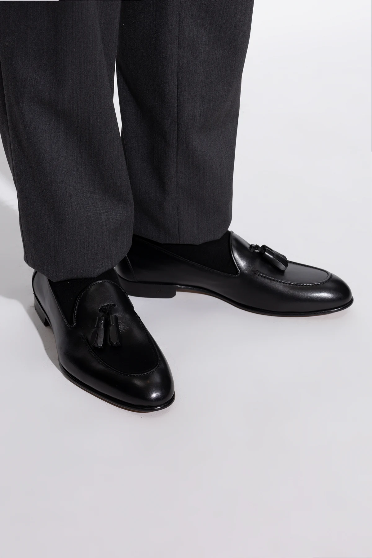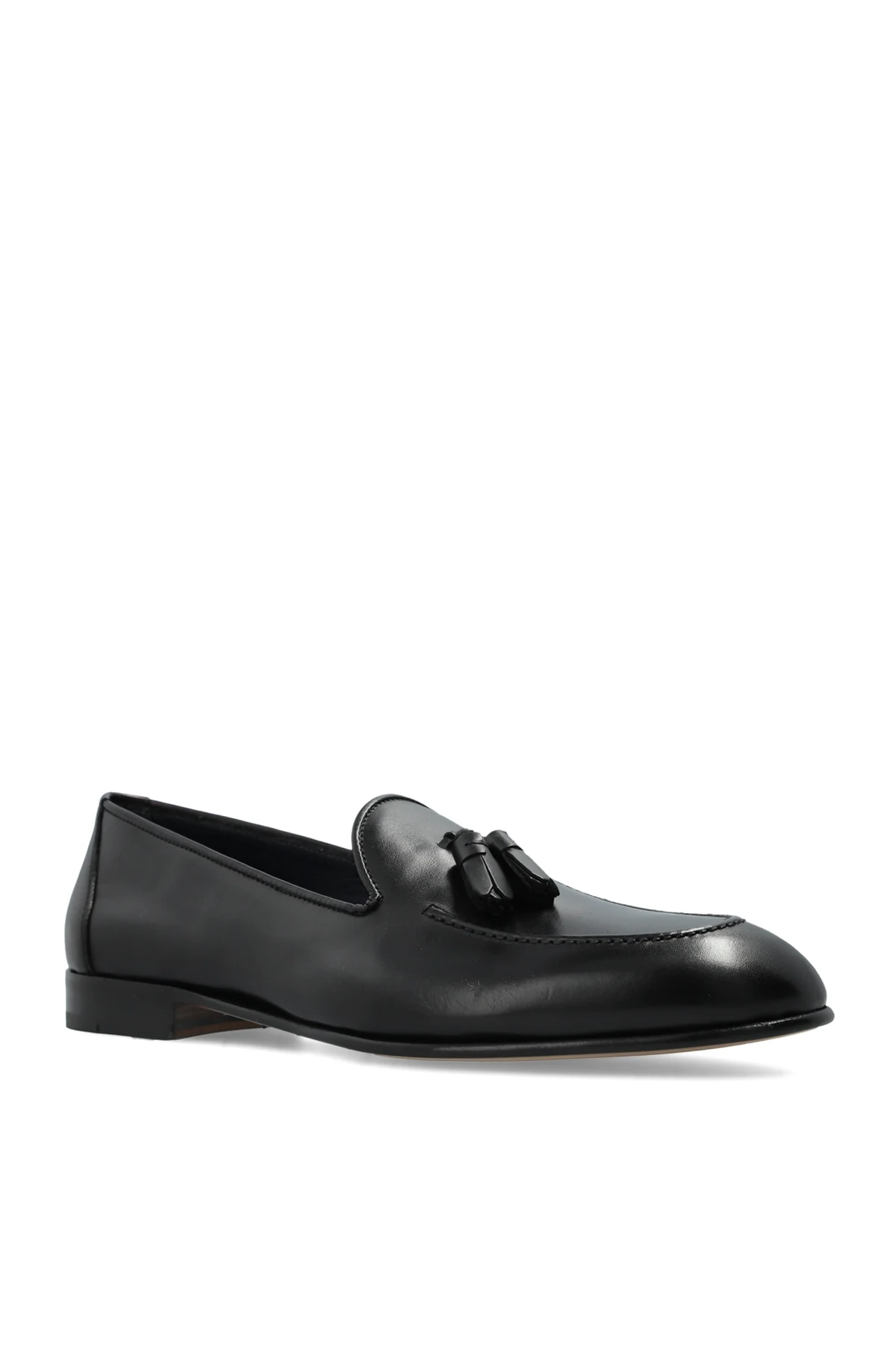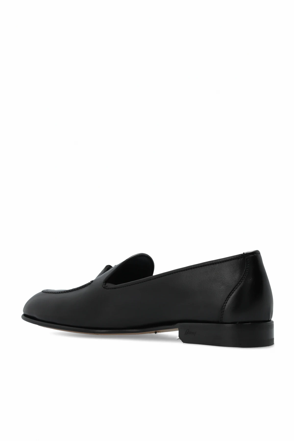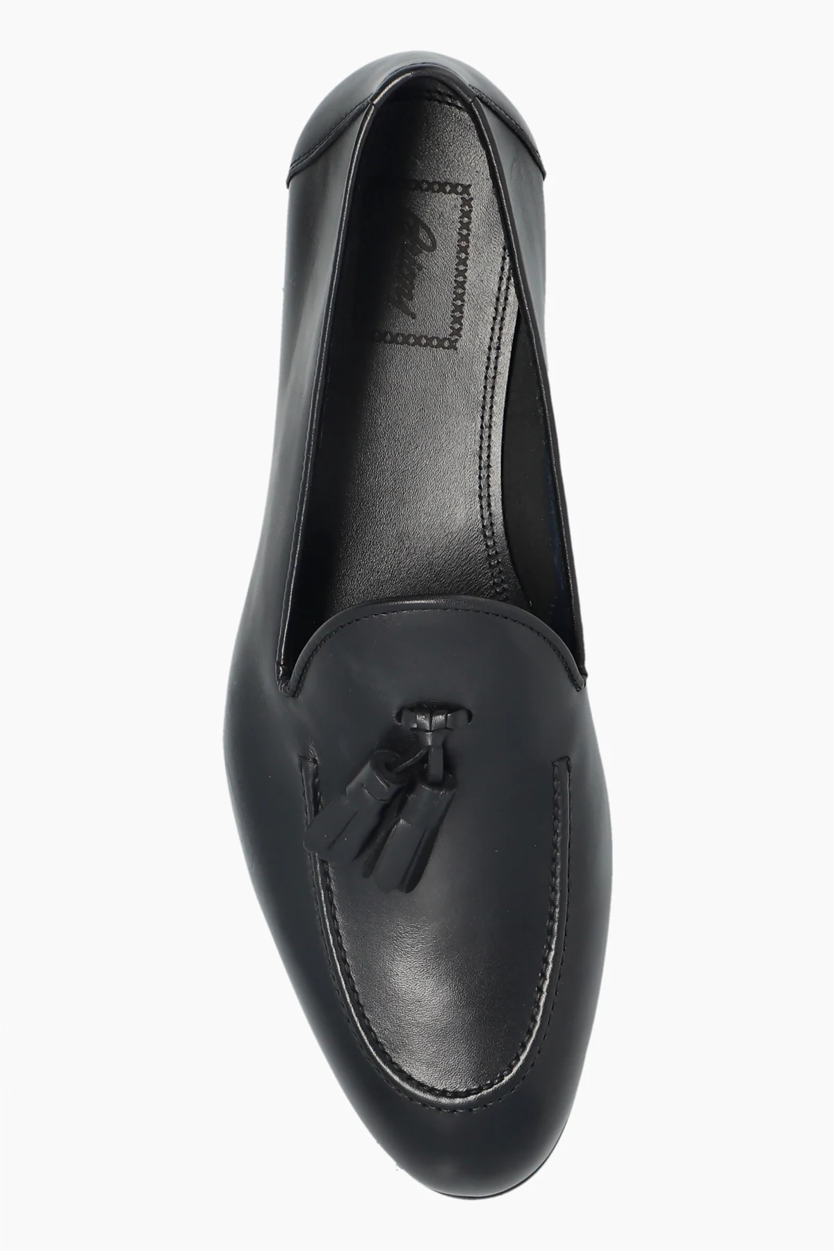 Indulge in the epitome of luxury with these exquisite leather loafers by Brioni. Crafted with precision from smooth, high-quality leather, these loafers exude sophistication and elegance. The classic design, featuring a low heel, is tailored for formal occasions, yet versatile enough to complement more casual, elegant ensembles. A decorative tassel graces the front, adding a touch of timeless charm, while the thin, flat sole epitomizes the quintessential loafer style. The dominant black hue renders these shoes universally appealing, seamlessly integrating into any refined wardrobe. Why Choose This Product? Designed by the renowned Brioni, synonymous with Italian luxury and craftsmanship. Made from 100% high-quality leather, ensuring durability and a polished look. Classic and versatile design, suitable for both formal and elegant casual wear. Features a decorative tassel, enhancing its classic appeal.