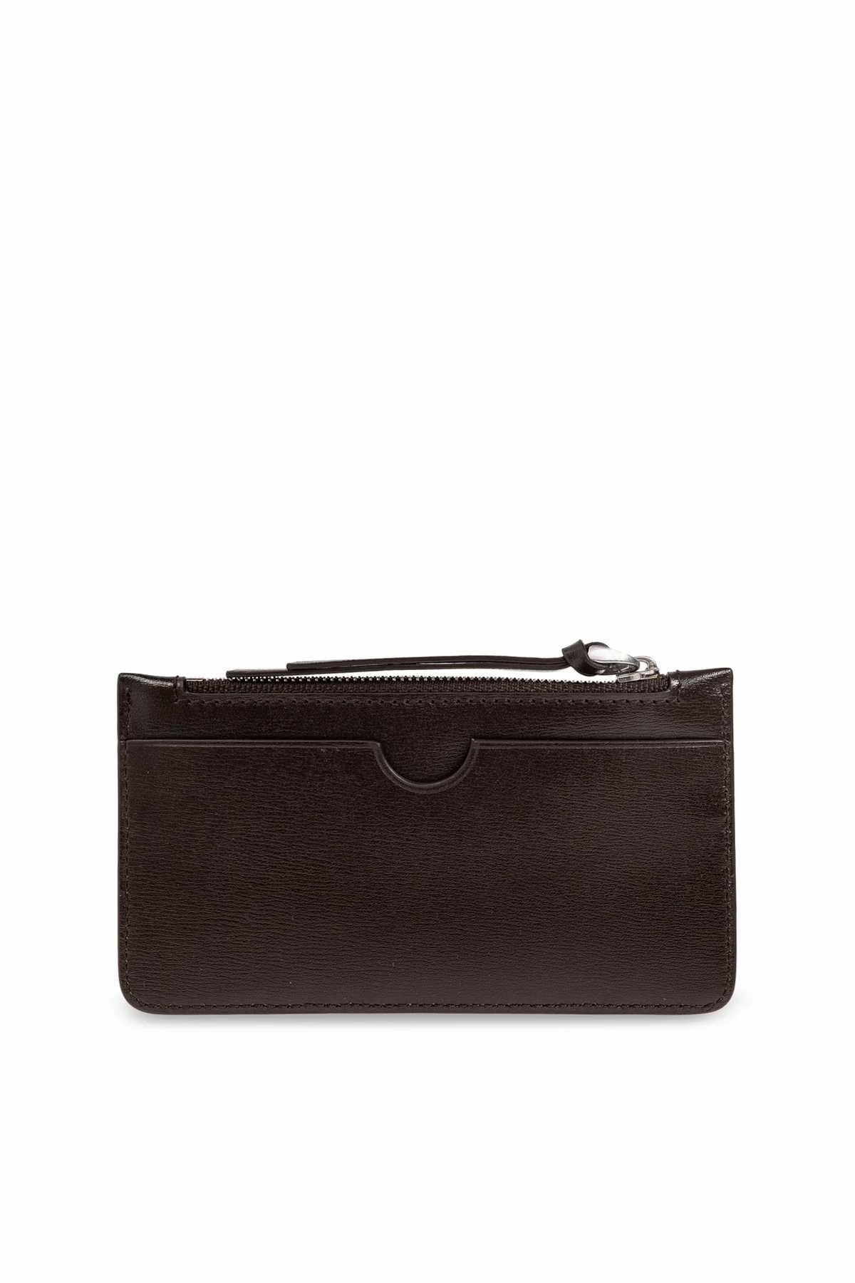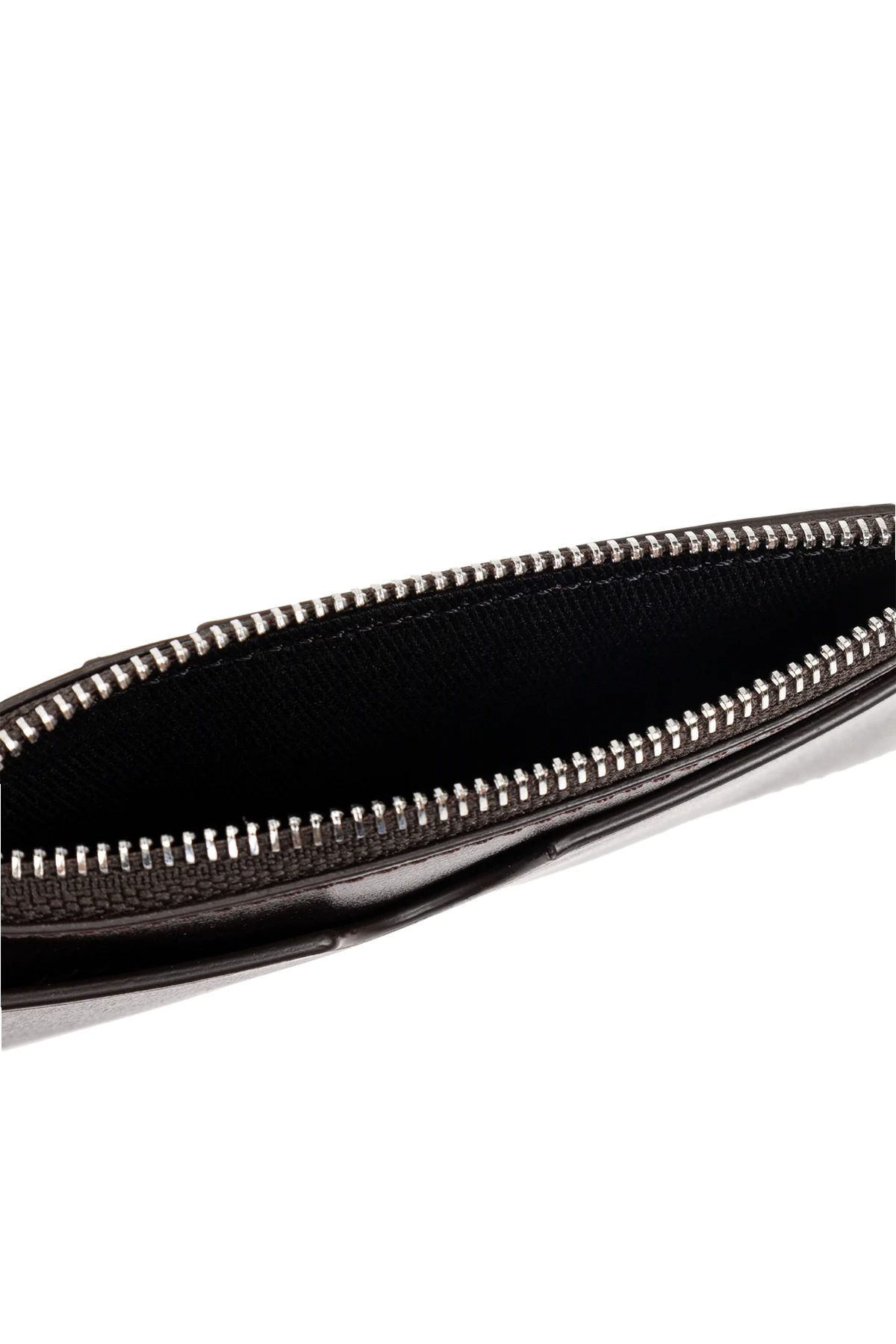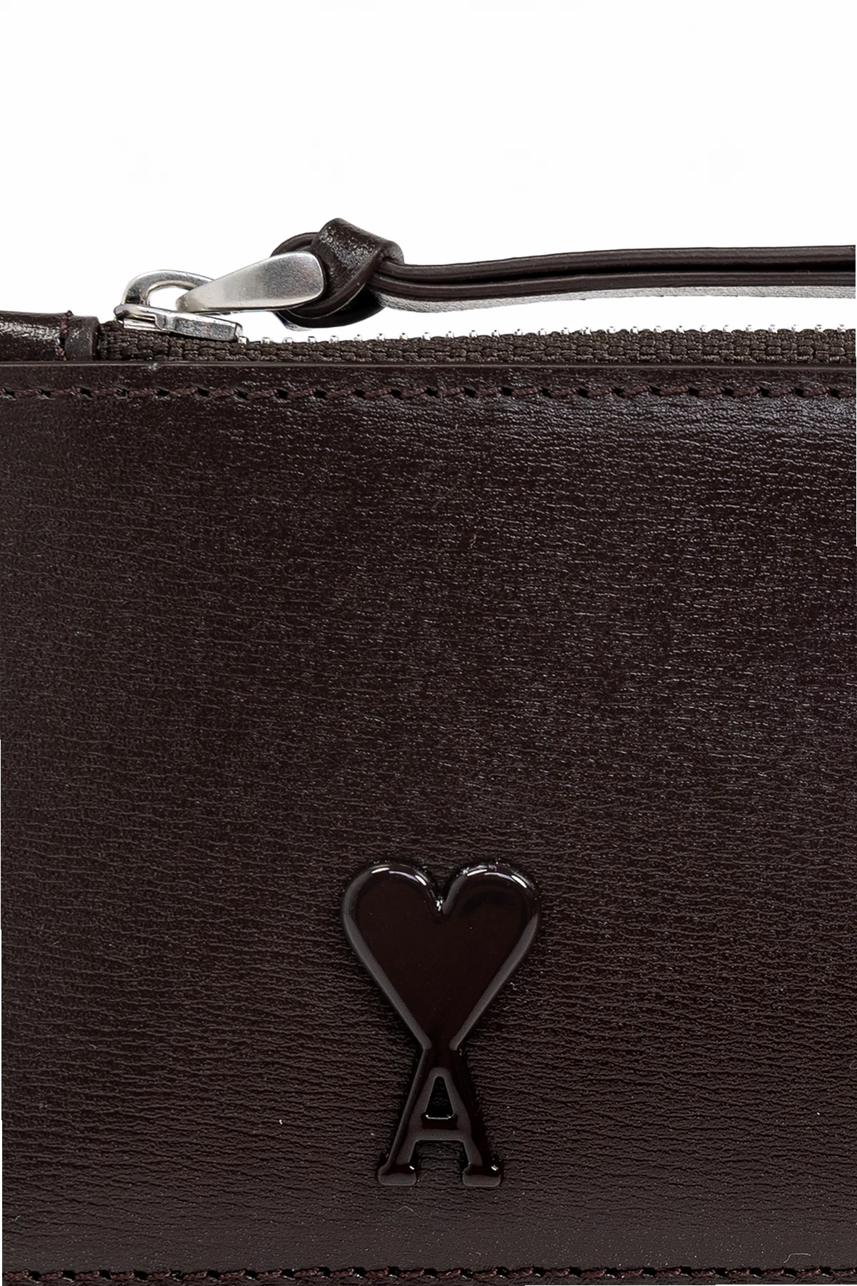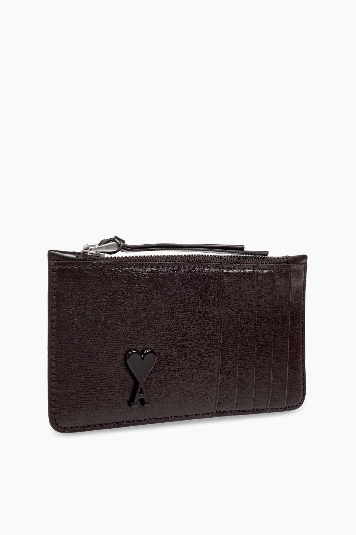 Introducing the Leather Card Holder from the exclusive collection by Ami Alexandre Mattiussi. This exquisite accessory is meticulously crafted from premium leather, exuding an air of sophistication and durability. The card holder boasts a rectangular, compact shape that is perfect for storing credit cards or business cards. Its smooth, elegant surface is free of additional patterns, ensuring a timeless and refined appearance. The front of the card holder features a debossed heart-shaped logo with an \"A\" beneath it, adding a subtle touch of branding. With five card slots on the front and a zipper closure on the top, this holder is designed for both style and functionality. The zipper compartment is ideal for securing small items, while the back pocket offers quick access to frequently used cards. In a rich, dark brown hue, this card holder is the epitome of classic elegance. Its thoughtful design and high-quality materials make it a must-have for anyone who values both aesthetics and practicality. Why Choose This Product? Crafted from high-quality leather for long-lasting use Elegant and timeless design suitable for any occasion Features five card slots and a zipper compartment for added functionality Back pocket for quick access to essential cards Debossed heart-shaped logo adds a touch of unique style