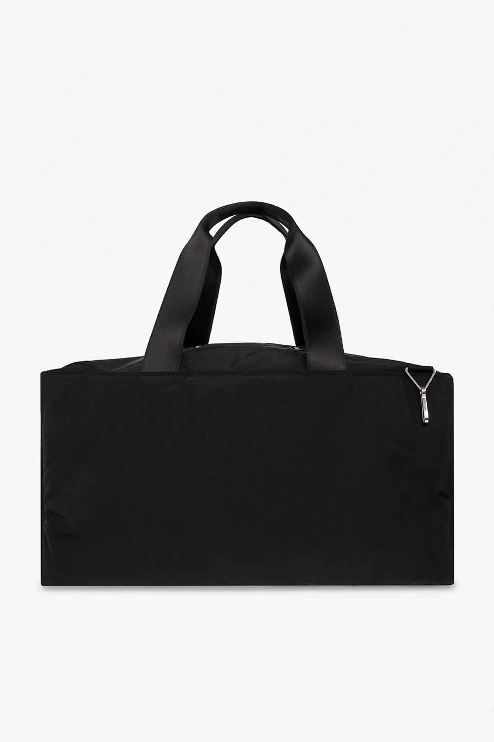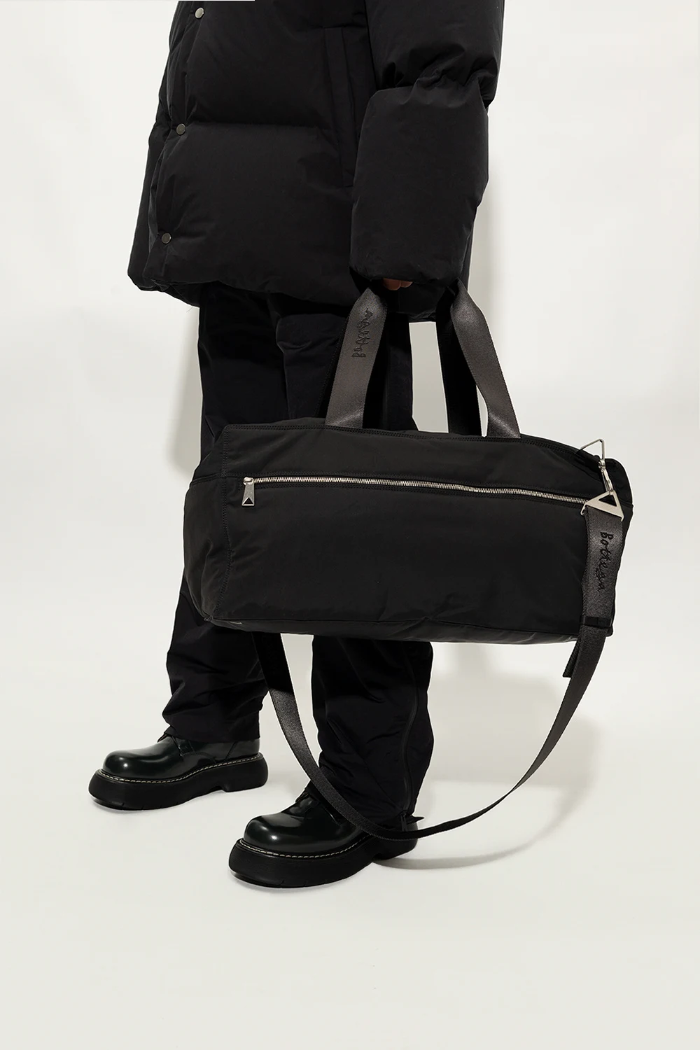 Black duffel bag from Bottega Veneta. Detailed with the brand\'s logo, this design secures with a two-way zipper and snaps and features two half-round handles, a detachable and adjustable shoulder strap, silver-tone metal hardware and one internal compartment with one zip pocket and two slip pockets.