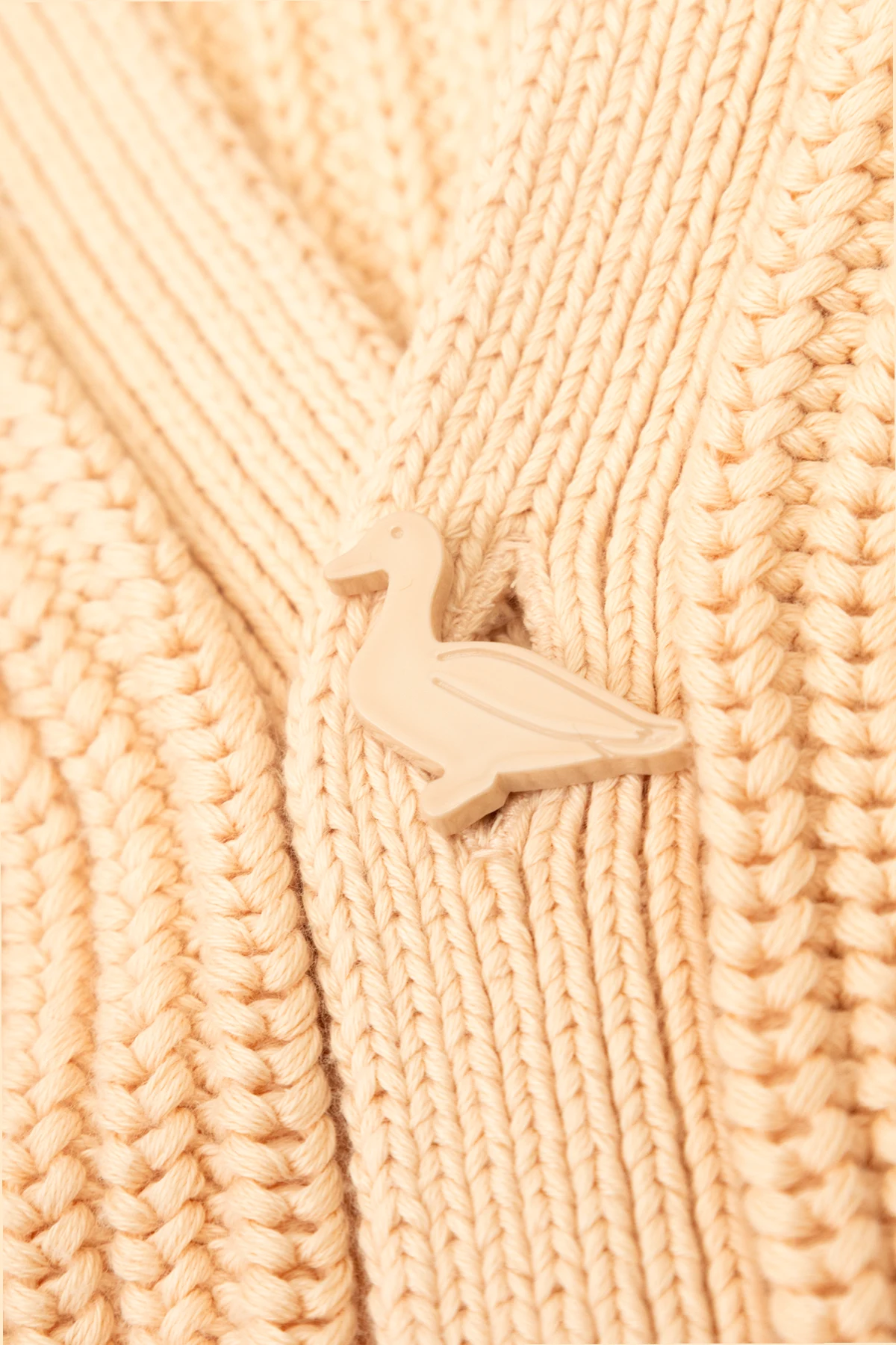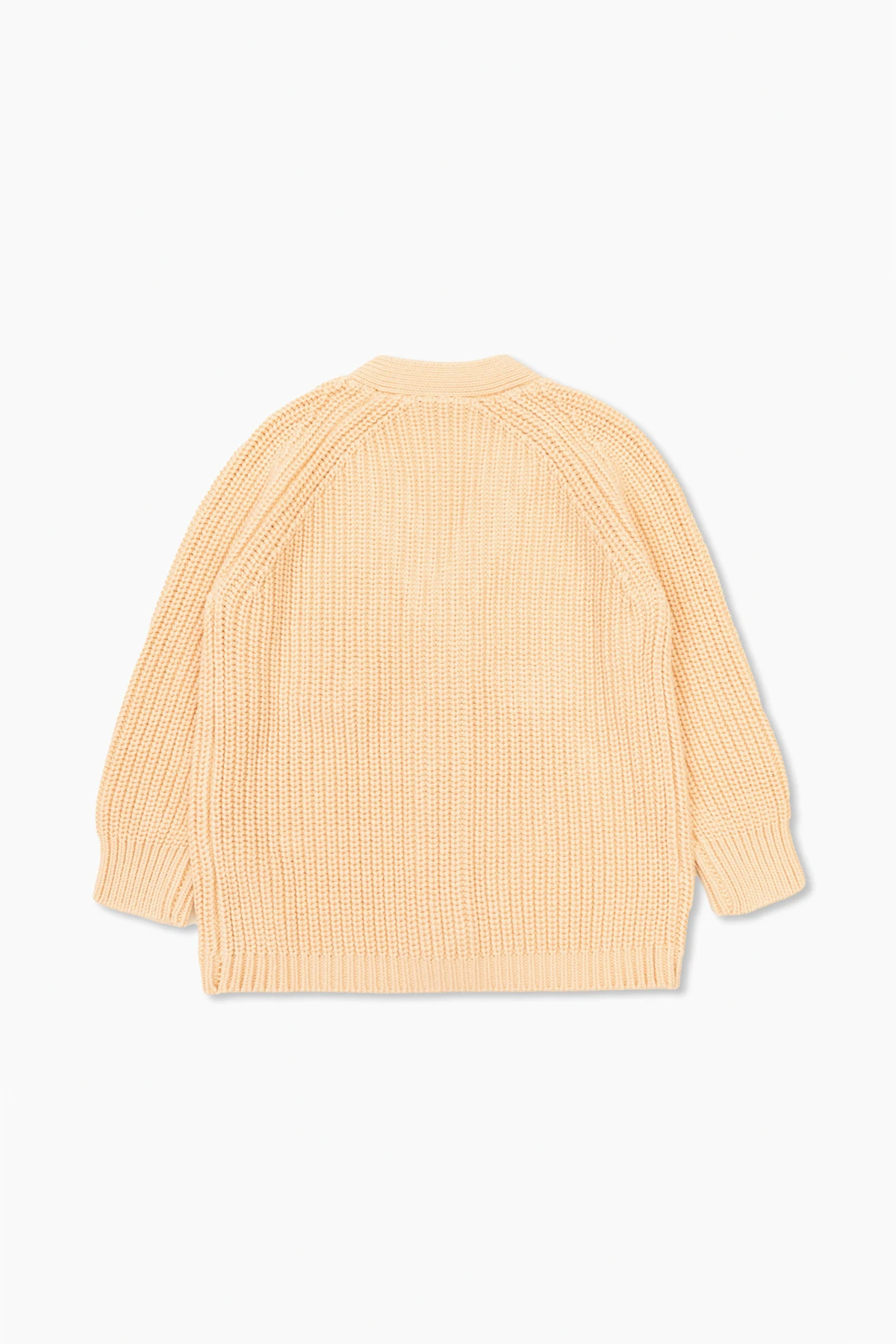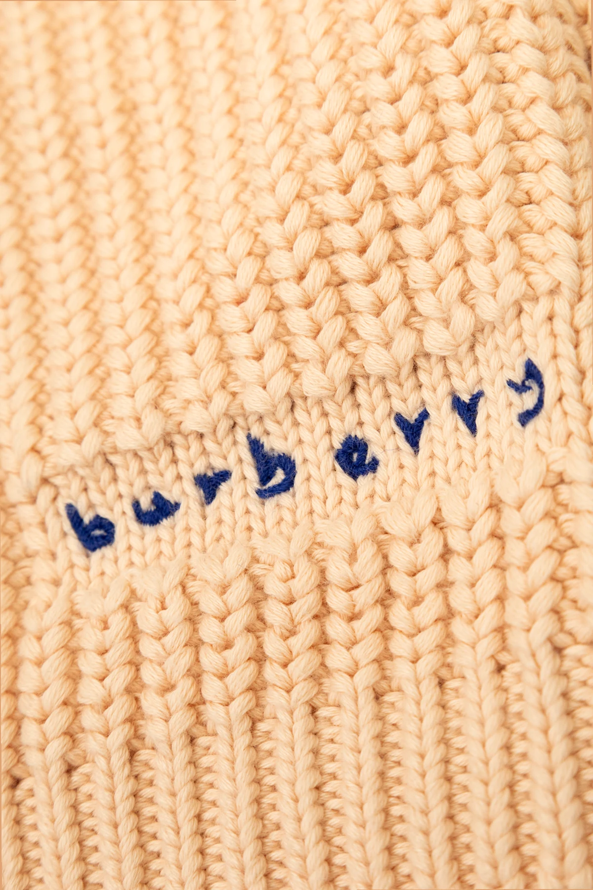 Introducing the epitome of sartorial elegance, the Burberry Kids Pastel Pink Cardigan. This piece captivates at first glance with its soft, pastel pink hue and refined round neckline, embodying the grace of modern luxury. Expertly crafted from 100% premium cotton, this cardigan promises not only unparalleled comfort but a touch of exclusivity with its thick, soft-to-the-touch fabric that hints at the use of natural fibers. The design boasts a hip-length cut complemented by subtly flared sleeves with ribbed cuffs, creating a relaxed yet sophisticated oversized silhouette. Unique to this garment, the front button closure features buttons matched to the fabric\'s color, with one distinct button shaped like a bird, marking the signature of either the Burberry Kids collection or the brand\'s distinctive aesthetic. An eye-catching detail is the brand\'s name, embroidered at the lower part of the cardigan in a contrasting blue thread, asserting the garment\'s luxurious identity. The meticulous, chunky knit pattern further accentuates the cardigan\'s luxurious appeal, making it a quintessential addition to any discerning wardrobe. Why Purchase This Product? Exclusive Design: Features a bird-shaped button, setting it apart as a unique piece of the Burberry Kids collection. High-Quality Material: Made from 100% premium cotton, ensuring both comfort and durability. Signature Branding: Burberry\'s name embroidered in contrasting thread, highlighting the brand\'s prestigious lineage. Luxurious Comfort: Thick, soft fabric and a relaxed, oversized fit offer unparalleled comfort without sacrificing style.
