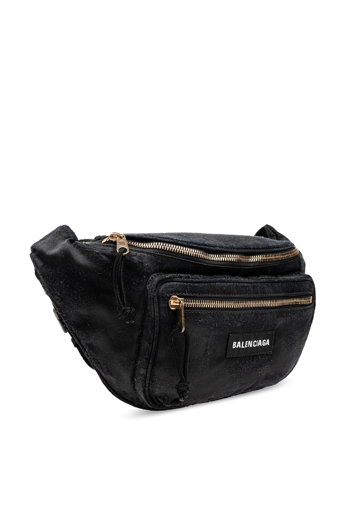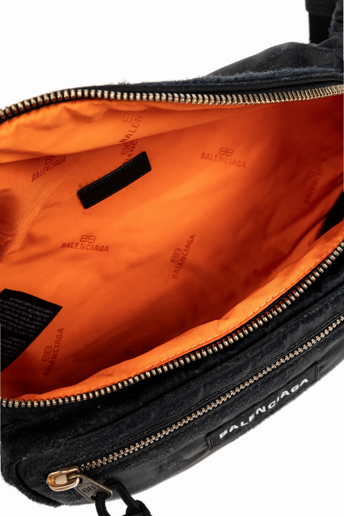 Introducing the Explorer Belt Bag by the illustrious Balenciaga, a paragon of luxury and functionality seamlessly blended into a single accessory. This exclusive piece boasts an oval silhouette crafted with a lush, velvety material, rendering a tactile experience as sophisticated as its aesthetic. The black hue of the bag is accentuated by a striking gold zipper on the front, marrying elegance with ease of access to the main compartment. The distinctive \"BALENCIAGA\" inscription prominently adorns the front panel, signaling the distinguished origin from the haute couture designer. An unexpected twist lies within—the interior reveals a vibrant orange lining, creating a visual intrigue while housing a branded label, affirming its authenticity and premium lineage. Enhancing its practicality, the bag features two external zippered pockets, offering convenient storage for essentials. Coupled with an adjustable strap, this piece affords versatility in wear, allowing for custom fit around the waist or over the shoulder. Made primarily from a sophisticated blend of polyamide and polyester, the Explorer Belt Bag stands as a testament to Balenciaga\'s commitment to quality and innovative design, making it an indispensable addition to the discerning collector\'s repertoire. Why invest in this product? Luxurious, velvety material with gold zipper detail exudes elegance. Iconic branding and vibrant interior lining offer a unique aesthetic appeal. Functional design with multiple pockets and adjustable strap enhances versatility. Exclusivity guaranteed by the renowned high-fashion house of Balenciaga.