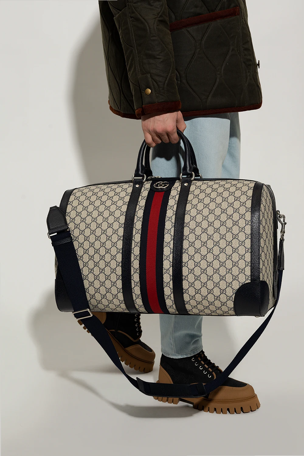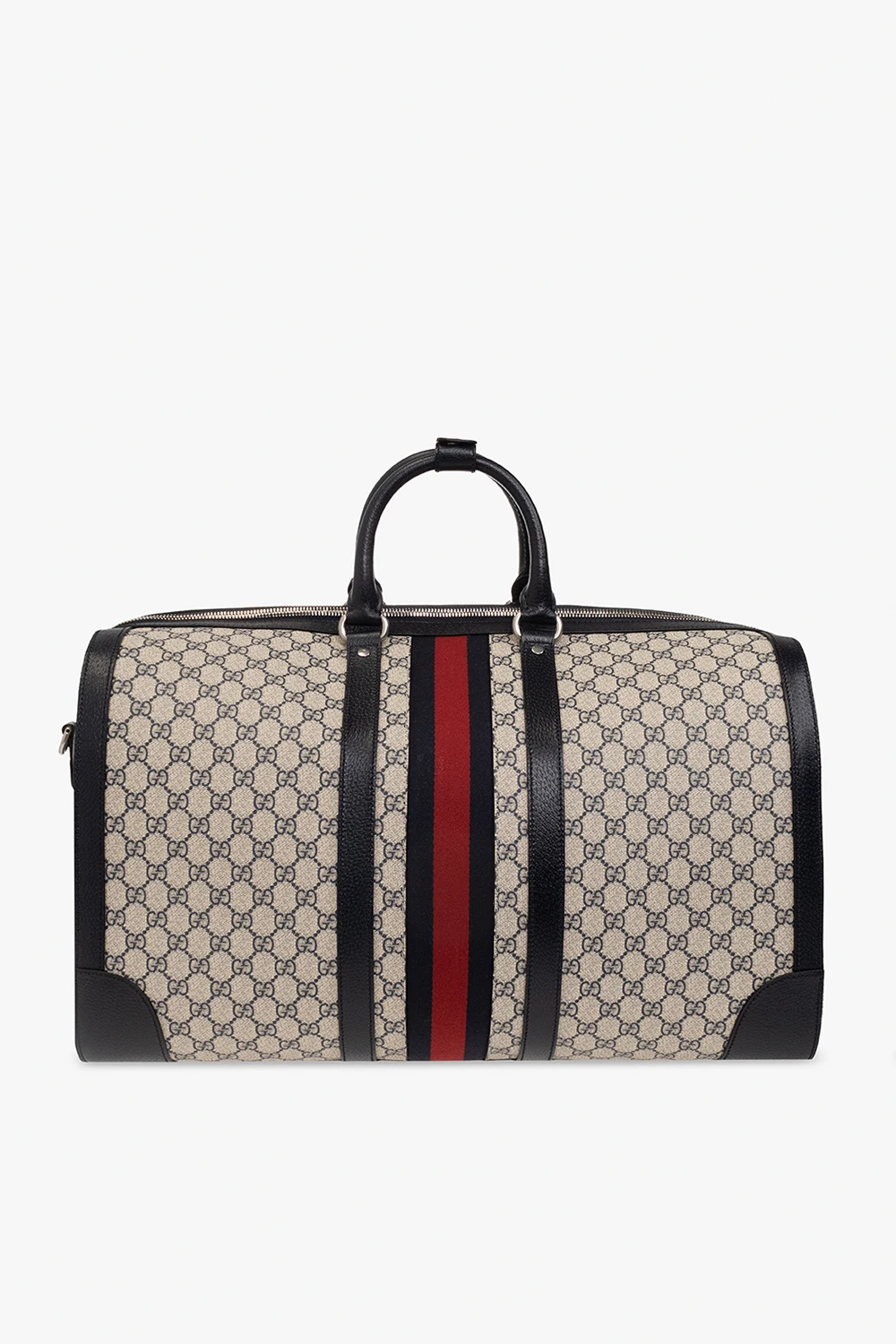 Cream and navy blue ‘Ophidia Large’ duffel bag from Gucci, the ‘Gucci Savoy’ line. Crafted in the brand\'s ‘GG Supreme’ canvas and trimmed with calf leather, this design features a two-way zip fastening, navy blue-red-navy blue ‘Web’ detailing, ‘Double G’ logo hardware, two half-round handles with snap-fastened belt handle shapers, a detachable and adjustable shoulder strap, silver-tone metal elements and one internal compartment with two zip pockets. Comes with a padlock, a detachable identification tag and a key holder.