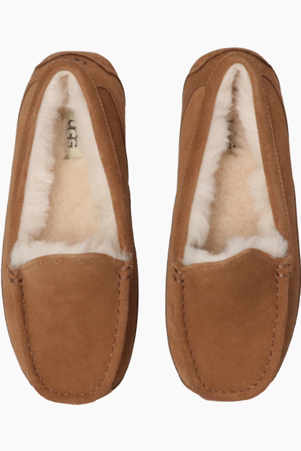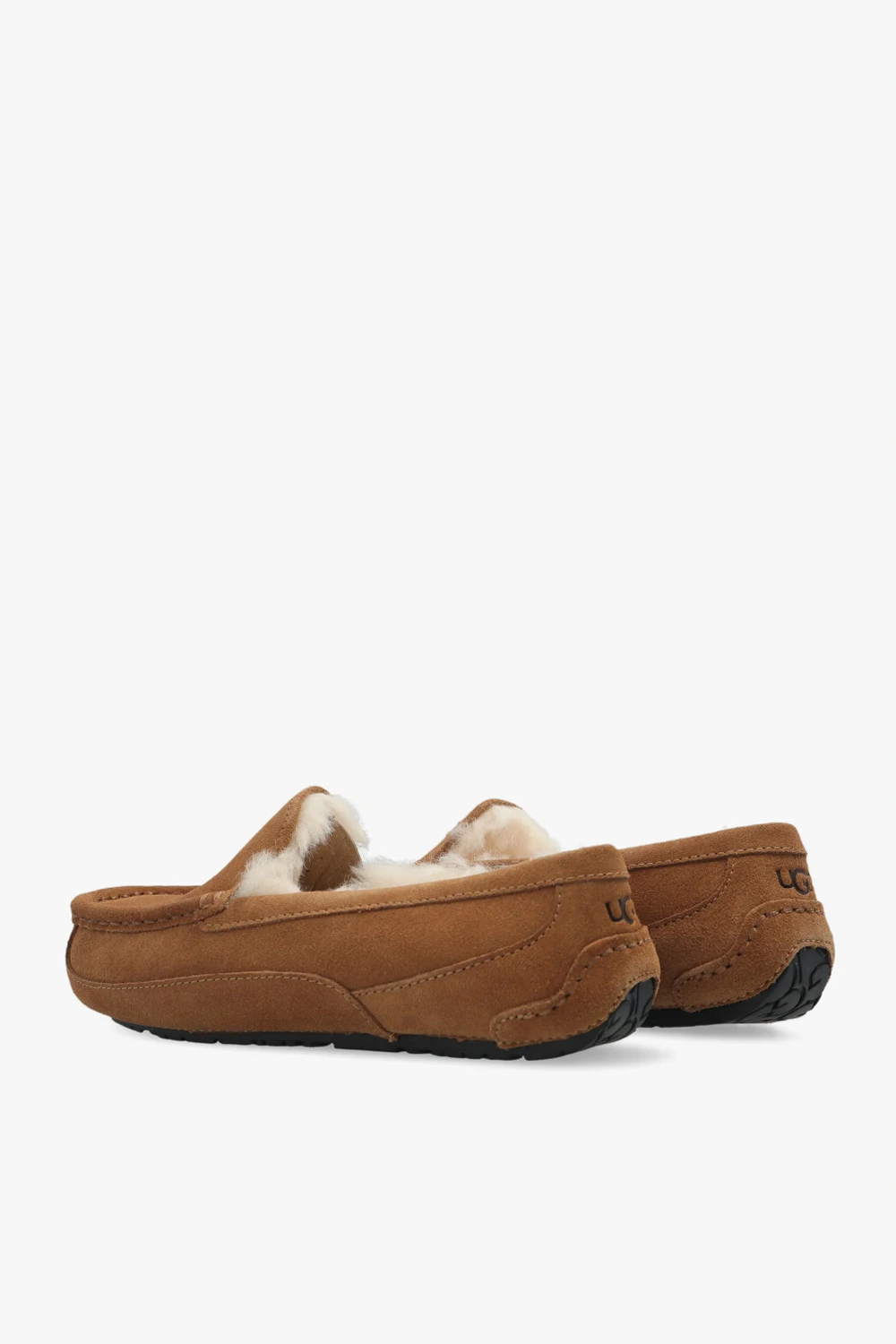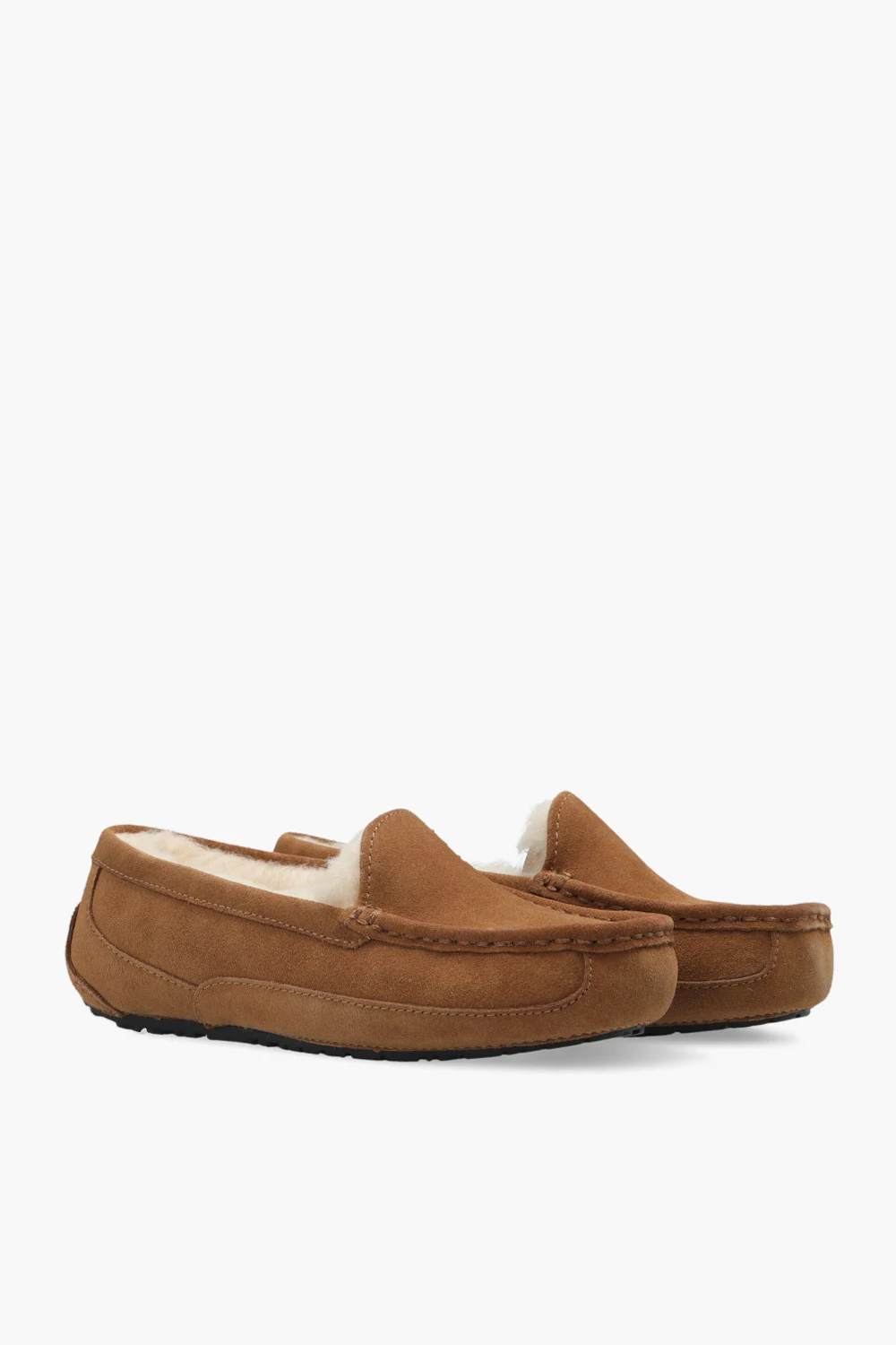 Brown ‘K Ascot’ shoes from UGG Kids. Crafted from soft suede, this model features an embossed logo at the back, decorative stitching details, a white lambswool lining and a molded rubber outsole for indoor-outdoor versatility.