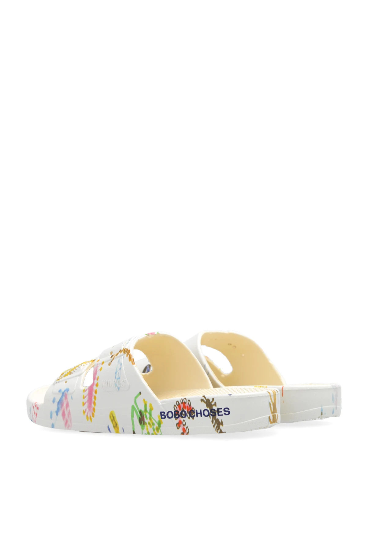 Cream slides from Bobo Choses x Confetti Freedom Moses. Made of rubber, this model showcases a decorative, colourful graphic print.