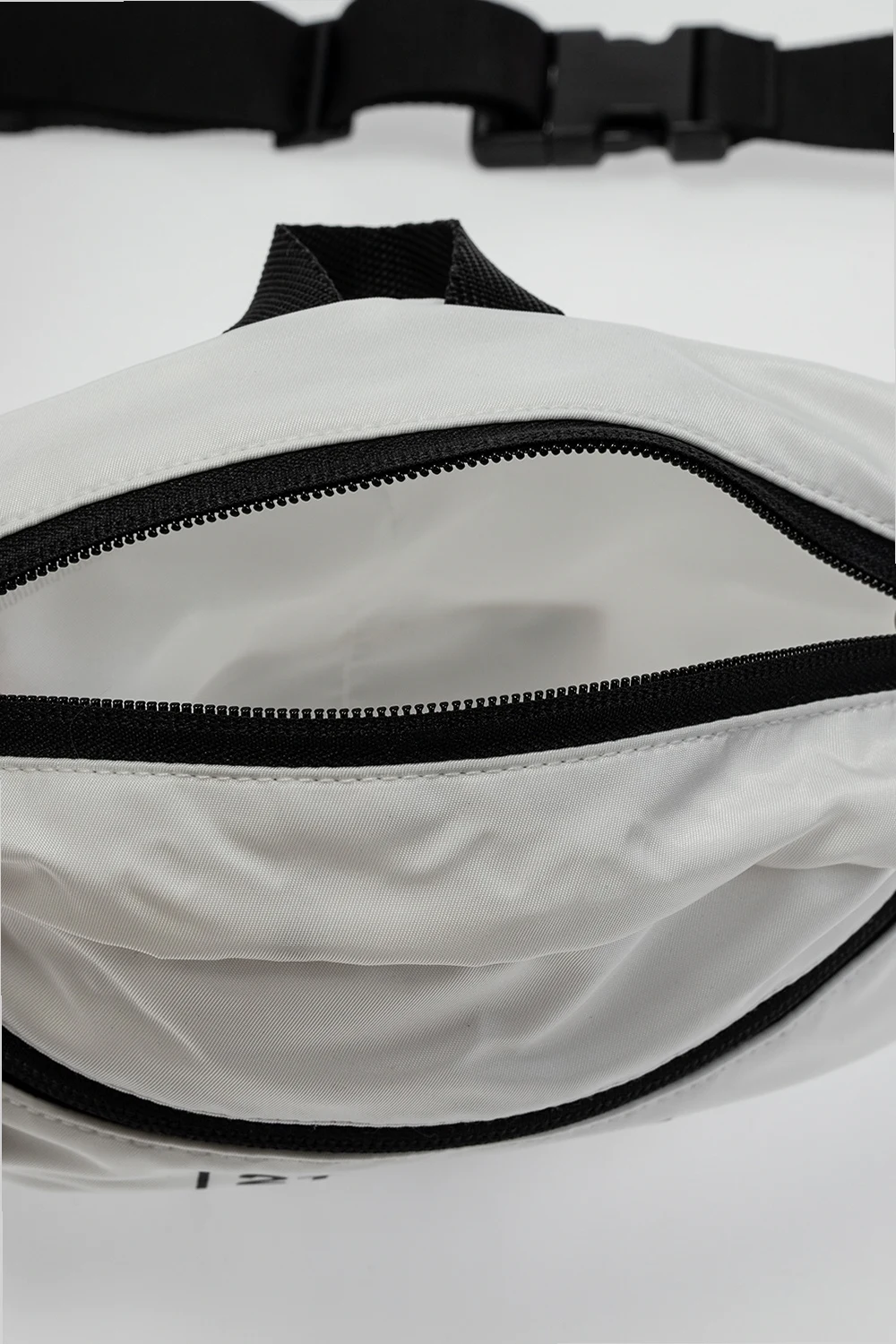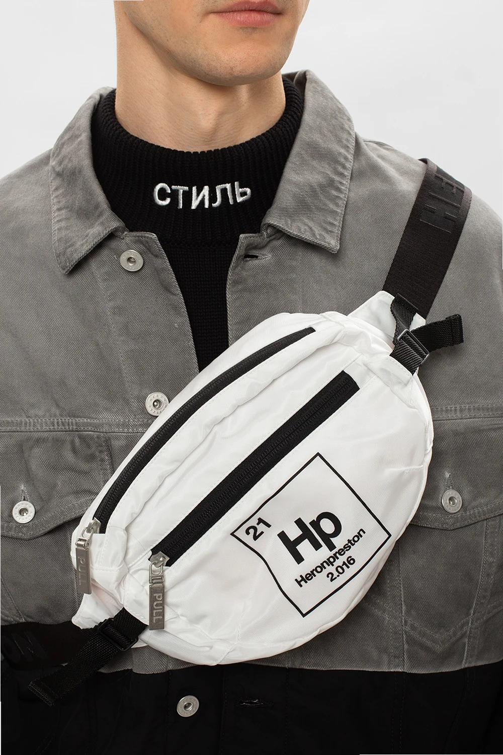 White belt bag from Heron Preston. Fastened with a zip, this design features a black logo print, orange and black sewn-on appliqué, front zip pocket, adjustable logo-embroidered belt as well as one internal compartment with two slip pockets.