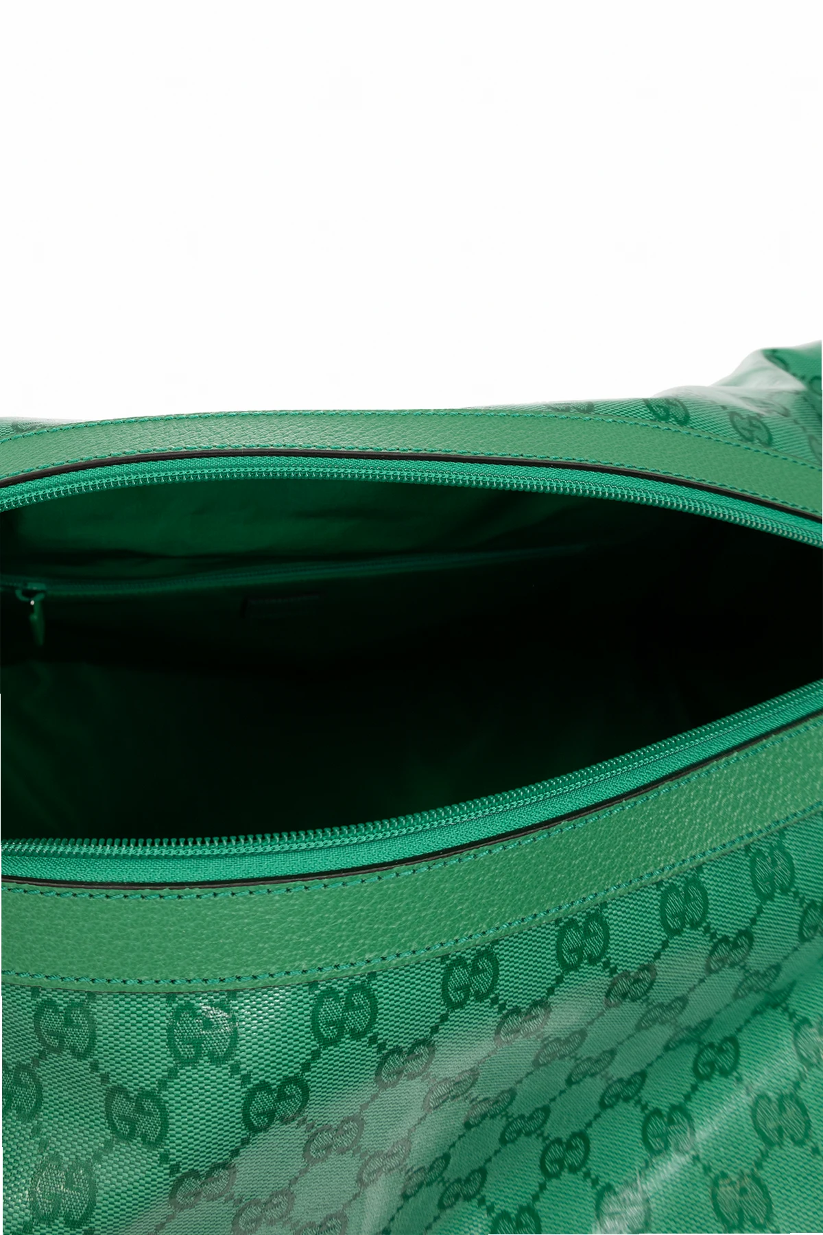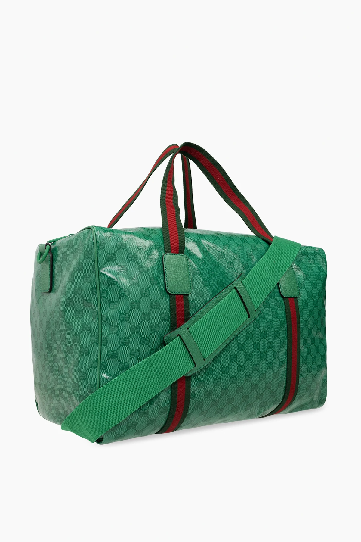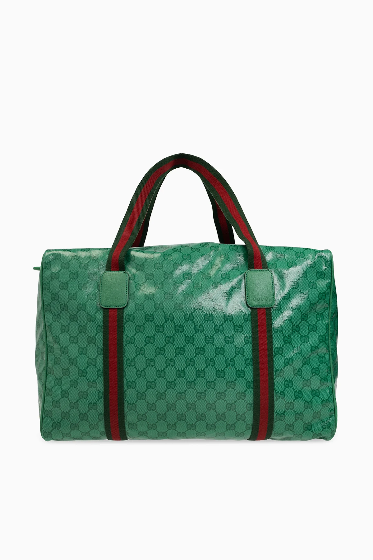 Green holdall bag from Gucci. Made of ‘GG Crystal’ canvas trimmed with leather, this design features a zip fastening, the brand\'s signature green-red-green ‘Web’ stripe, embossed logo, two half-round handles, detachable, adjustable strap and one internal compartment with one zip pocket.