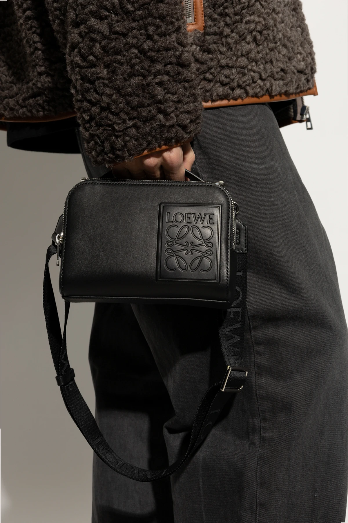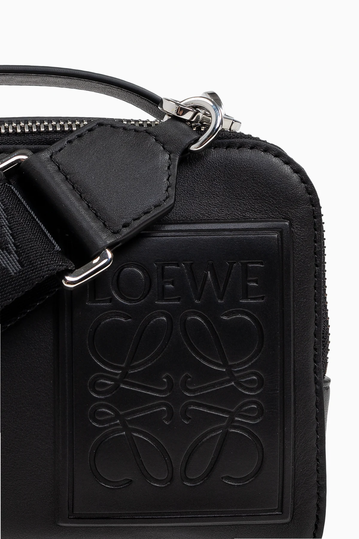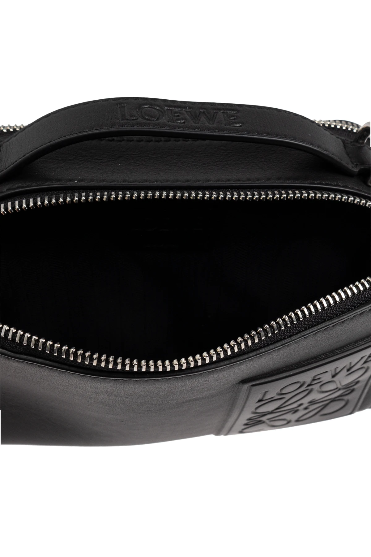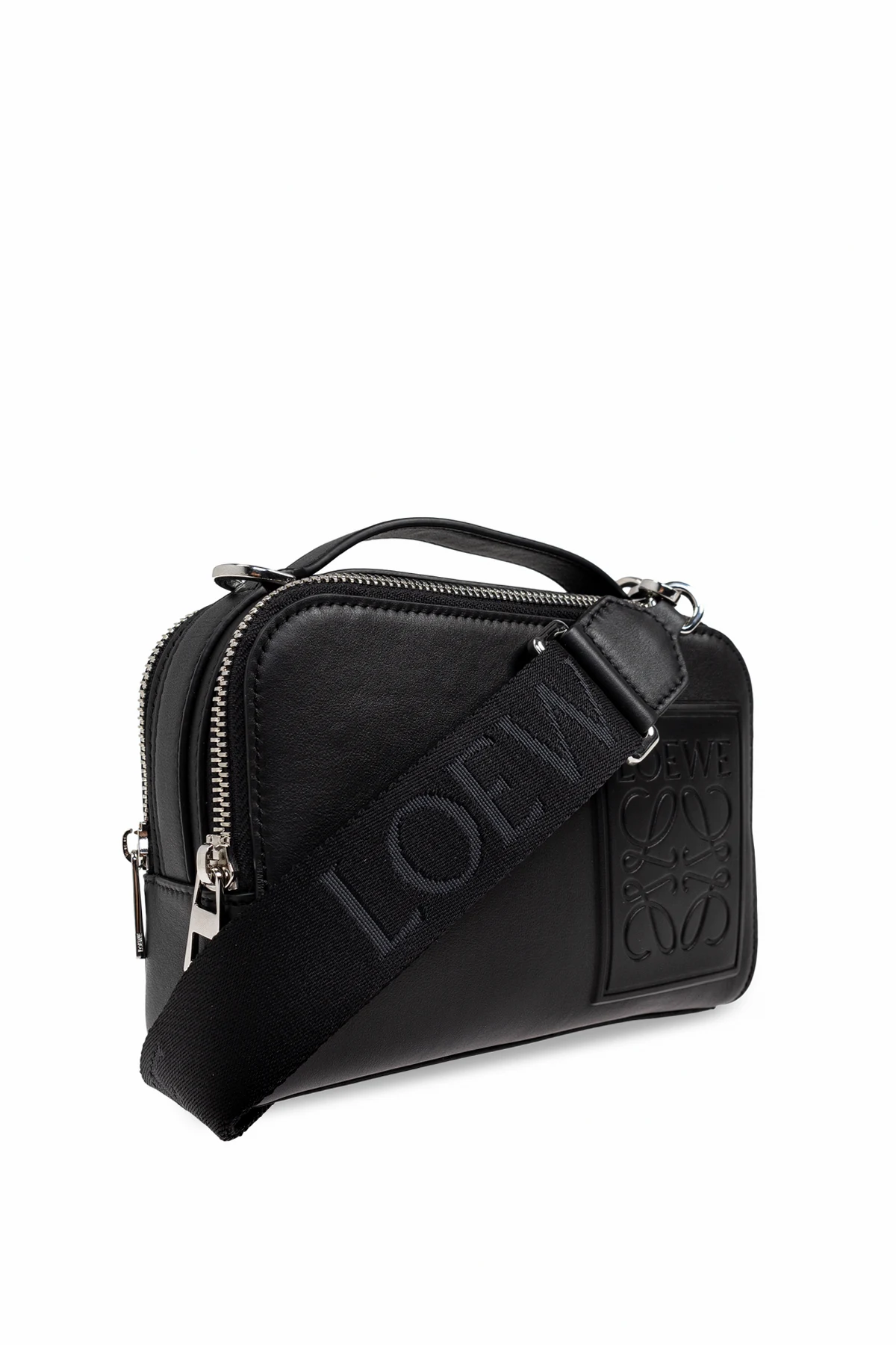 Introducing the exquisite Handbag by Loewe, an epitome of sophistication and timeless elegance. Crafted from the finest quality leather, this black handbag embodies a sleek rectangular form with gracefully rounded edges. The embossed Loewe logo on the front exudes a subtle yet distinctive charm. Equipped with a sturdy zipper and a shoulder strap embellished with the \"LOEWE\" inscription, it offers versatile carrying options. The strap appears adjustable, enhancing its functionality. Inside, the bag reveals a spacious interior, complemented by additional compartments for exceptional organization. The top handle subtly bears the brand\'s mark, adding to its refined appeal. Embracing a minimalist, modern aesthetic, this handbag seamlessly integrates into both everyday and sophisticated ensembles. Why Purchase This Product? High-quality leather construction for durability and elegance. Embossed logo adds a touch of distinctive sophistication. Adjustable shoulder strap for versatile carrying options. Spacious interior with additional zippered compartments for organization. A perfect balance of tradition and modernity, characteristic of Loewe\'s rich heritage.