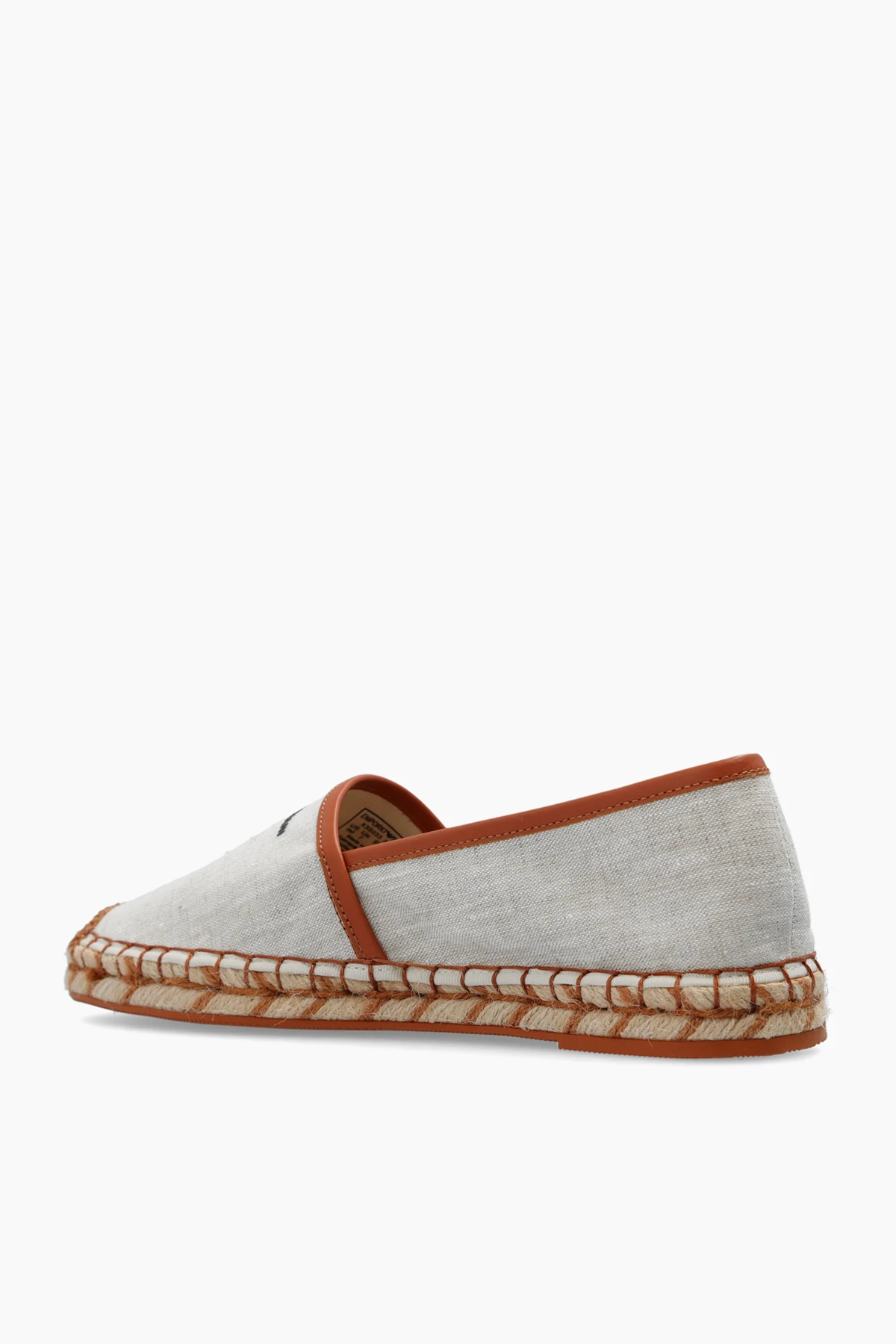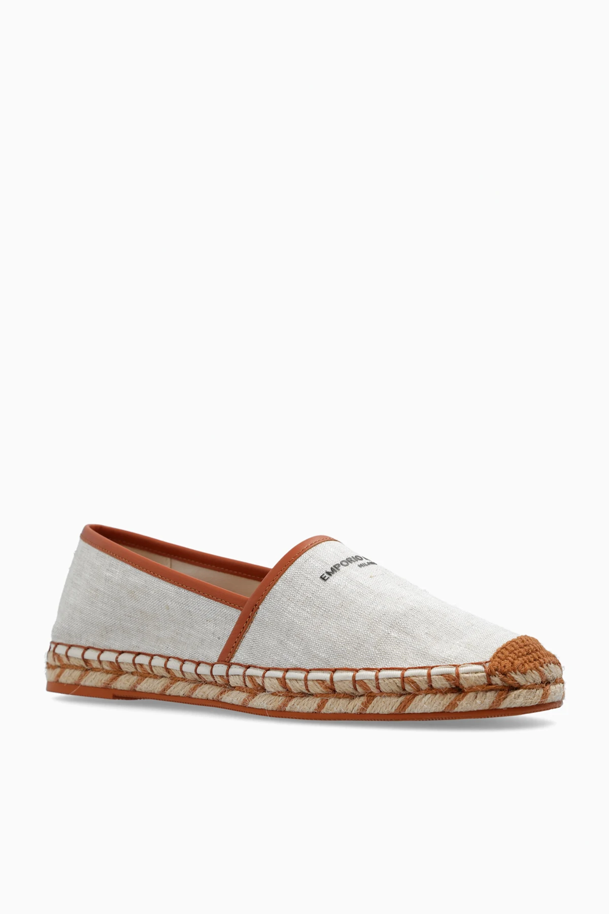 Beige and brown espadrilles from Emporio Armani. Made from cotton finished with leather, this model sits on a woven jute sole with brown rubber trim and showcases a round toe and a black logo on the front.