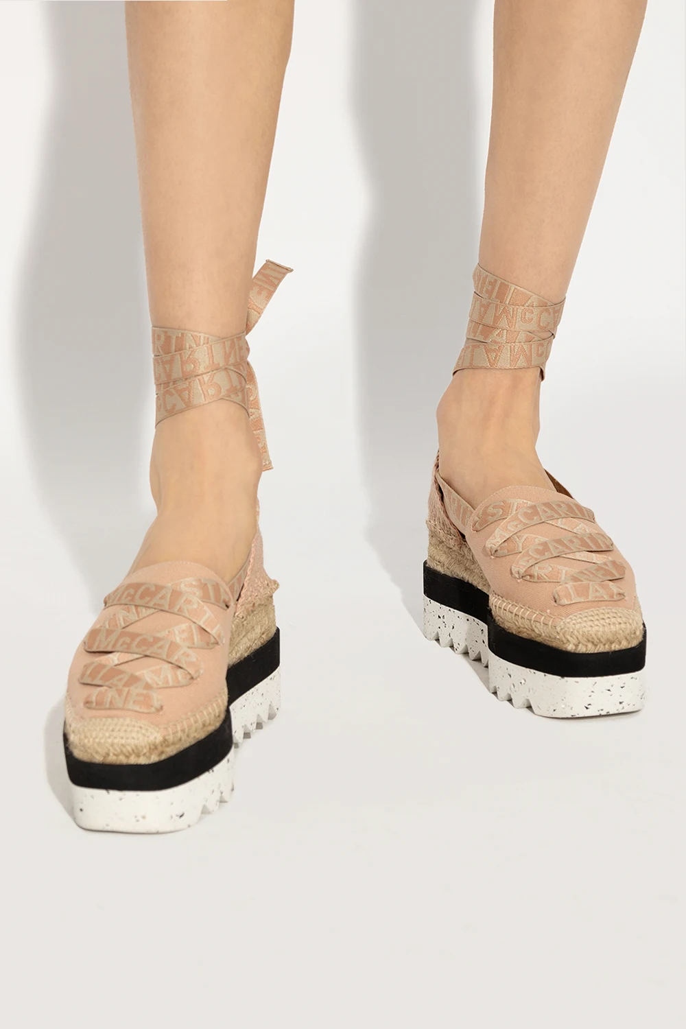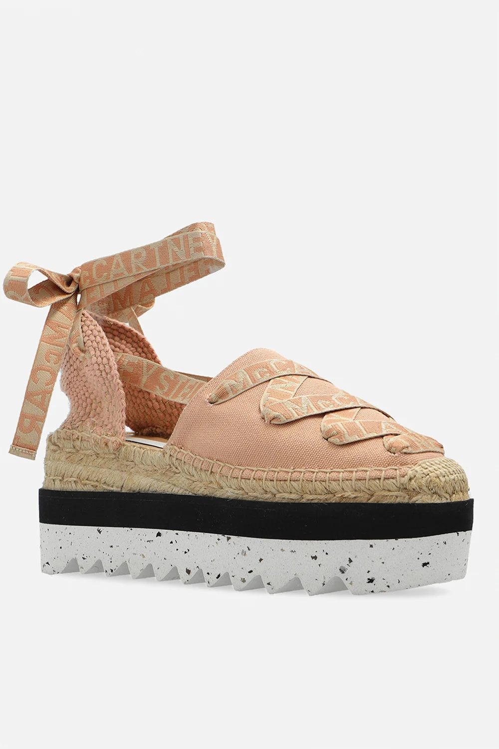 Blush pink ‘Gaia’ platform espadrilles from Stella McCartney. Crafted from canvas, this model showcases the brand\'s logo, lace-up fastenings, a woven heel counter and a beige, black and white sole made of jute and rubber.