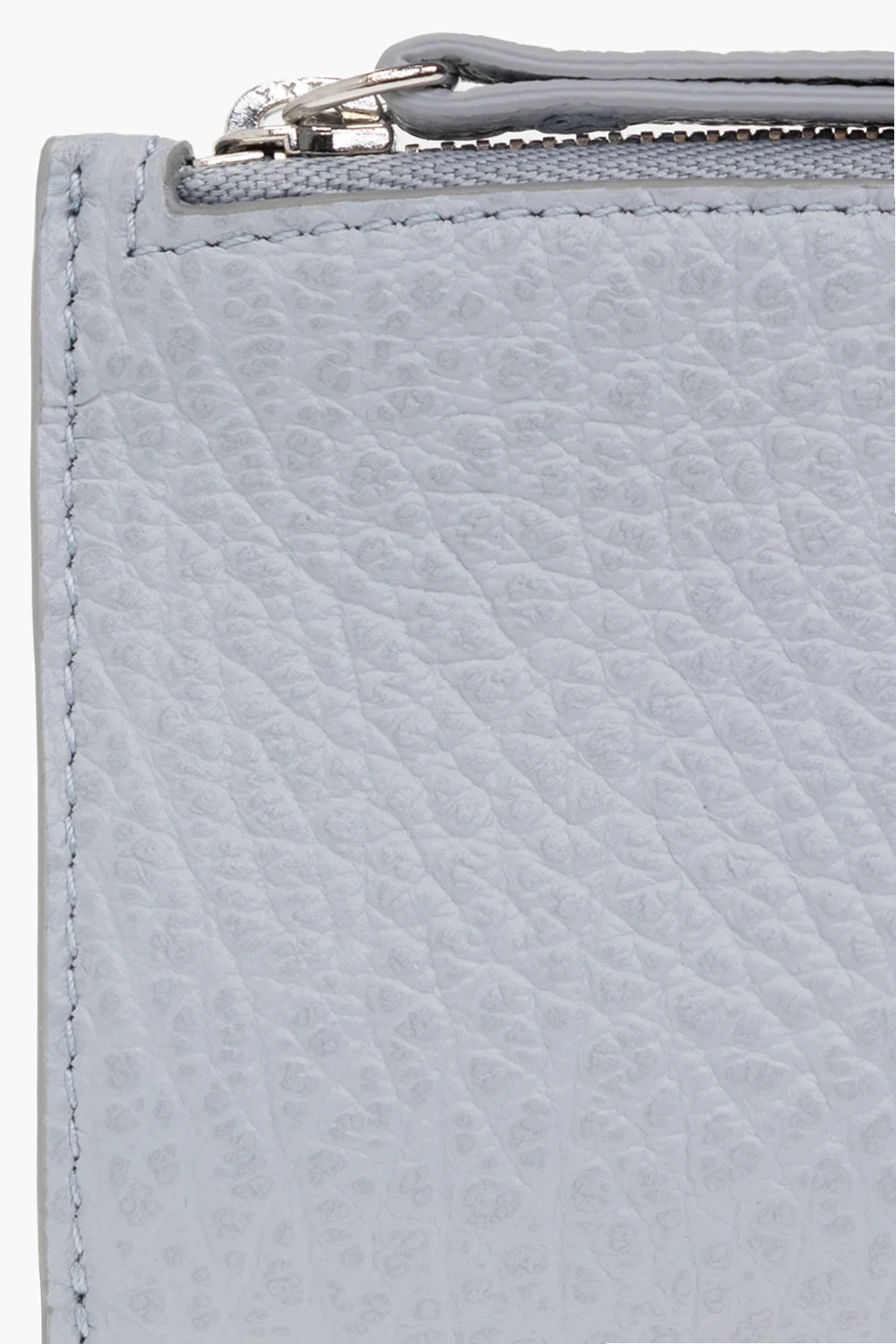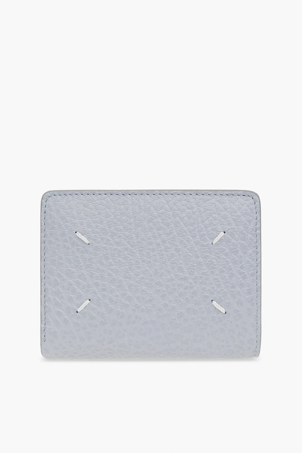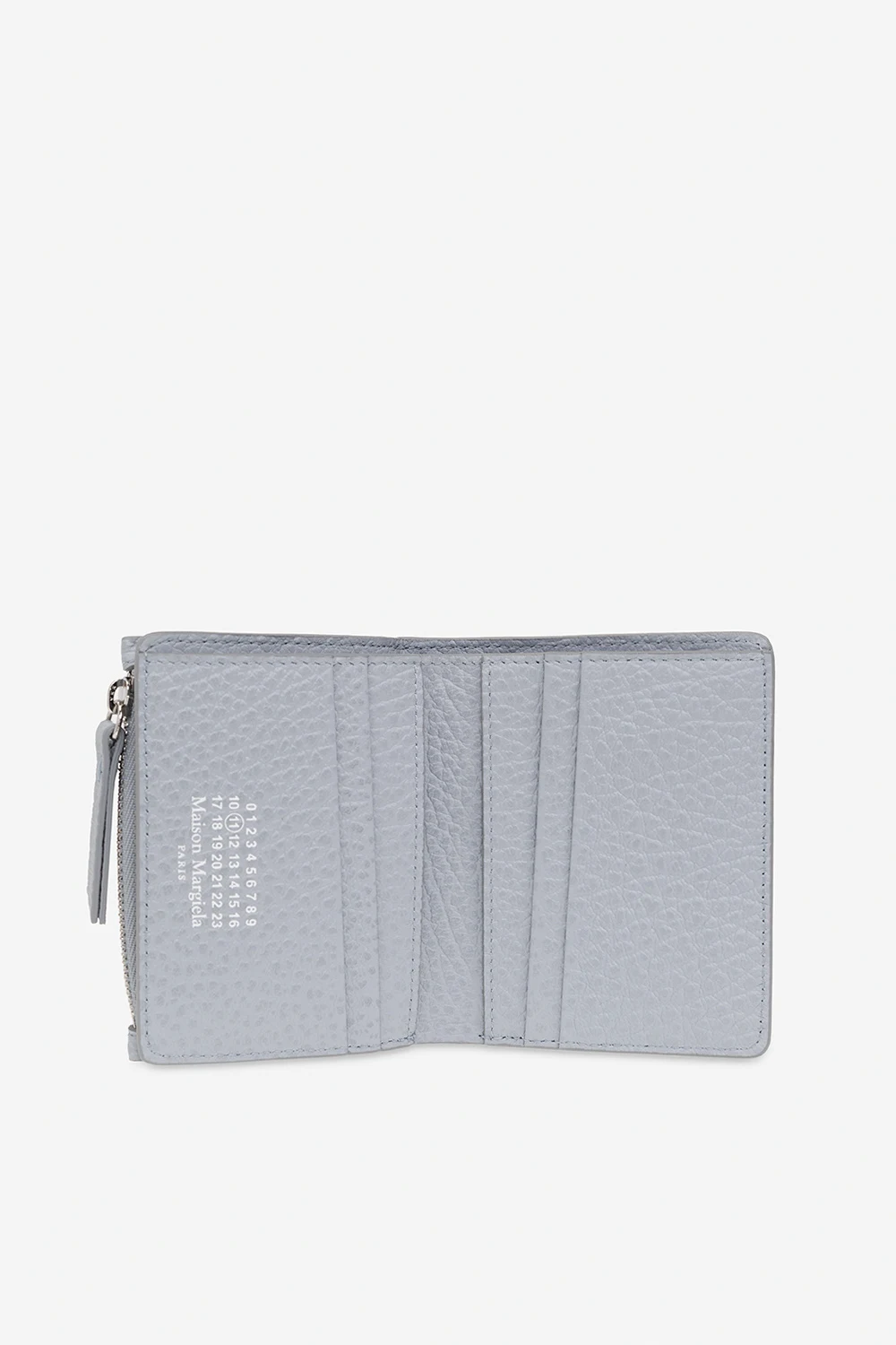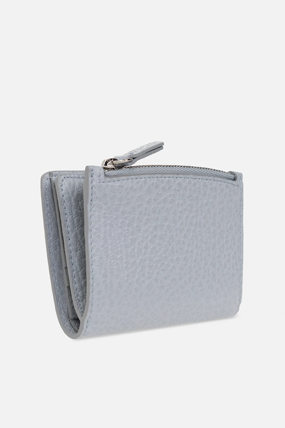 Blue and grey bifold wallet from Maison Margiela. Made of grained leather, this item features the brand’s signature seams in white, zipped coin pocket as well as a bill compartment and six card slots inside.