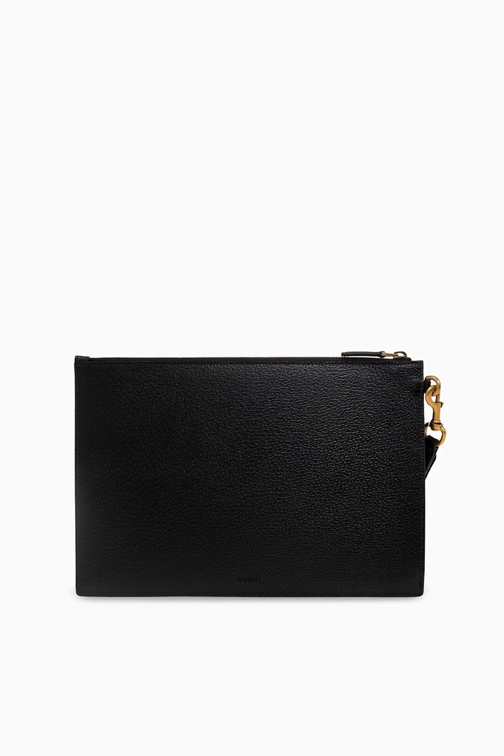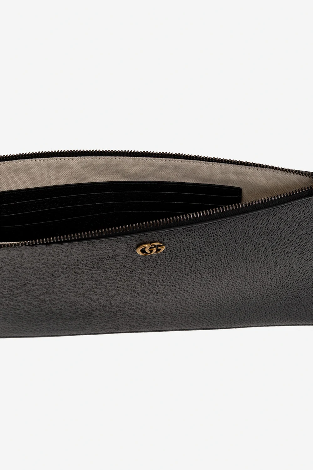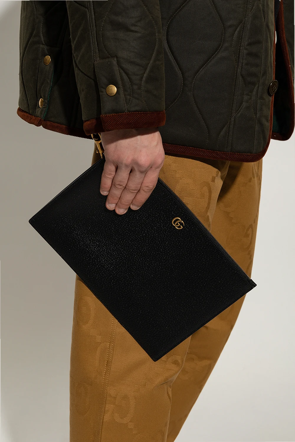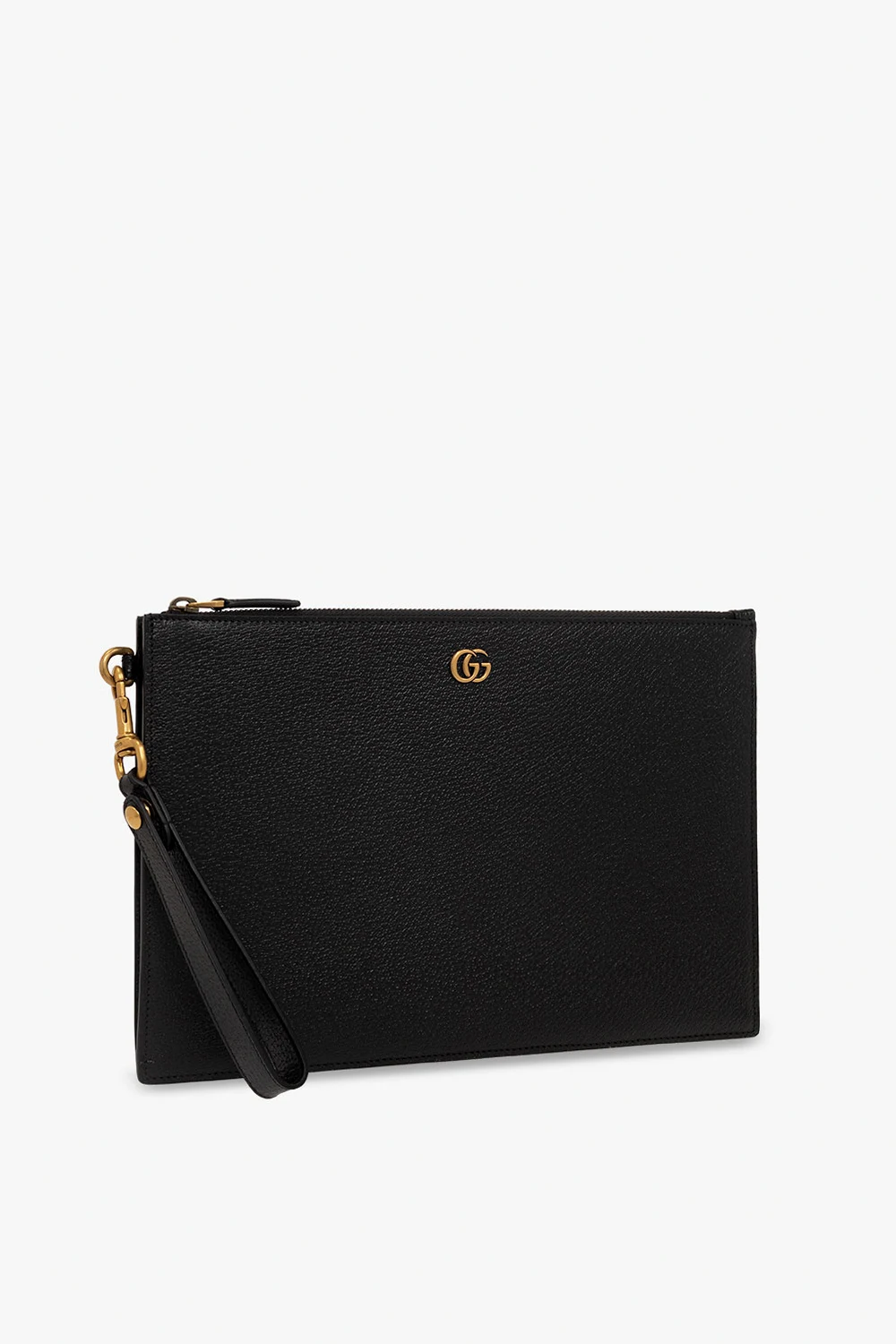 Black ‘GG Marmont’ handbag from Gucci. Crafted from calf leather, this design features a zip fastening, ‘Double G’ hardware on the front, a detachable wrist strap, antiqued gold-tone metal elements and one slip pocket and six card slots inside.