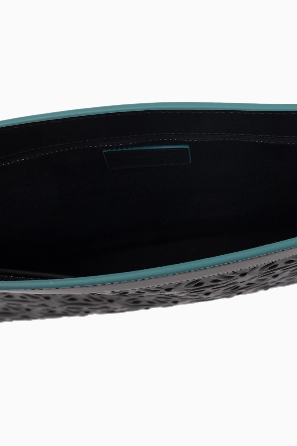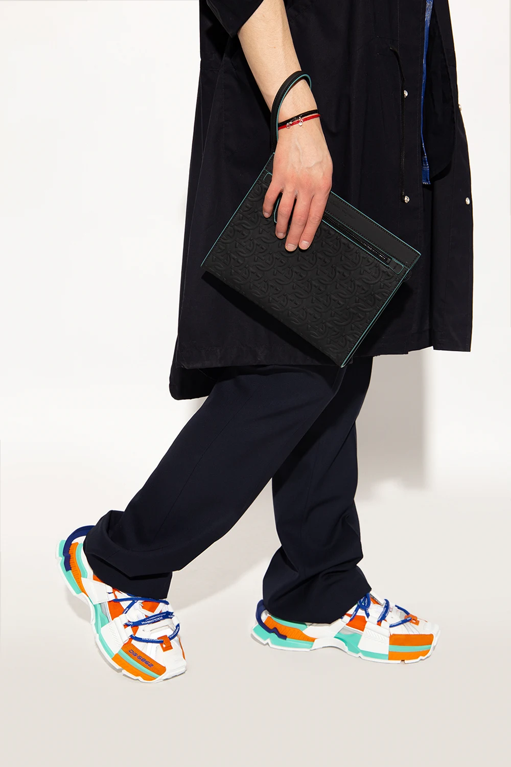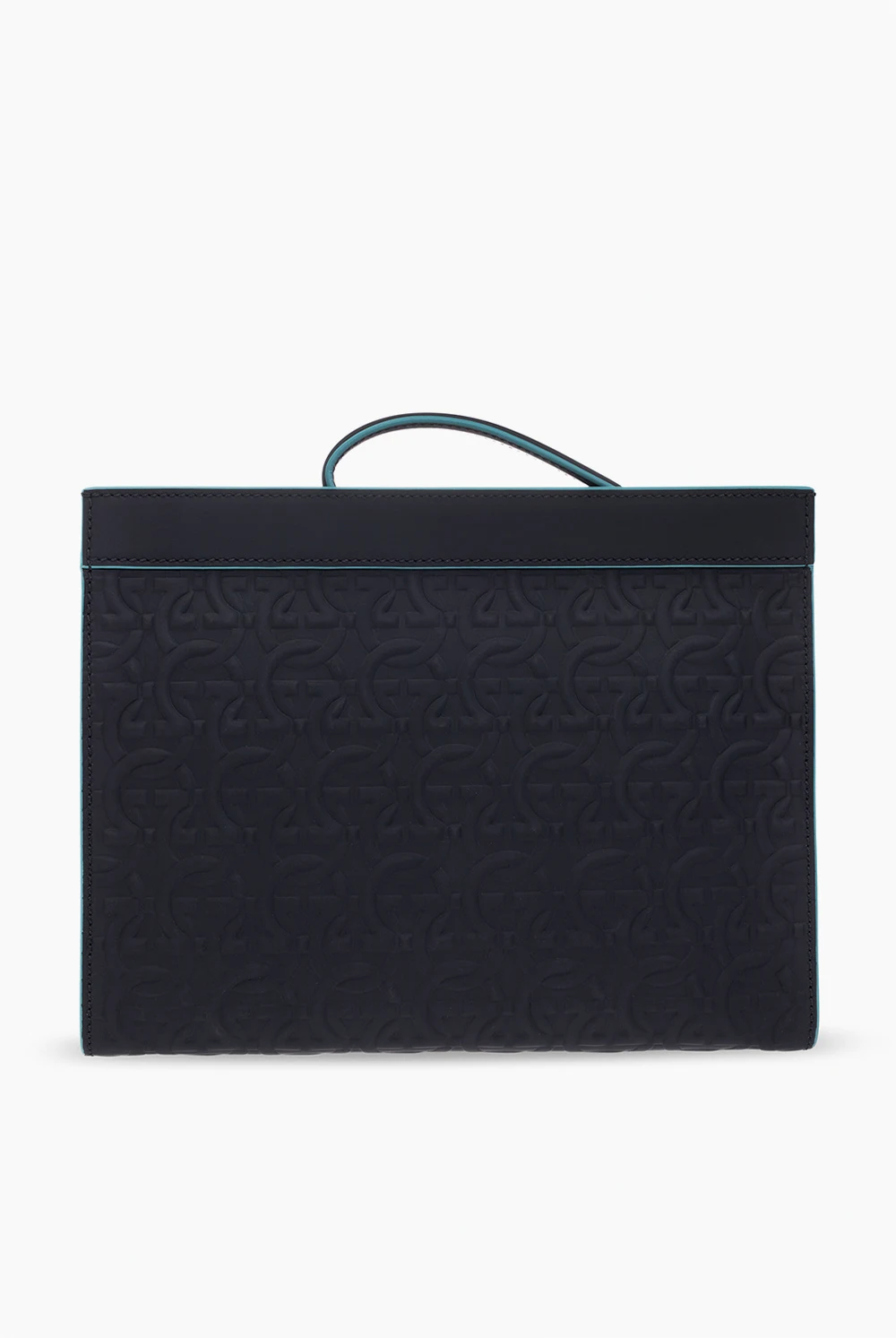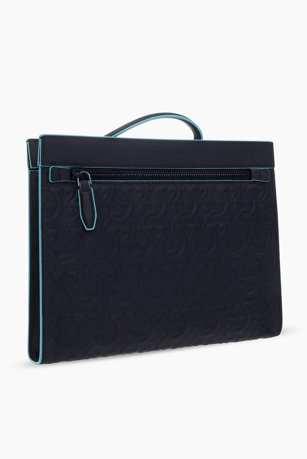 Black handbag from Salvatore Ferragamo. Trimmed with leather, this design features a zip fastening with a wrist strap, the brand\'s signature Gancini detailing, a zip pocket on the front and one internal compartment with a two slip pockets.